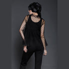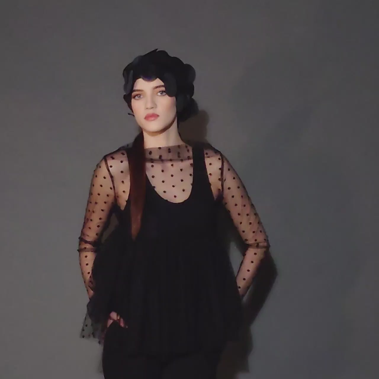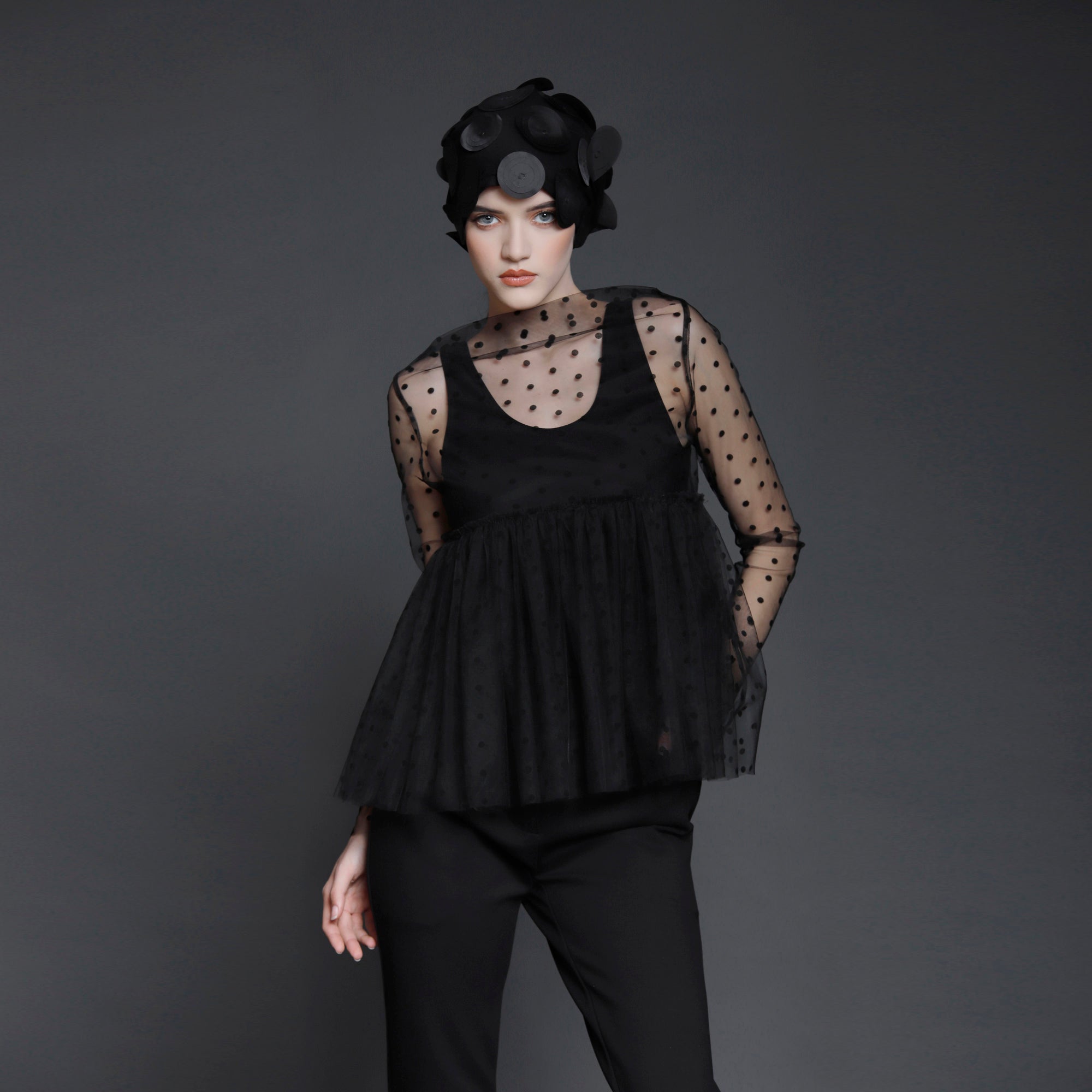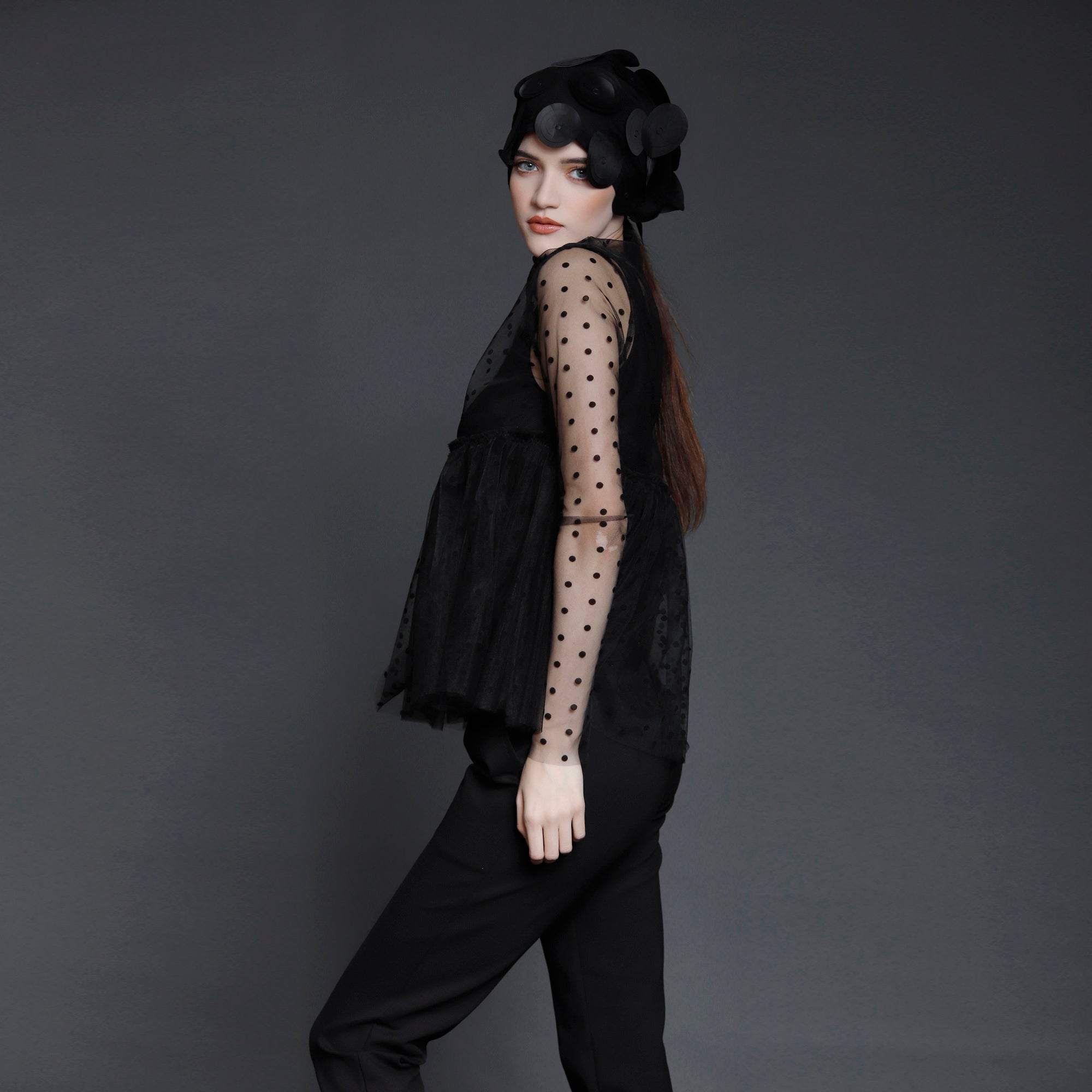 The polka-dot tulle blouse reinterprets classic elegance with a dramatic and bold vision. The boat neckline, subtle and refined, contrasts perfectly with the wide ruffle. The sheer polka-dot fabric creates an enigmatic play and speaks of a woman who gracefully embraces the attention she receives. It pairs beautifully with pants and the Black Jersey Tailcoat, redefining femininity in an original way.