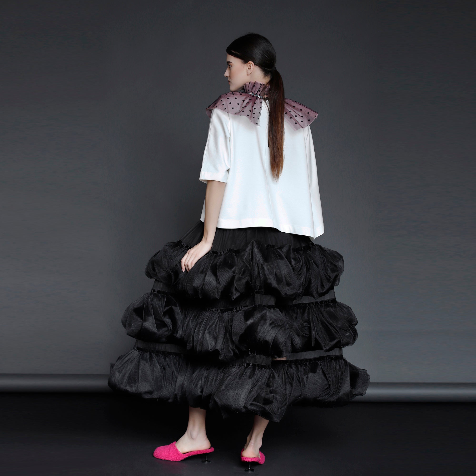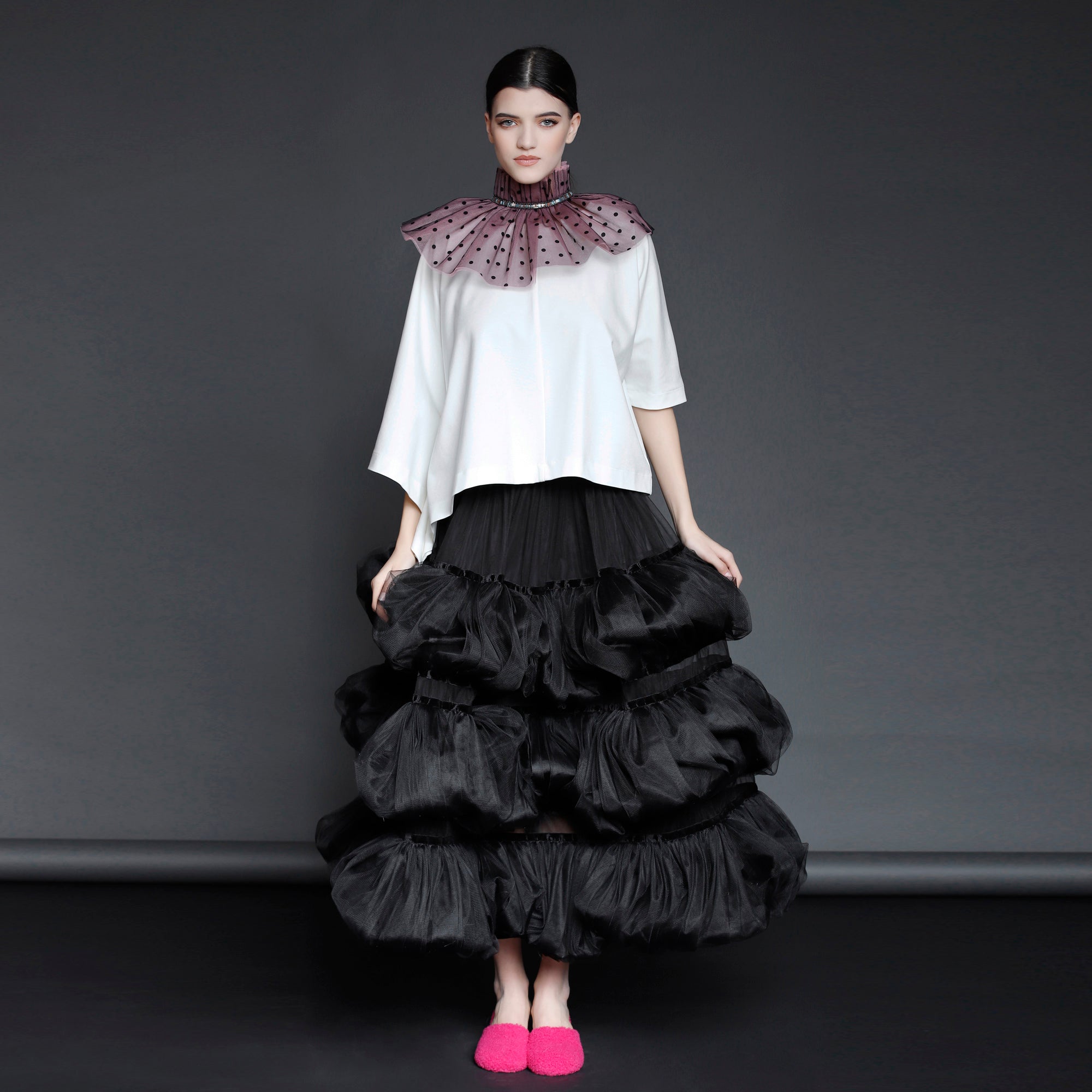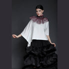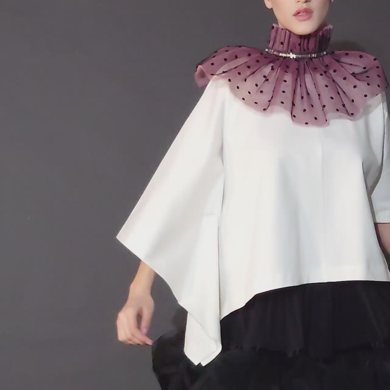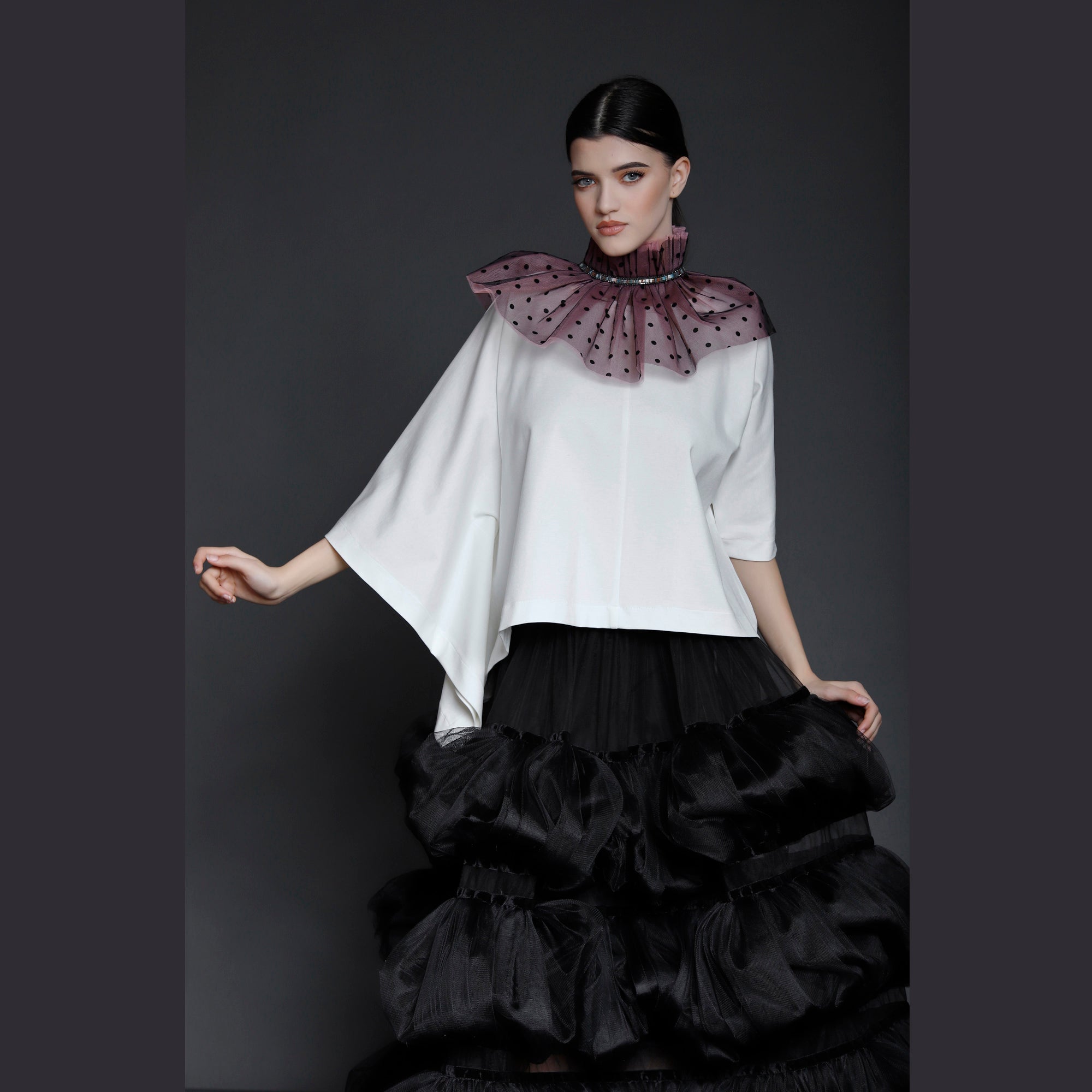 The only difference between this blouse and the Long Asymmetric Cape-Blouse is that its length stops just below the waist, making it suitable for wearing with looser cuts or for highlighting the silhouette.