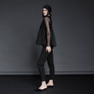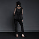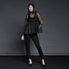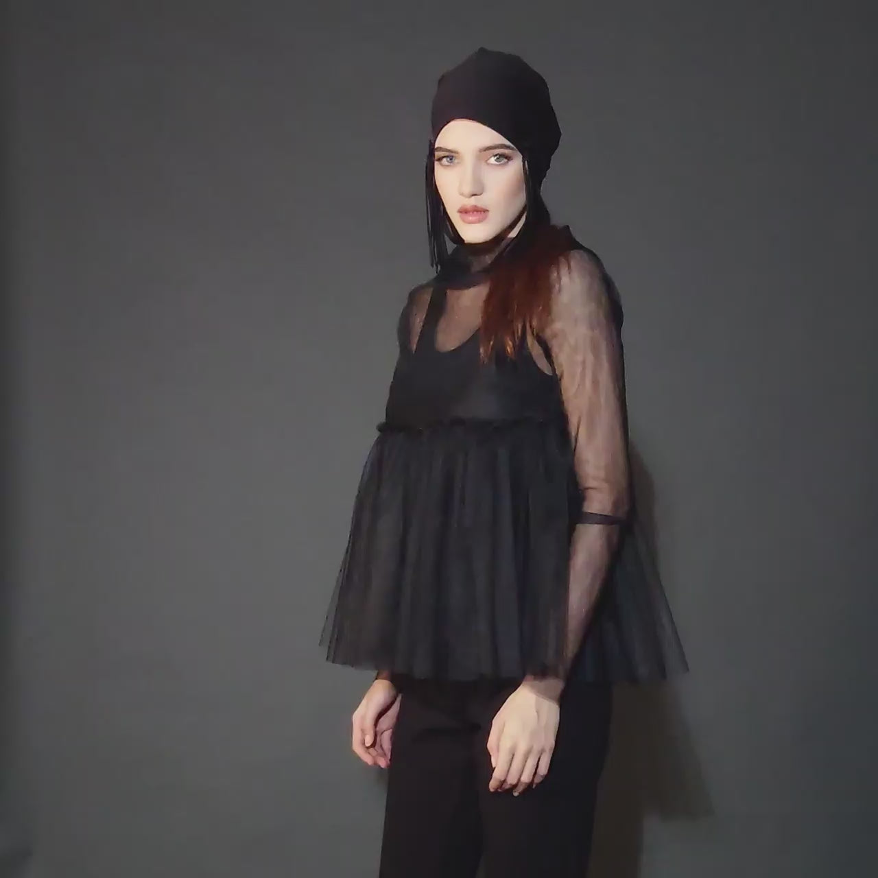 The blouse is crafted from two layers of flexible tulle, conveying a strong message of self-confidence and refinement. The boat neckline, subtle and balanced, contrasts perfectly with the large ruffle, adding an air of mystery and subtle seduction. It speaks of a woman aware of the impact of her fashion choices, gracefully embracing the attention she receives.