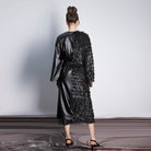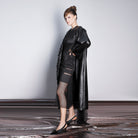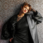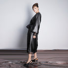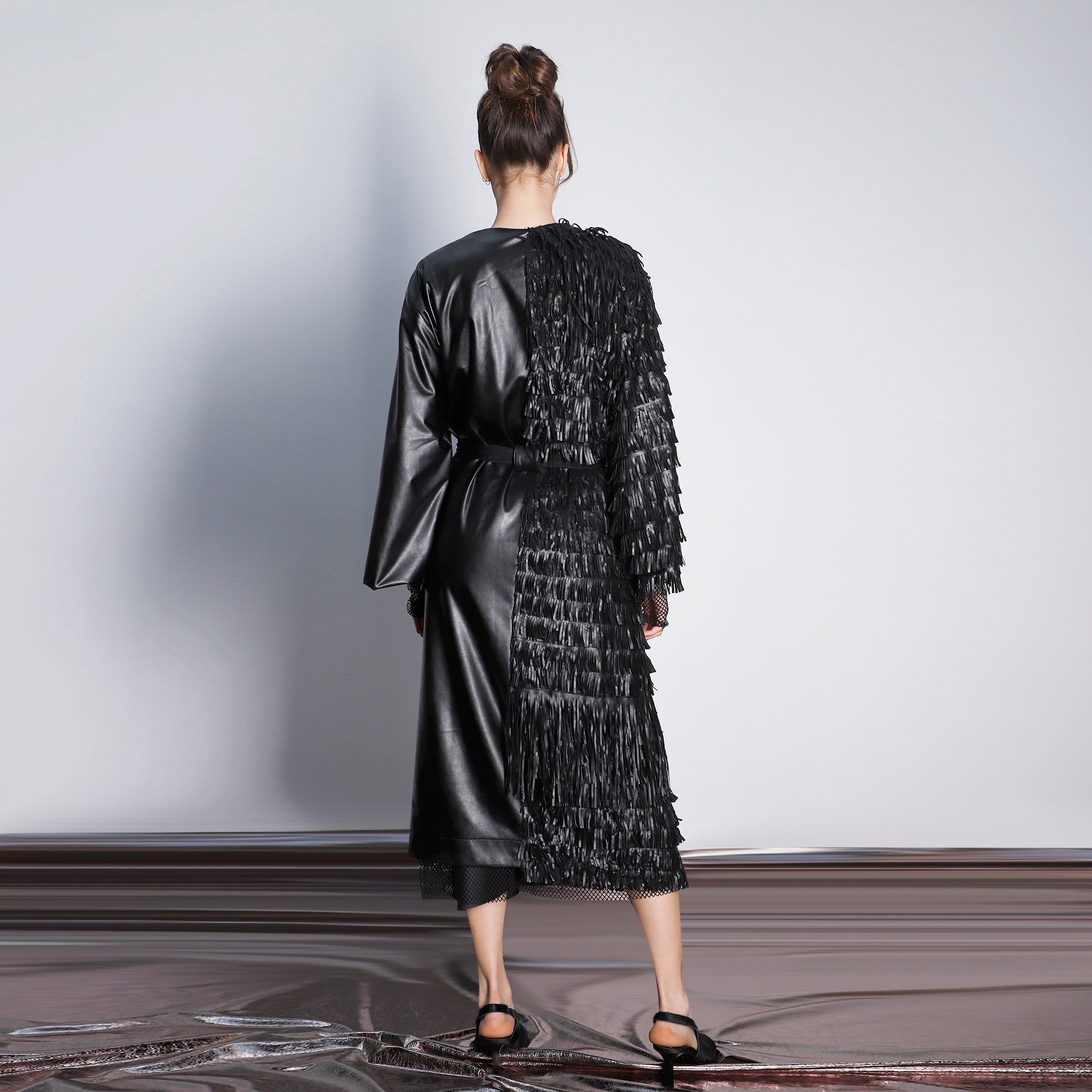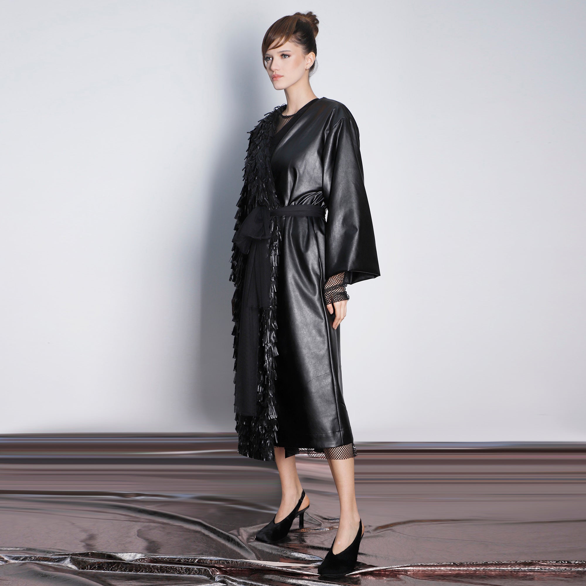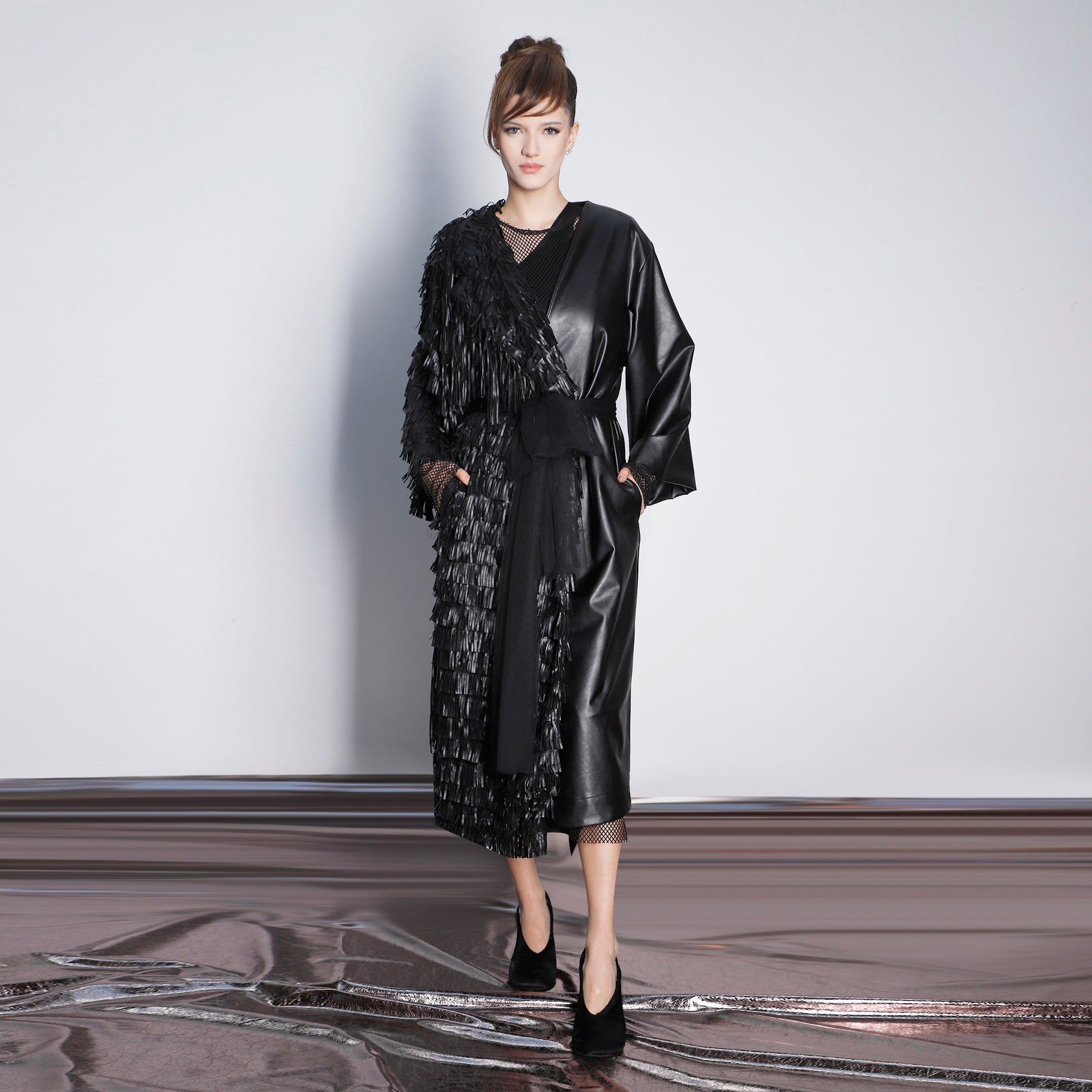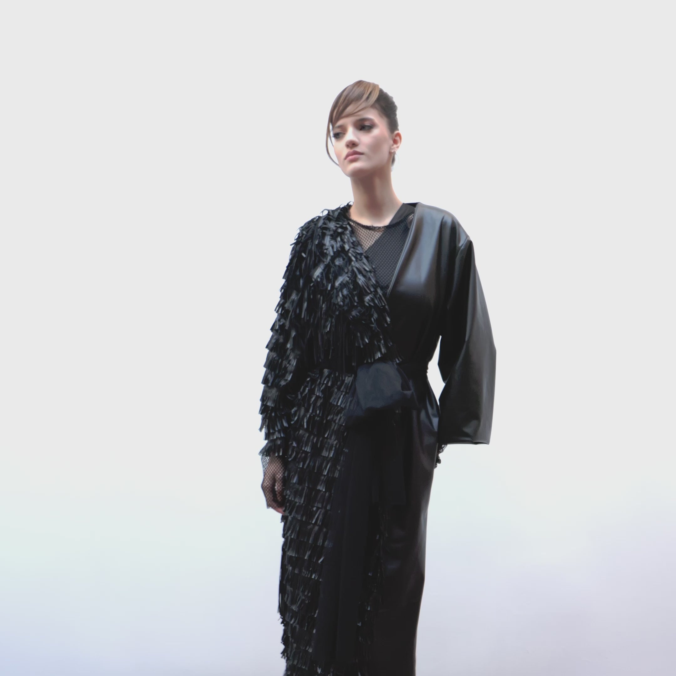 A classic kimono split in two: one side smooth faux leather, the other with laser-cut fringes for drama and texture. A sharp blazer lapel and uneven fringe bands break the rhythm for a bold, graphic contrast. Fully lined in satin, with side pockets and a voluminous tulle belt to cinch the waist. Keep it minimalist or let the fringes do the talking. Either way, contrast is the point.