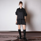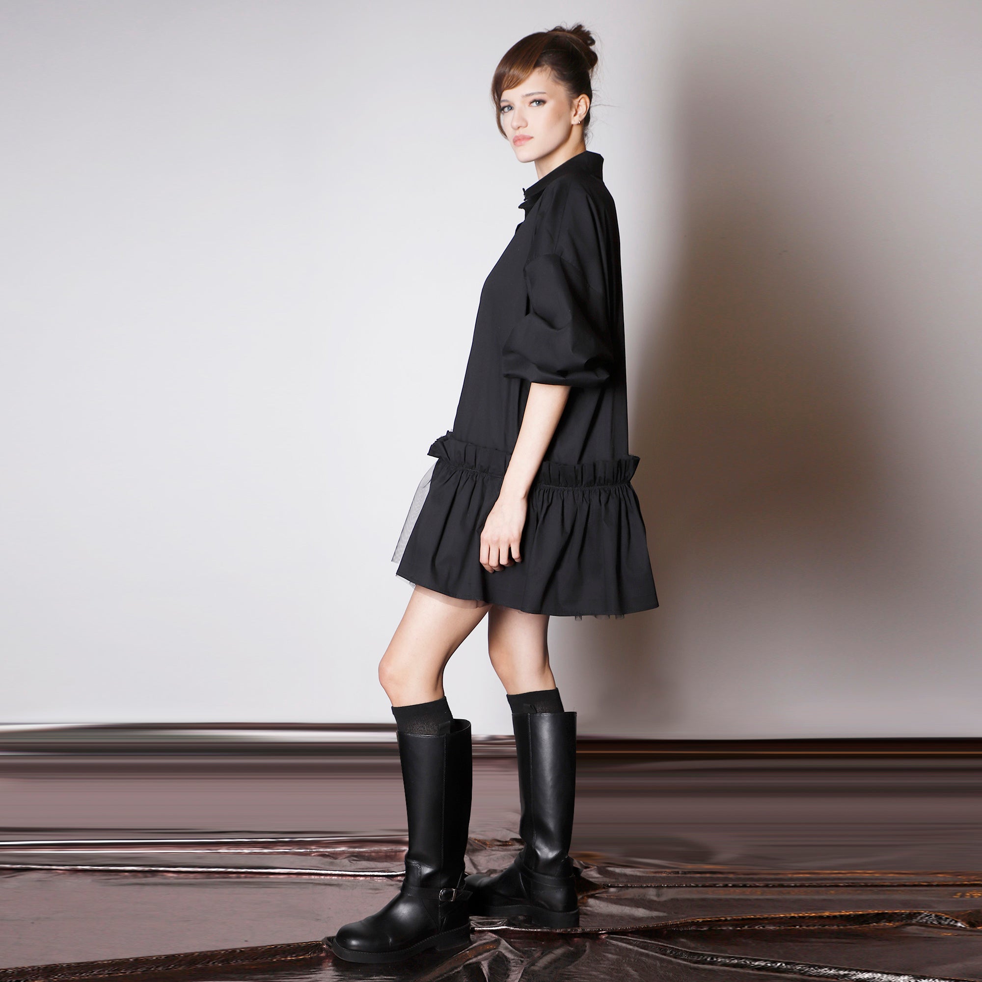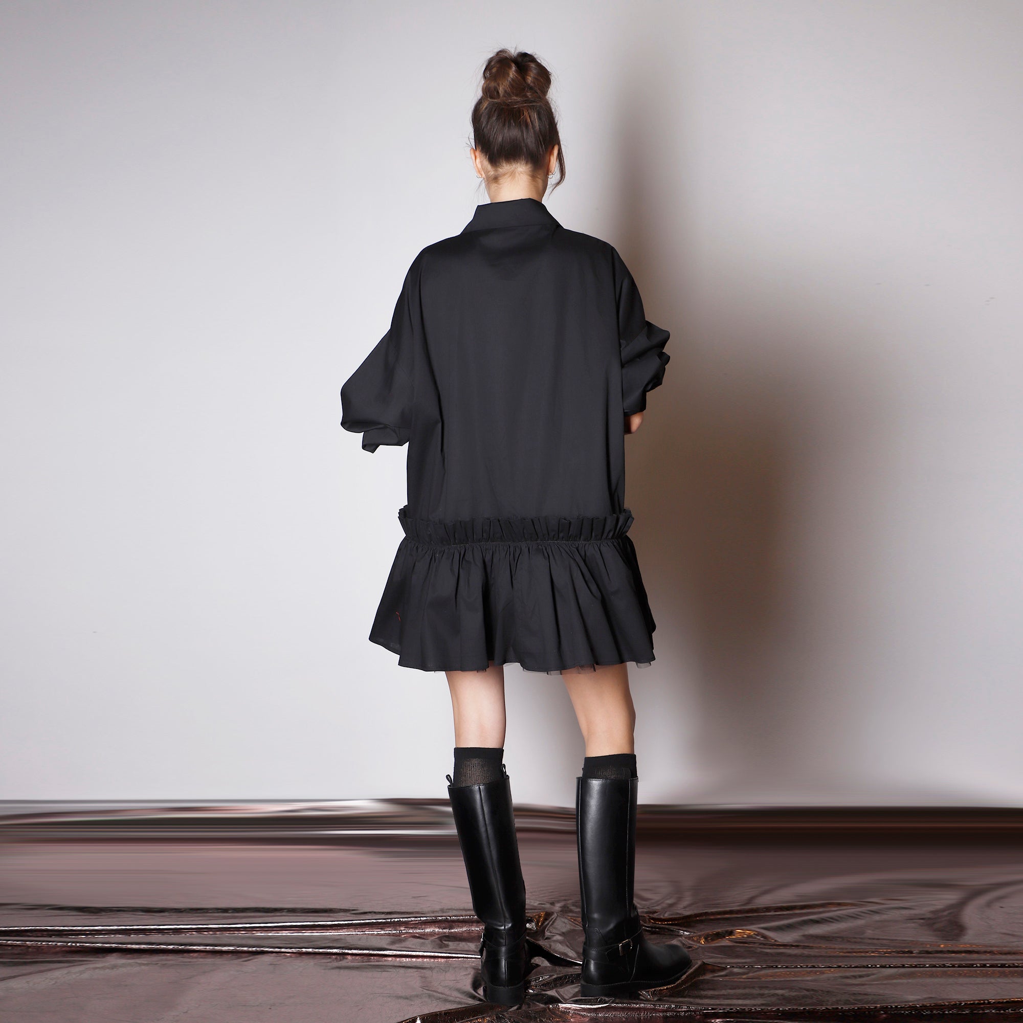 Black Oversized Shirt Dress With Double Ruffle
