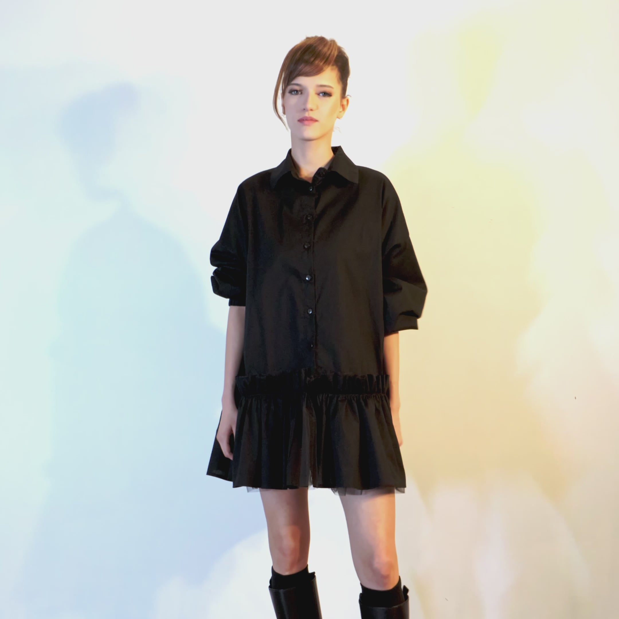 A seemingly simple piece, but with a subtle twist: an oversized shirt that turns into a dress thanks to a bold ruffle, underlined by a hidden layer of tulle peeking from beneath. The effect is playful yet refined. Classic button closure, crafted from 100% cotton, making it perfect for layering. Wear it with trousers or chunky boots — especially at festivals, when you want to stand out without trying too hard.