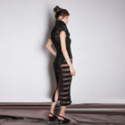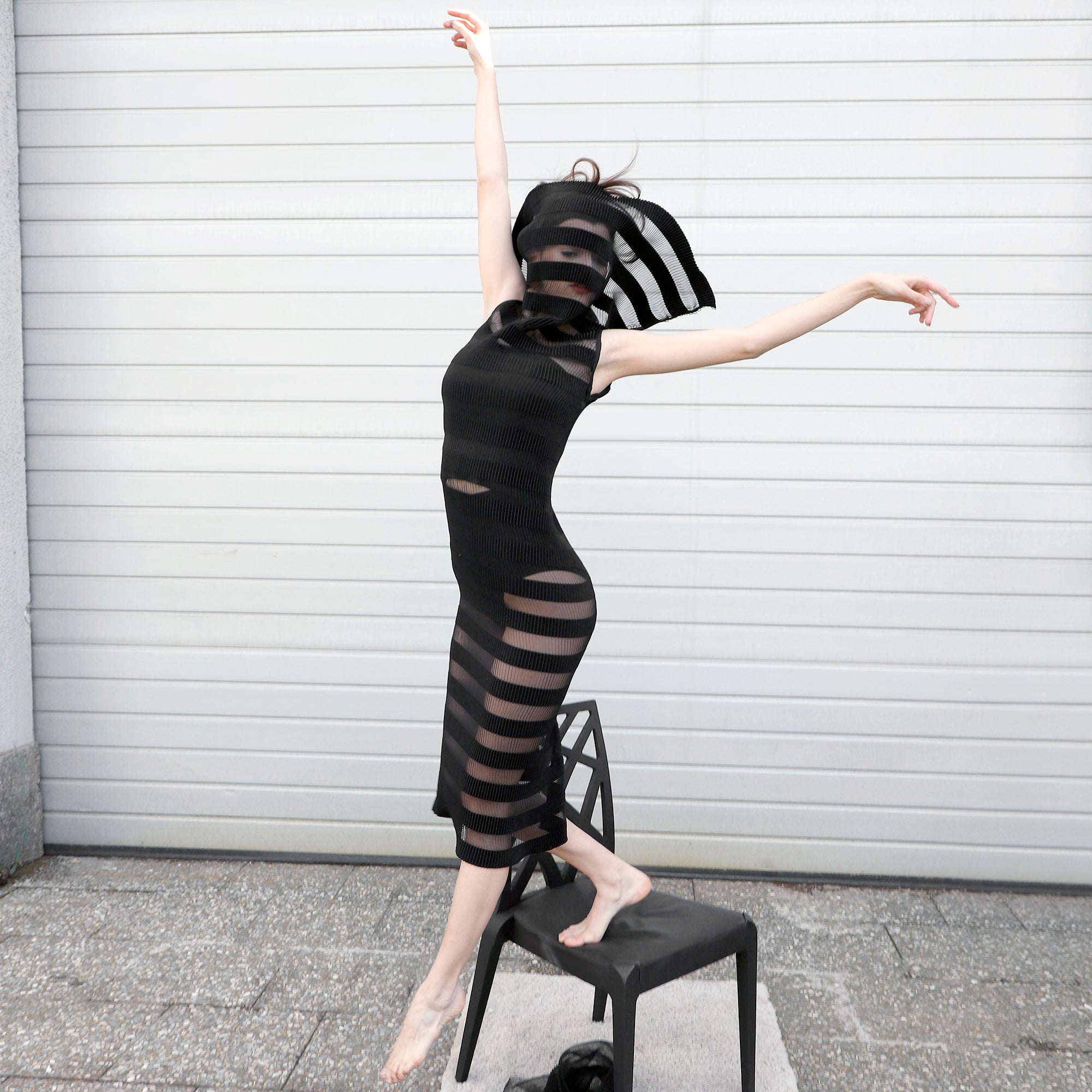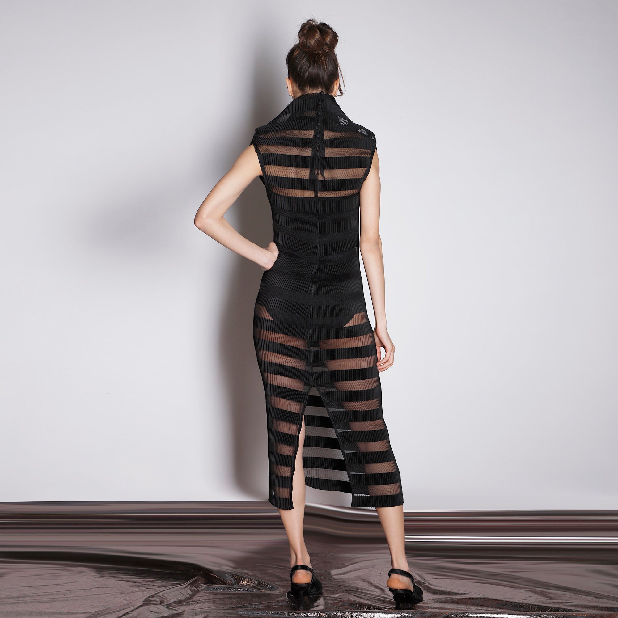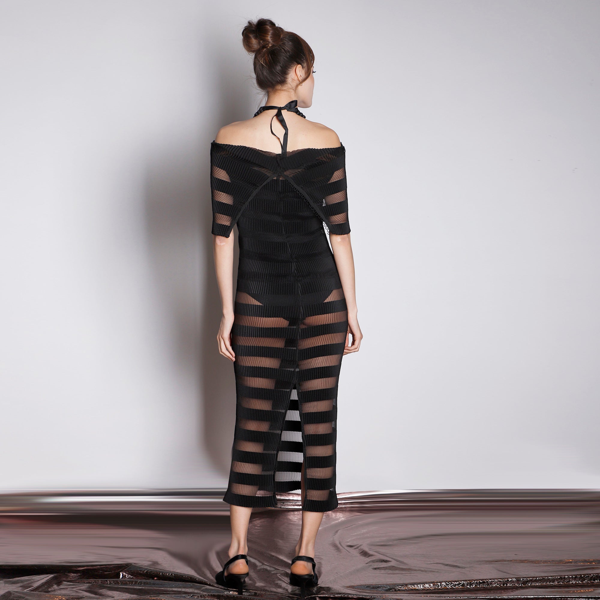 A sleek column dress that keeps it simple at first glance but surprises with sculptural versatility. The fine pleated organza offers a soft, fluid texture that gracefully follows the body. Its star detail: a voluminous modular collar that buttons at the back and can be styled multiple ways — off-shoulder, standing high for dramatic effect, or even unbuttoned. Worn with or without a slip dress, it shifts seamlessly from cocktail-ready to statement layer over minimalist outfits.