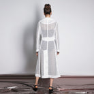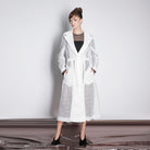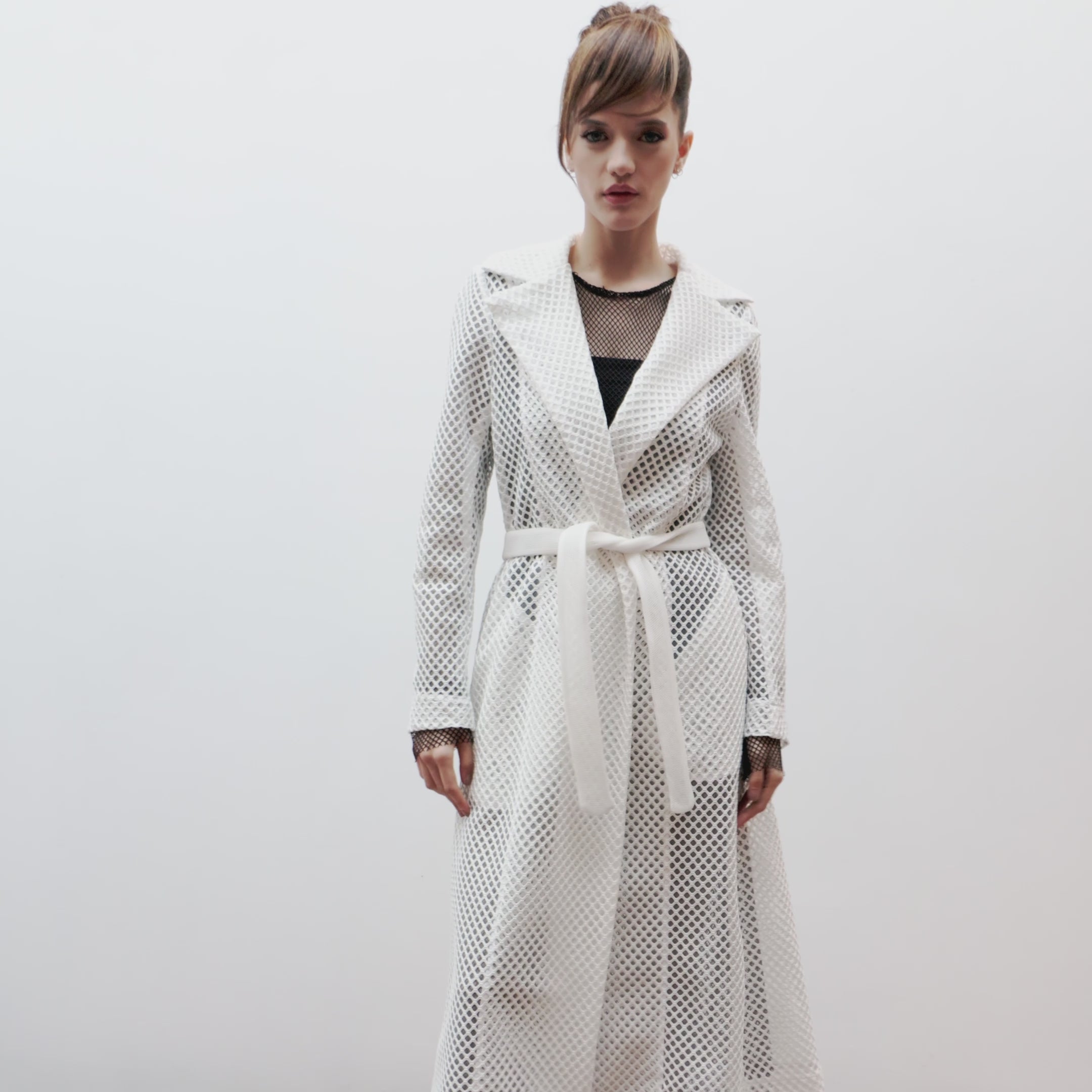 A trench with uniform vibes, reimagined in transparency and ease. White mesh lined with tulle feels unexpectedly soft, while the A-line cut adds volume without weight. The cinched waist and visible pockets keep the balance between function and statement. It's the layer that turns any simple look into something memorable. And it says loud and clear: I'm here — but on my own terms.