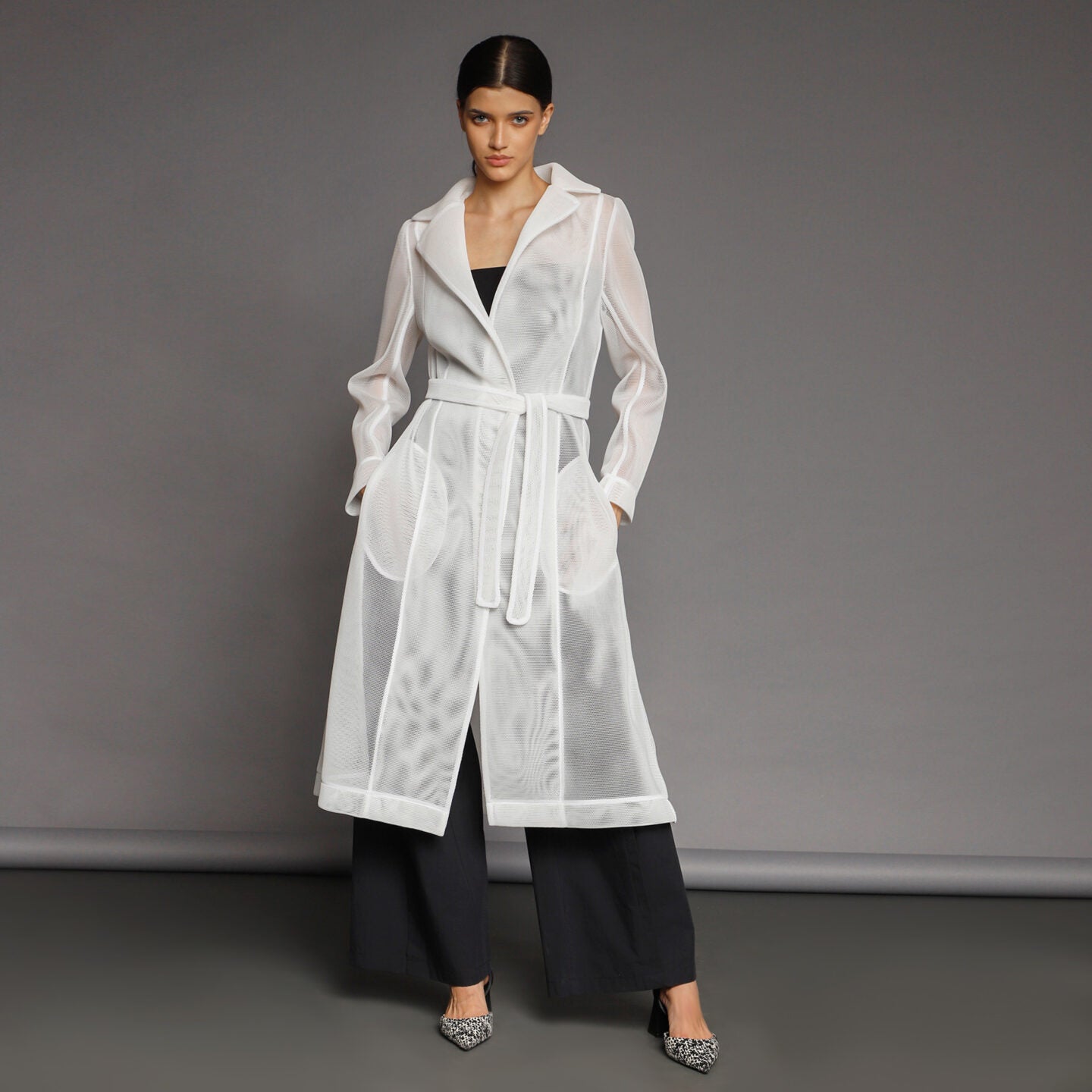The mesh A-line Trench, is a modern interpretation of a classic silhouette. Featuring pockets, secured only with a cord, and meticulously stitched with attention to detail ensures a flattering fit, making it a versatile piece for various occasions. The loose fit allows for easy layering, making it a wardrobe essential throughout all seasons.
