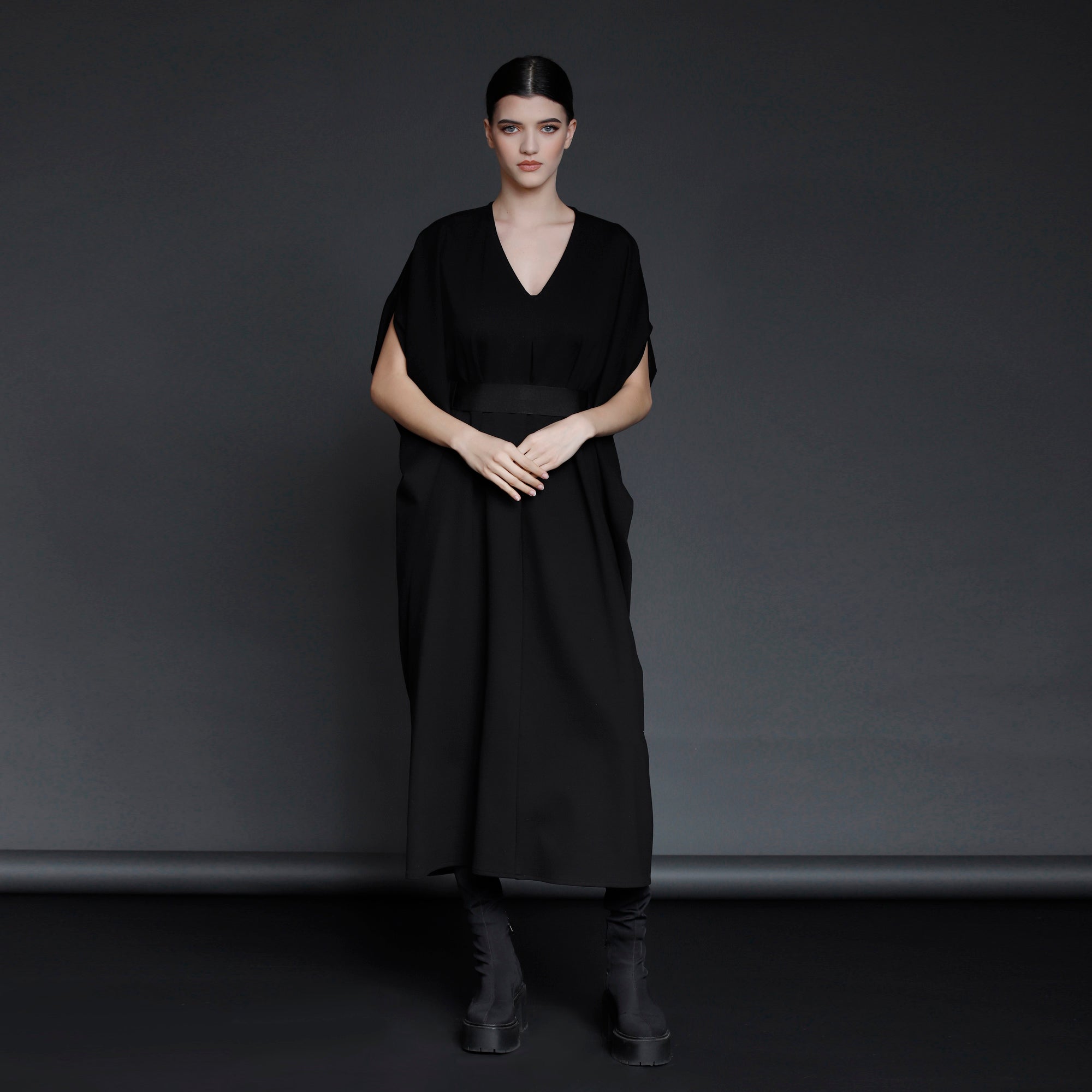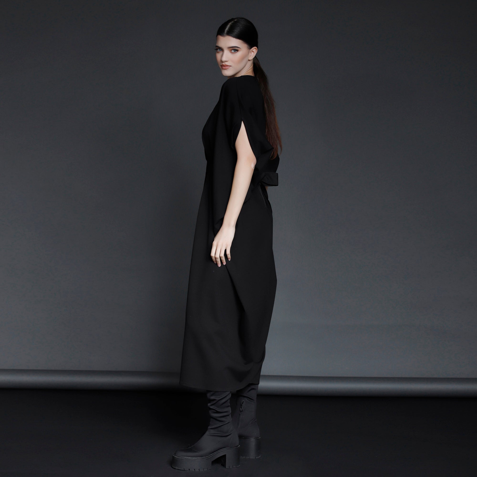 The fact that the dress can be worn tied in multiple ways shows ingenuity while also ensuring comfort. In addition, it elongates the silhouette due to the placement of the belt above the waist and the fact that it allows for the waist to be cinched in various ways. It is an 'all-season' dress that can also be worn with a turtleneck on cold days.