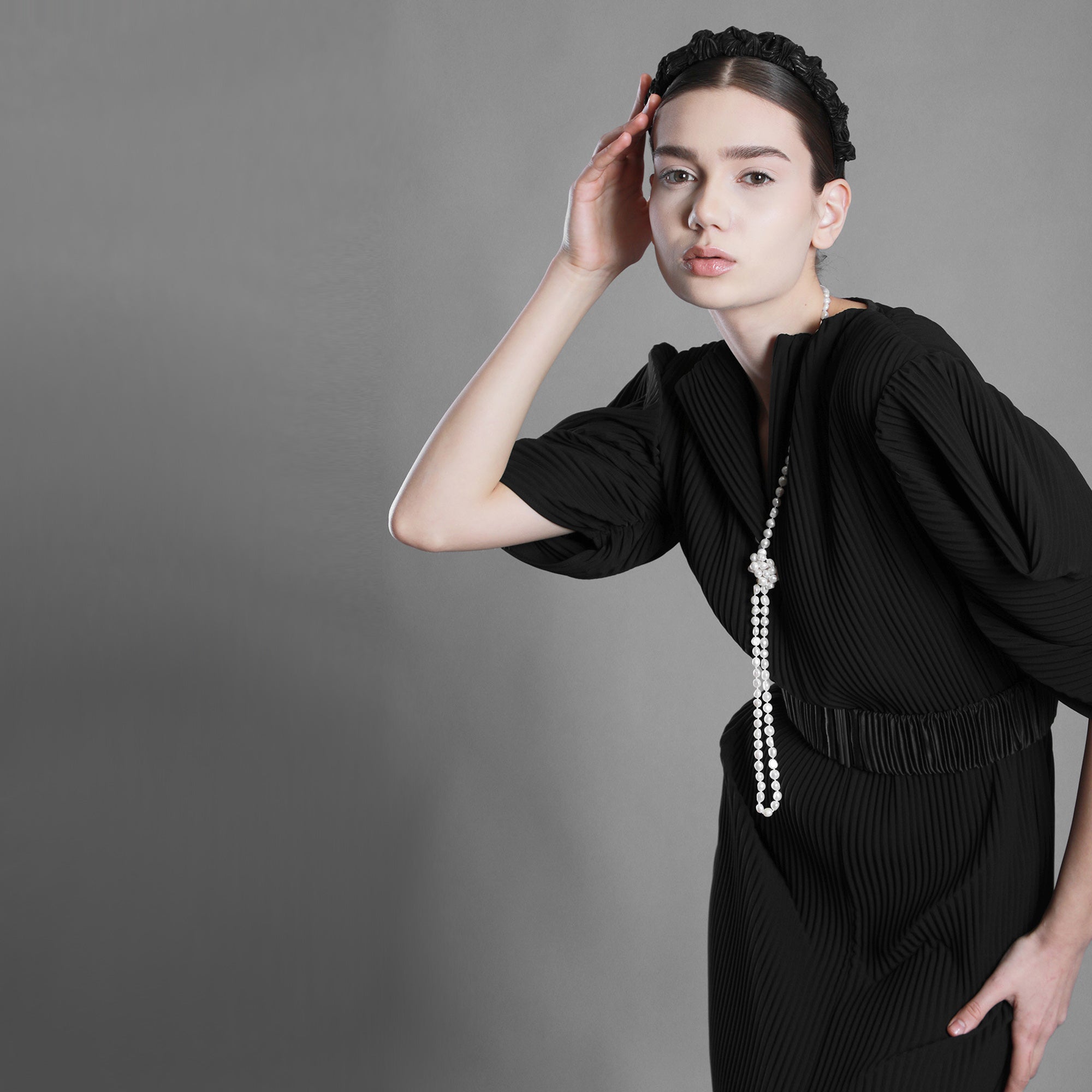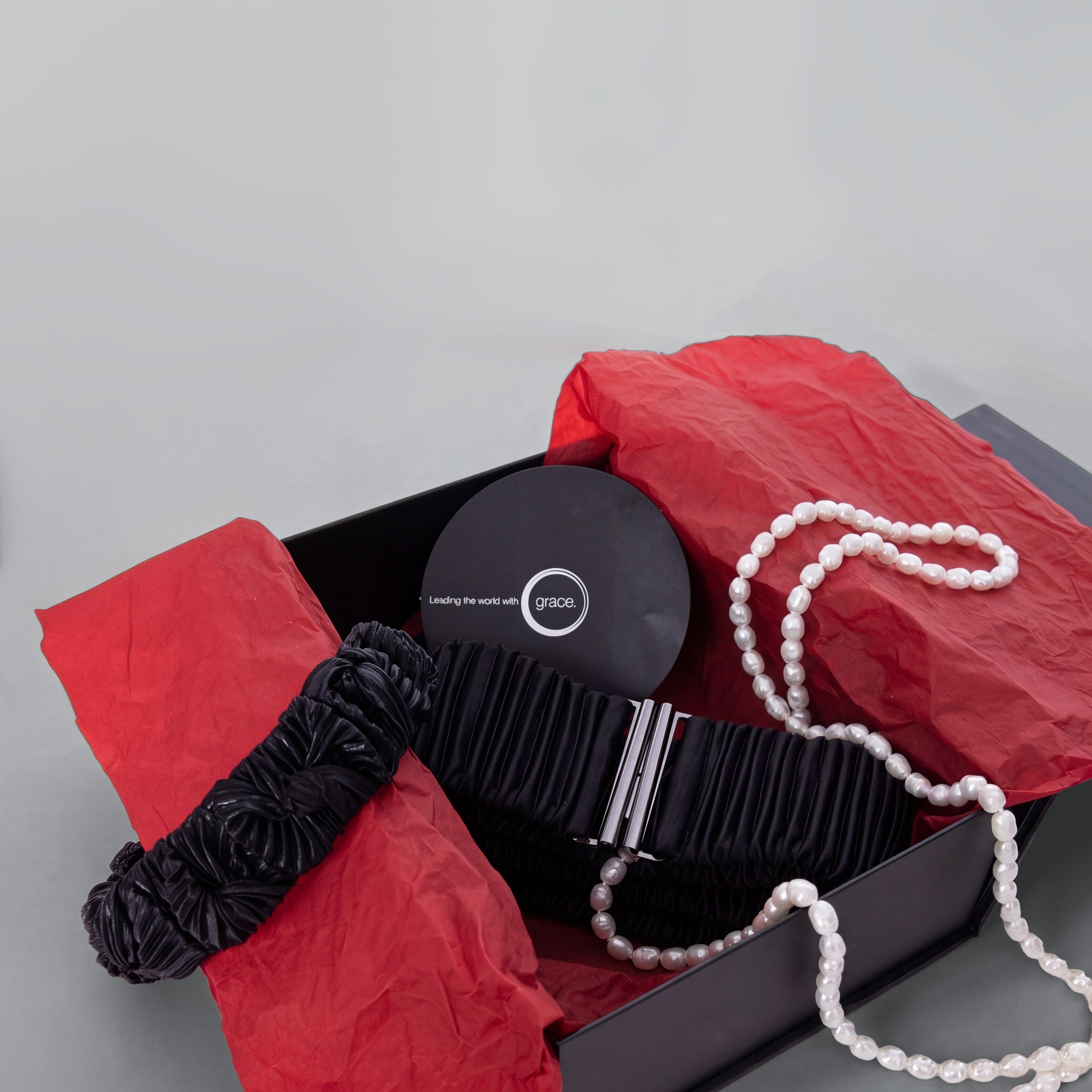 The gift box includes a long strand of cultured pearls, an elastic belt, and a headband wrapped in pleated black taffeta.