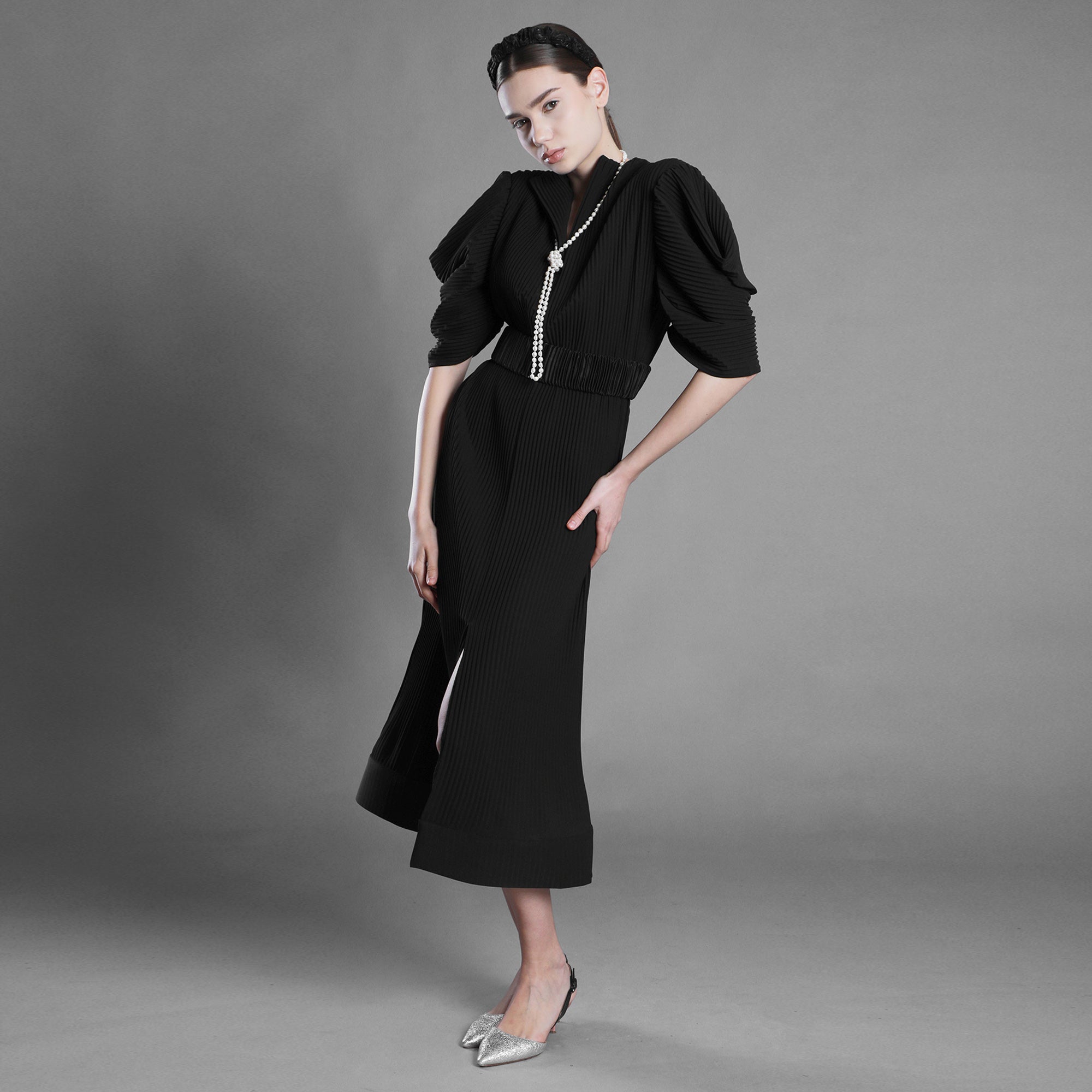 The pleated taffeta carries rhythm and trace. Each fold is a footprint. Many have walked the earth before you, and you step where they once stood. The fabric settles firmly yet flexibly — like memory that keeps you upright, like ground that does not give way.