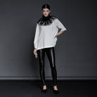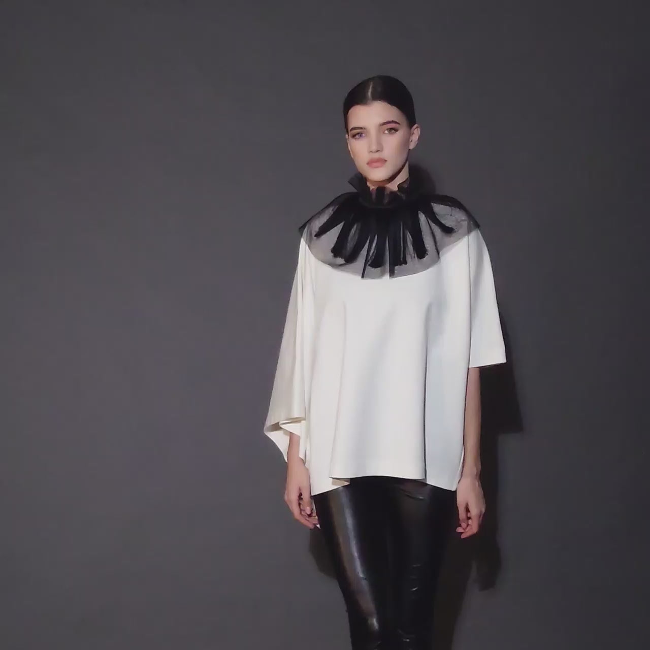 The black tulle collar with fringes adds a touch of elegance and drama to any outfit, making it perfect for both day and evening wear. A statement accessory that can transform any ensemble into a memorable appearance. It is also ideal as a gift, designed for women who appreciate refined details and wish to add a touch of style to their wardrobe.