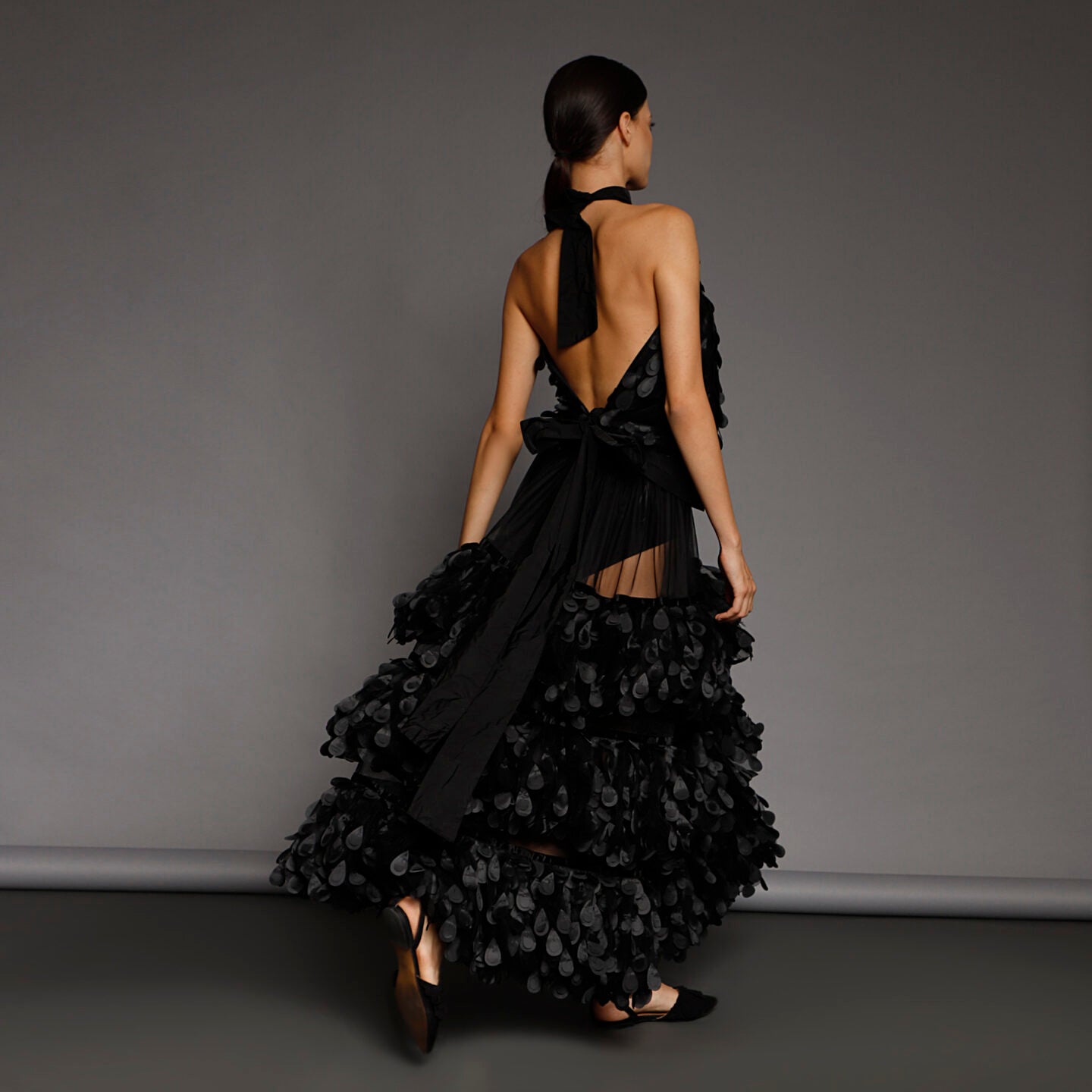 This outfit is a new interpretation of the skirt with volumetric ruffles already iconic in the Silvia Serban collections, but the material with 3D applications makes it even more sophisticated. The elastic band at the waist lets you adjust its length according to the heels you wear it with, whether you attend a show on the red carpet, or at a party with a punk dress code.