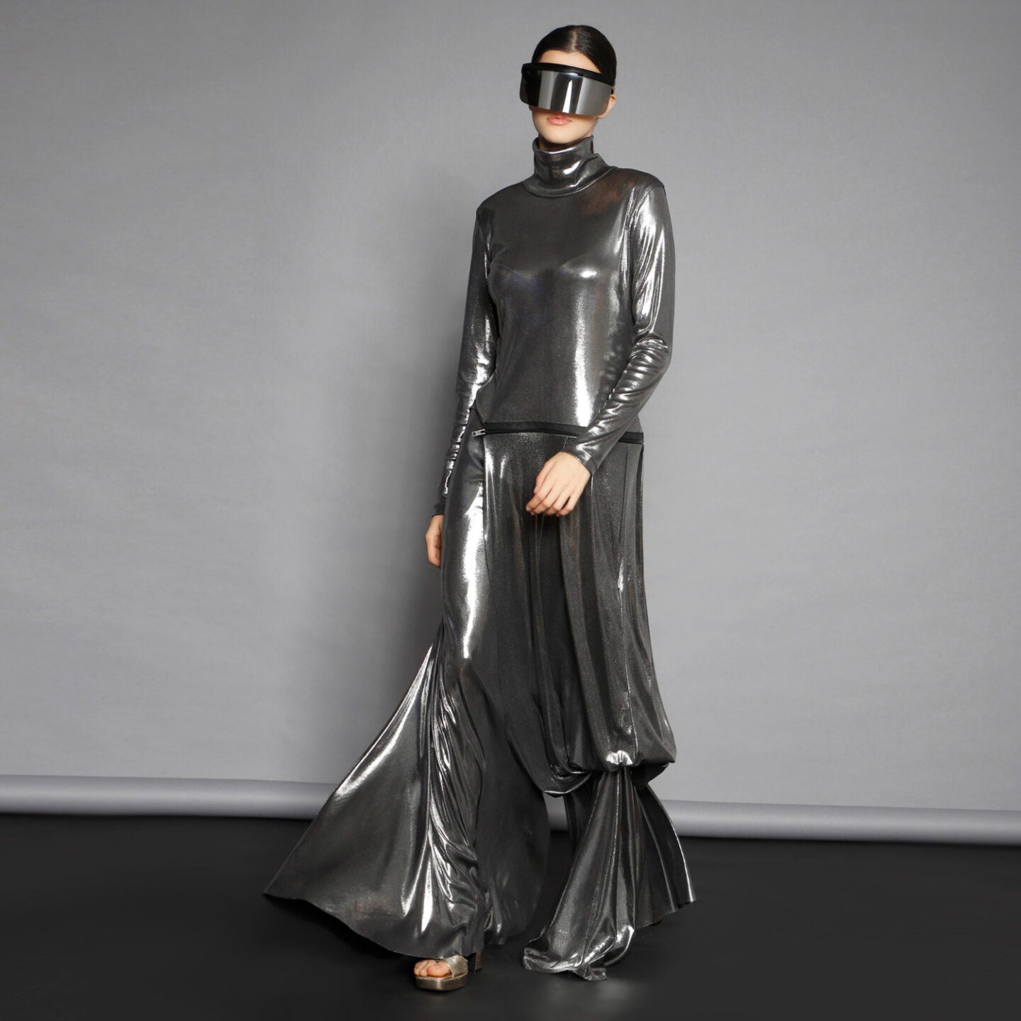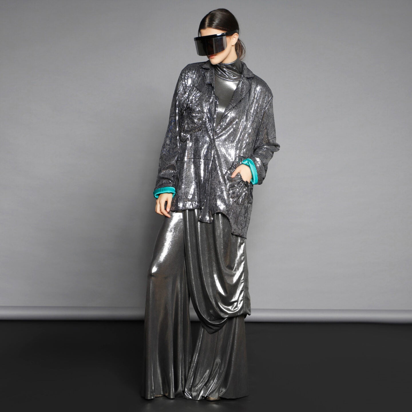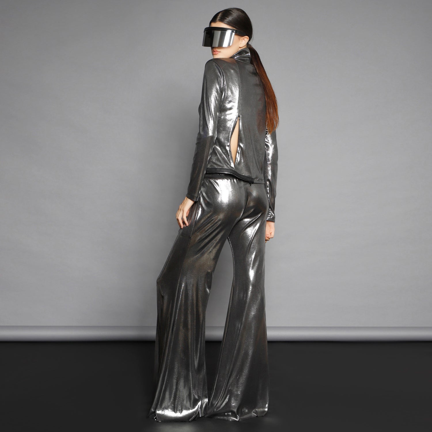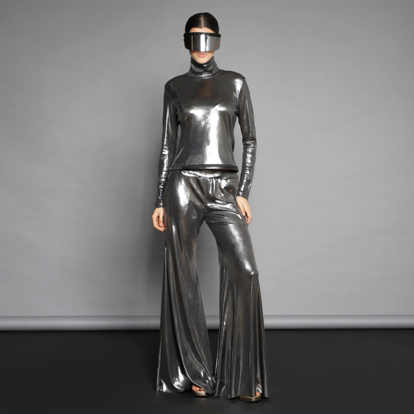 A stylish variation from the Super flared pants that brings a contemporary twist. These are thoughtfully designed to be more fitted around the thighs while gracefully widening towards the bottom, maintaining the same promise – a celebration of femininity. Crafted from versatile highh-quality Lycra material, these pants are as adaptable as they are stylish, suitable for both daytime chic and glamorous partyes, creating a dynamic and elegant silhouette.