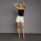 A classic cut featuring pleats, pockets, and a delicately perforated lace fabric. These shorts are set to become the highlight of the season, offering a timeless silhouette paired with subtly intricate detailing.