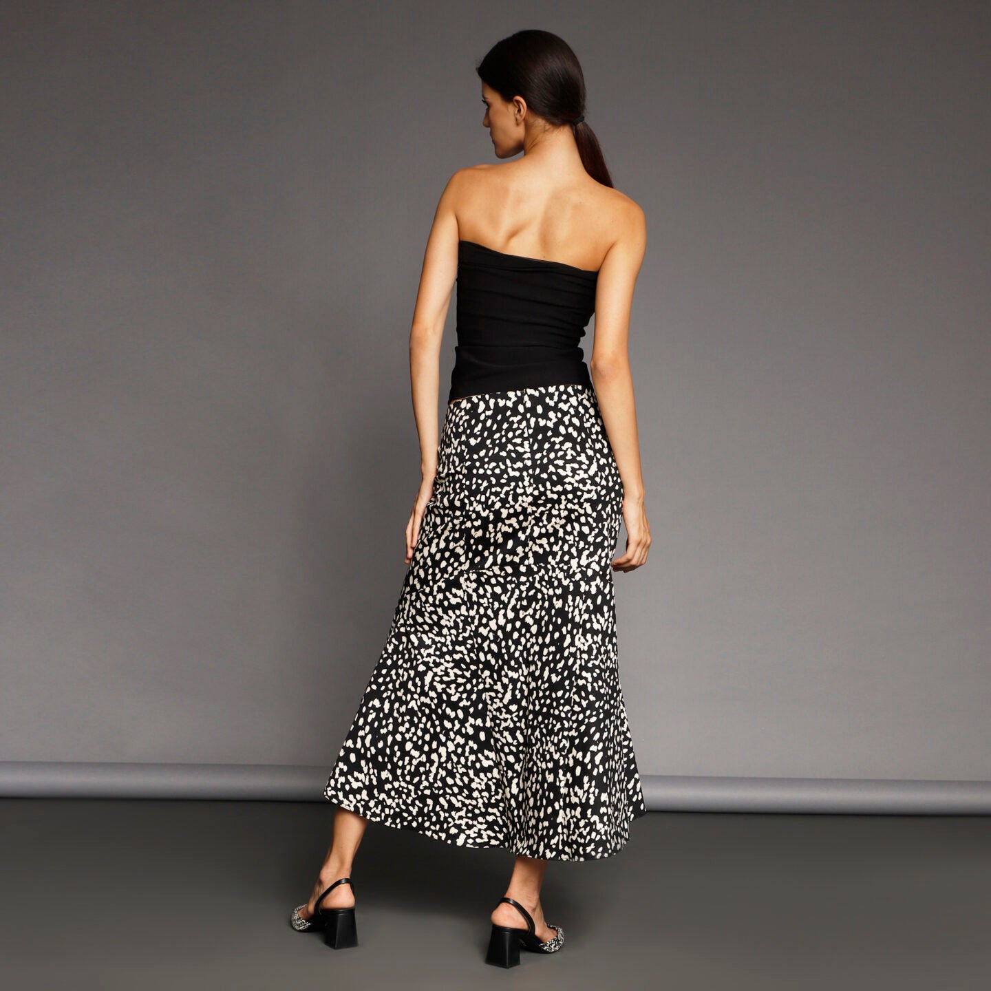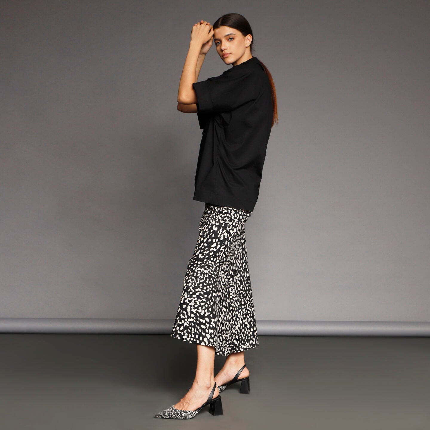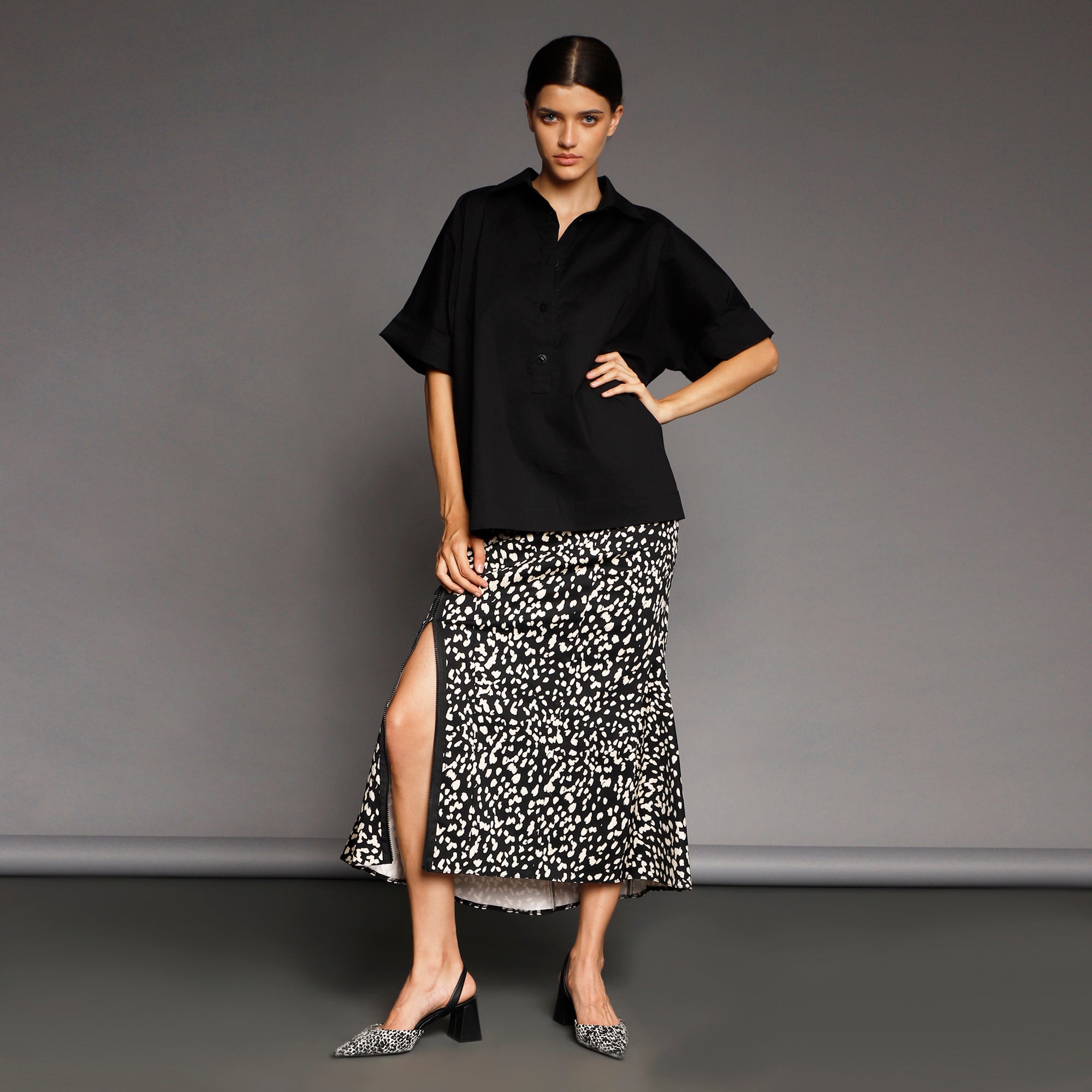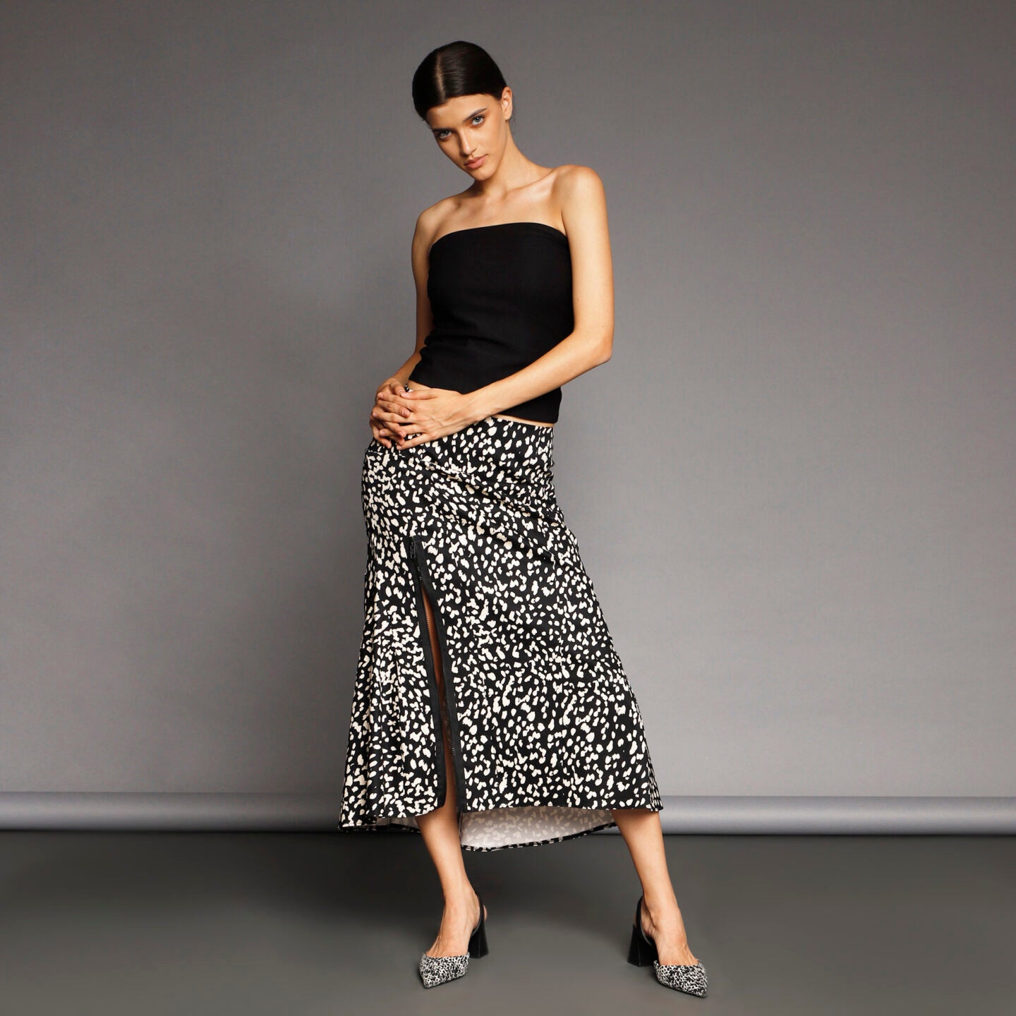 Crafted from stretch material in a classic black and white print, this skirt features a sturdy side zipper for added convenience. The bold zipper detail not only enhances comfort but also allows for creative styling options, such as wearing it over a tulle petticoat or pants. The flattering A-line silhouette is providing a timeless and versatile shape that suits various body types.