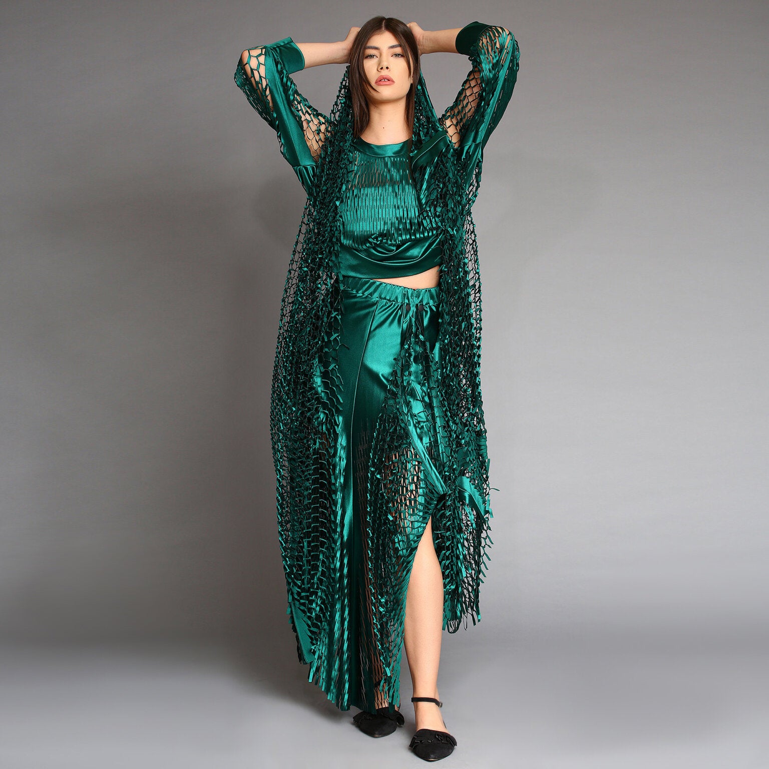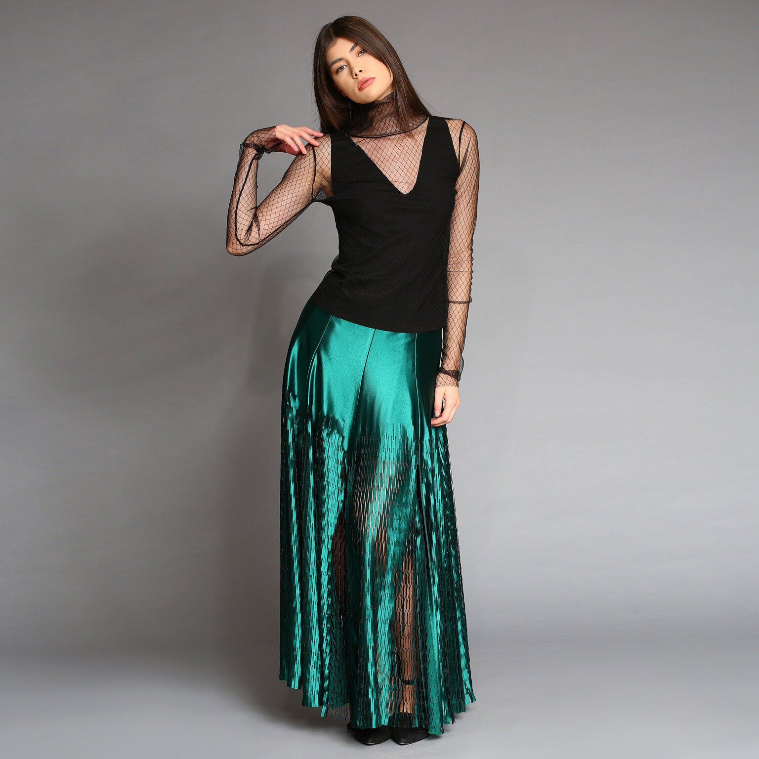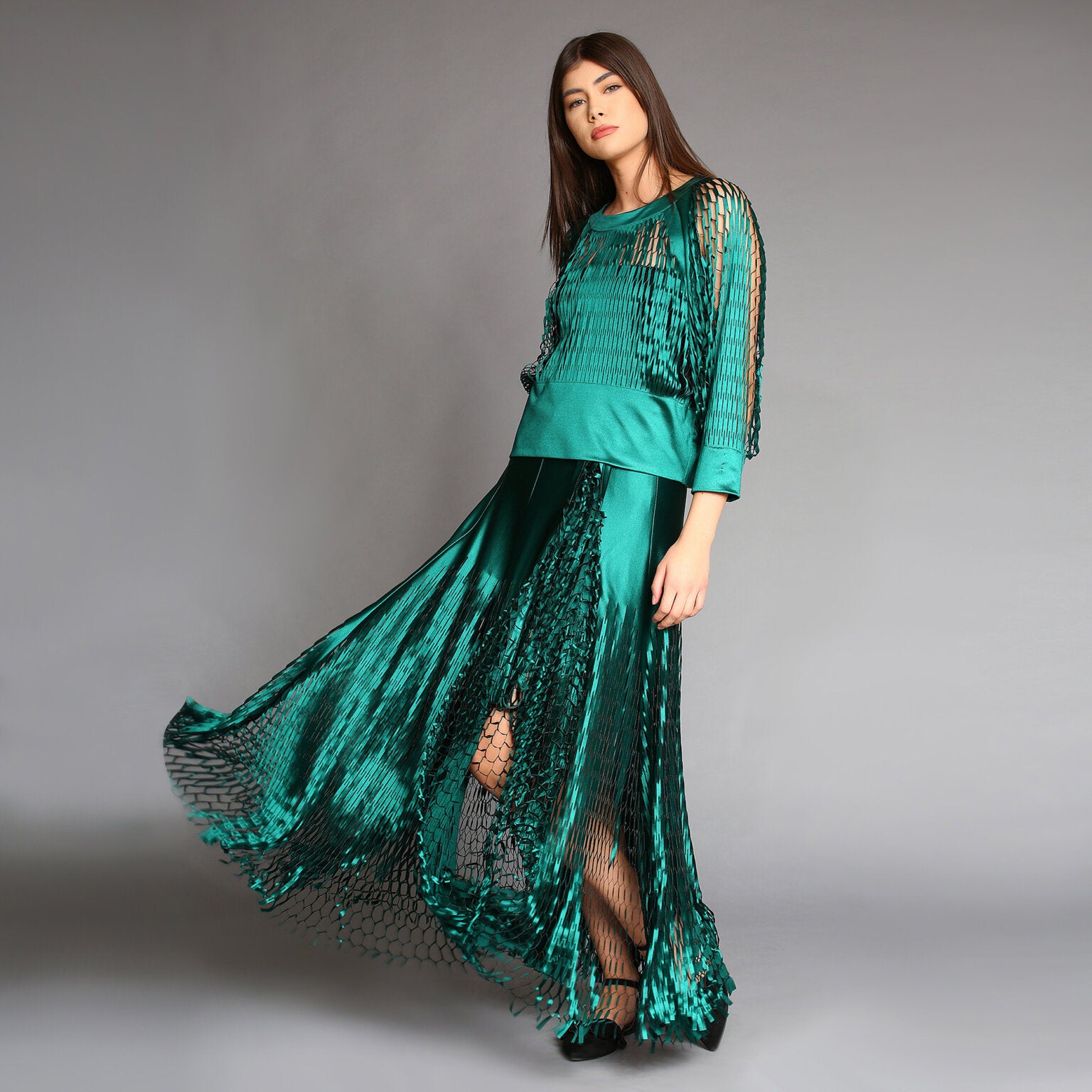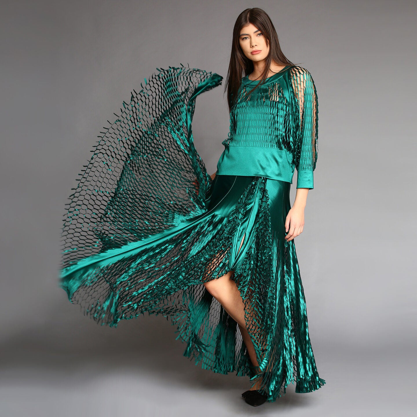 Breathtaking laser cut green paneled skirt, padded at the top.