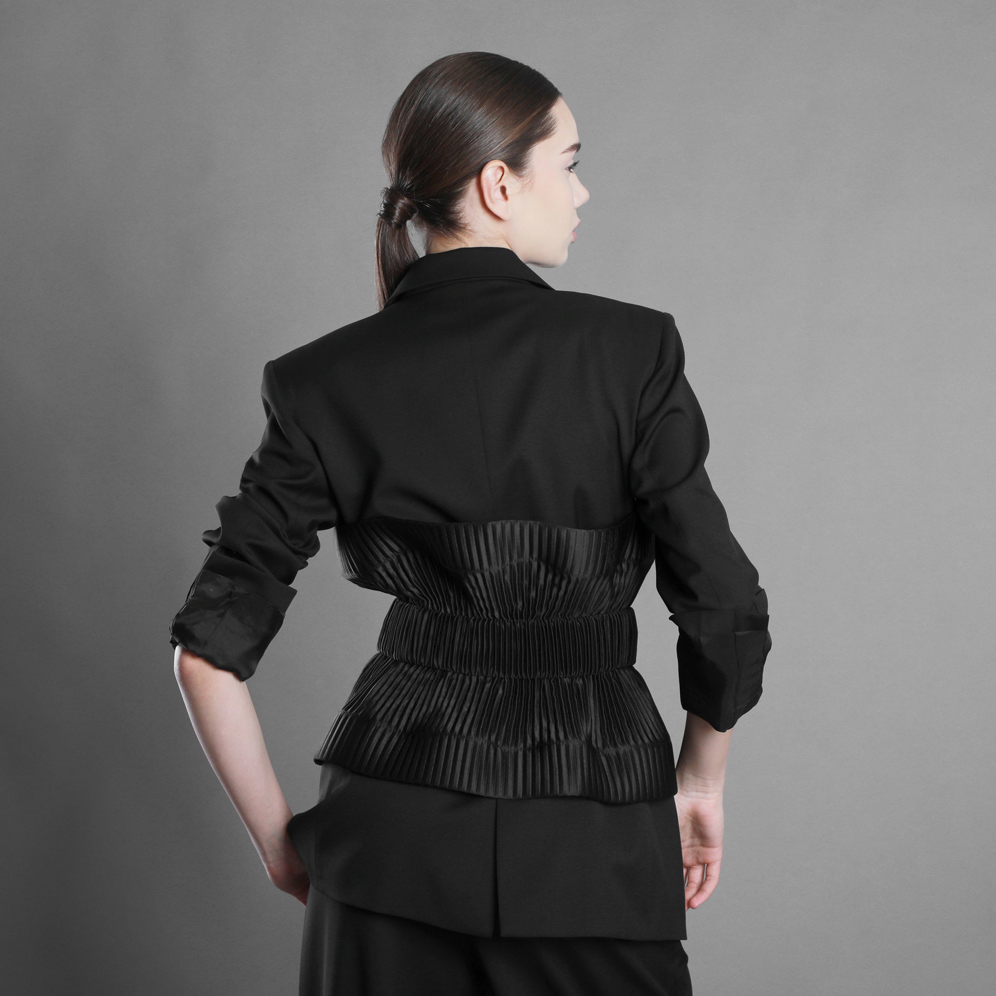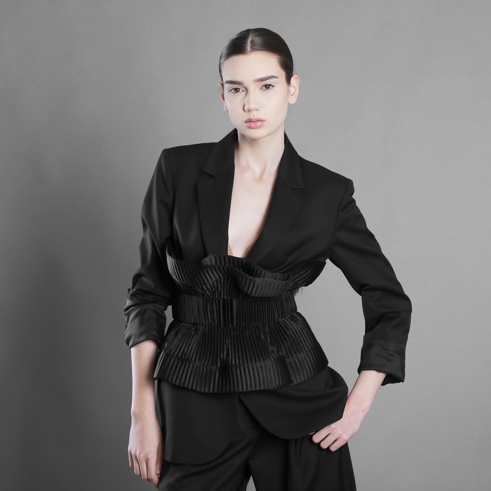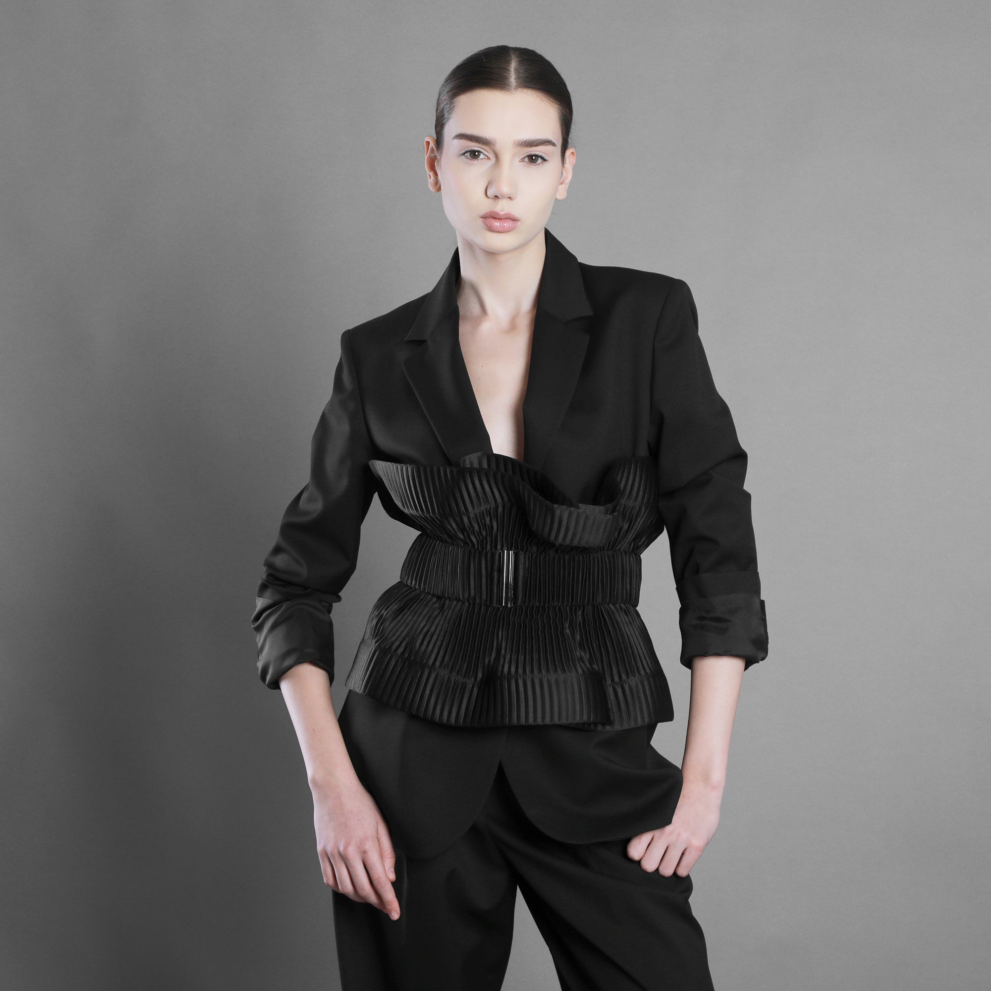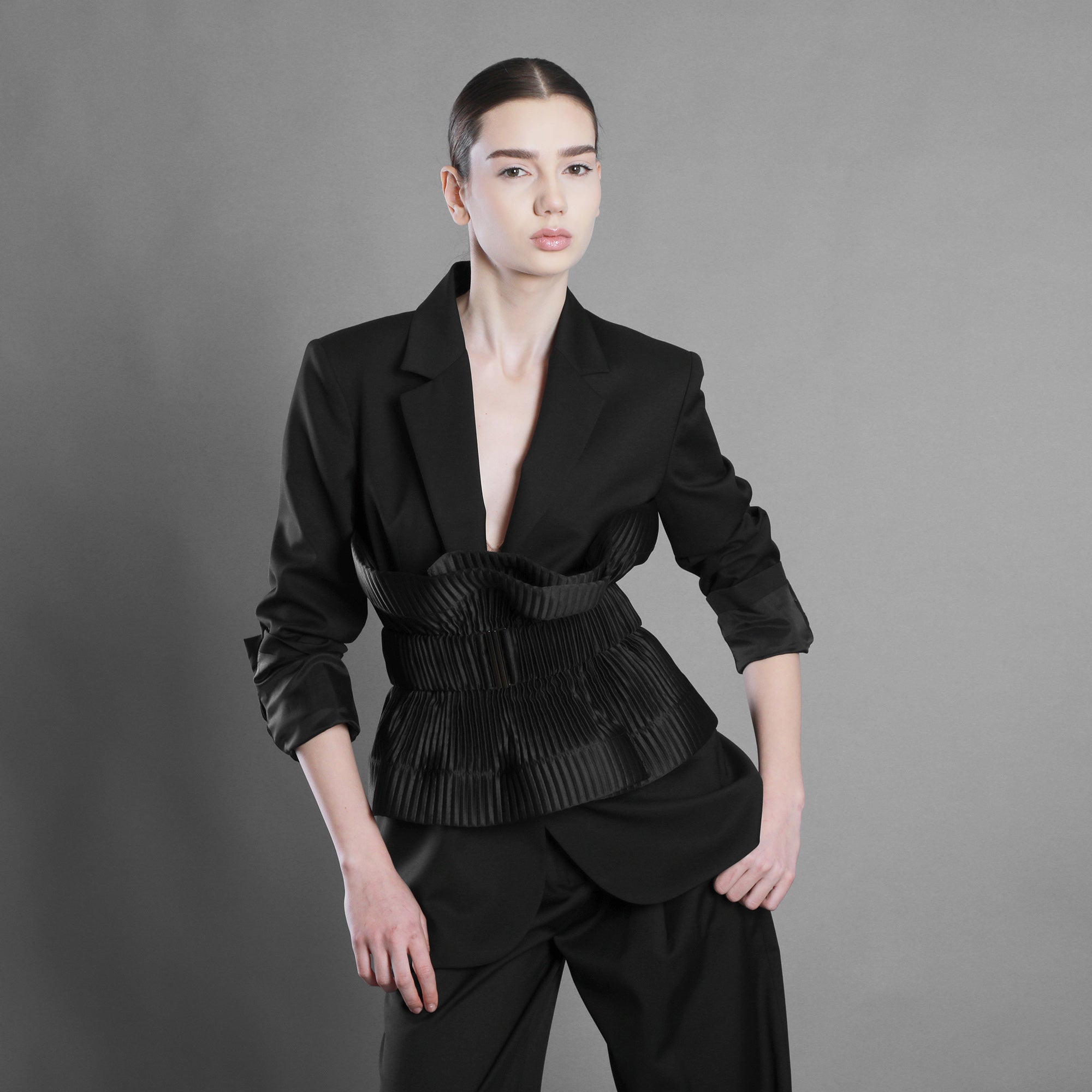 The pleated glossy taffeta belt marks the waist like a point of decision. The pleats create movement and direction, the sheen catches the light like a tense water surface. The volume is controlled, yet alive.