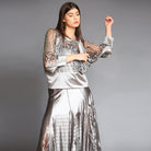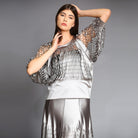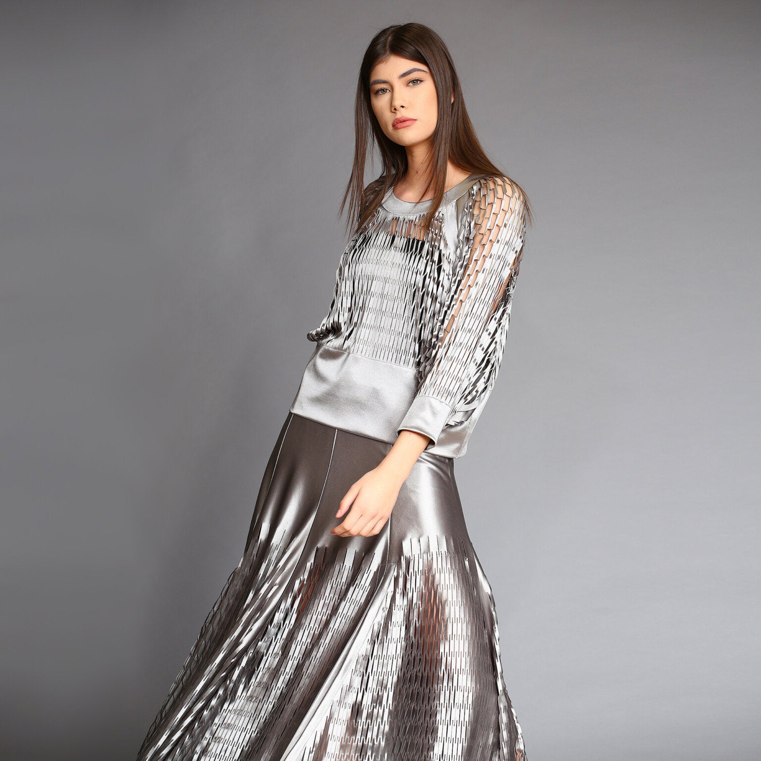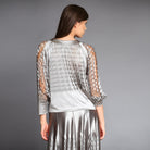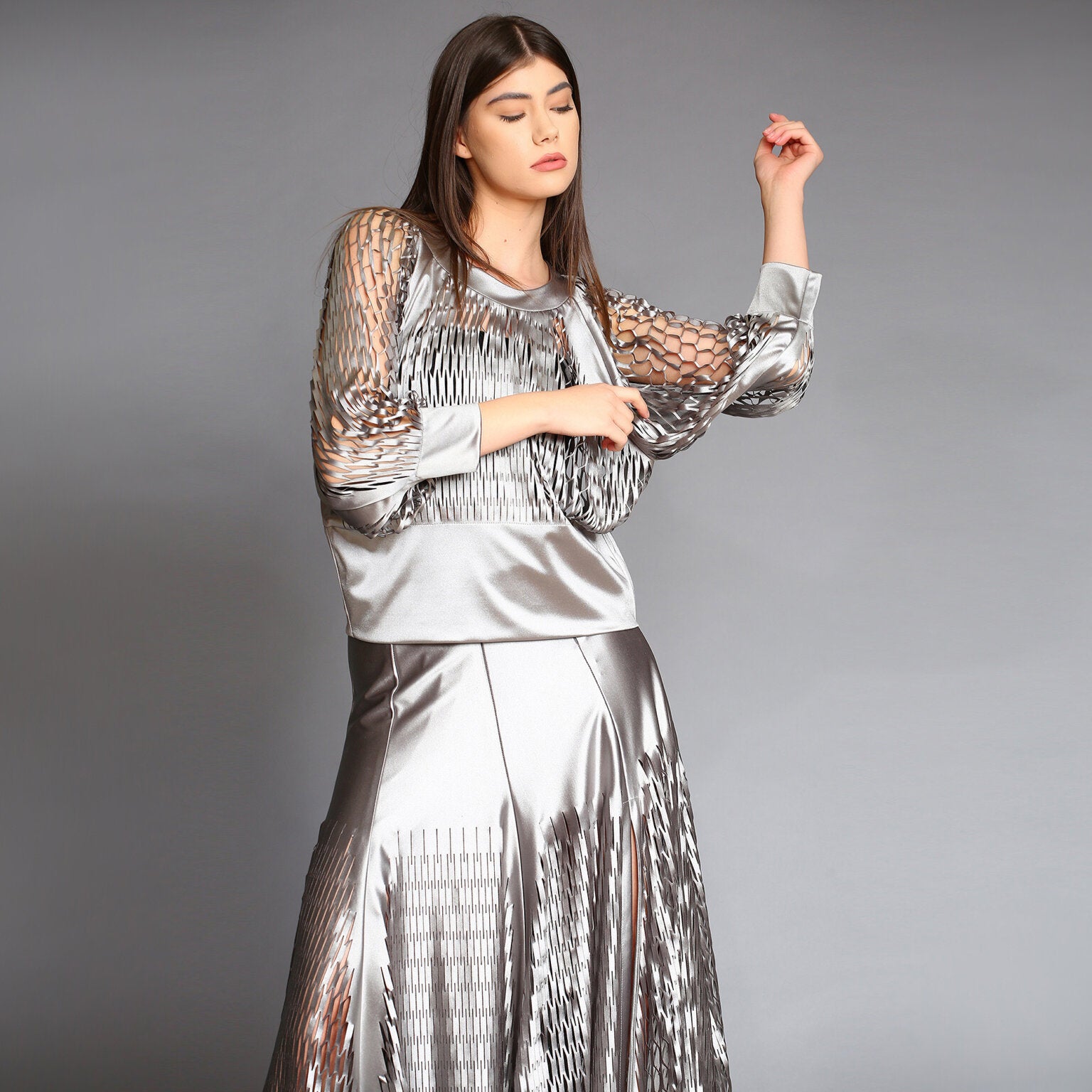 Laser cut silver blouse. Cut from a clasic swetter shape, the zig-zag laser cut gives a new dimension to your look.