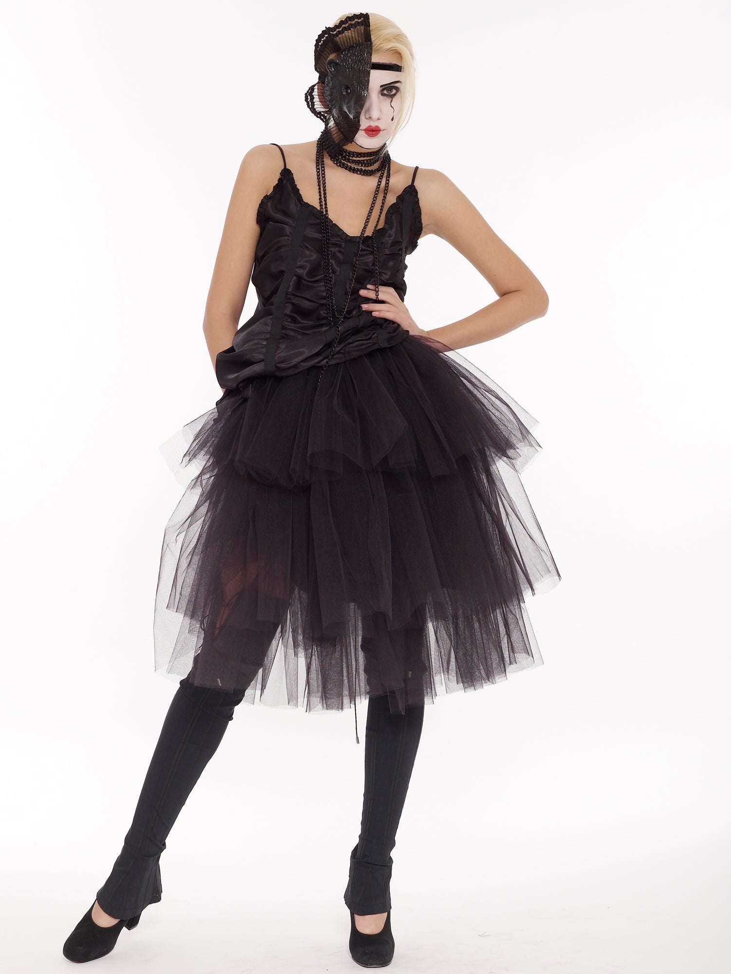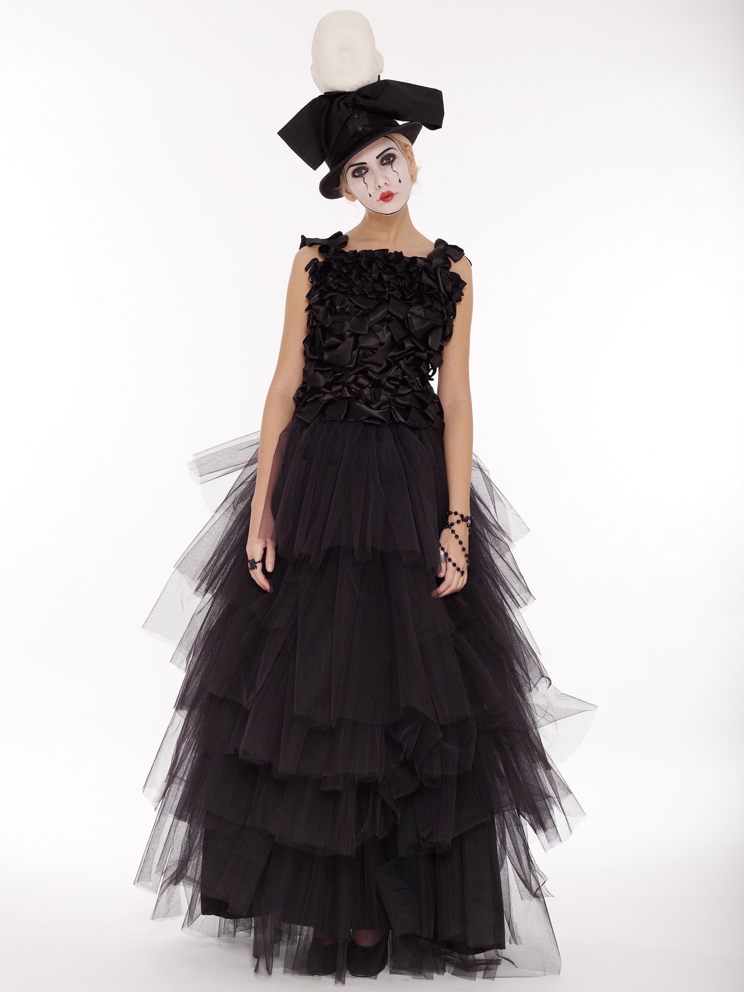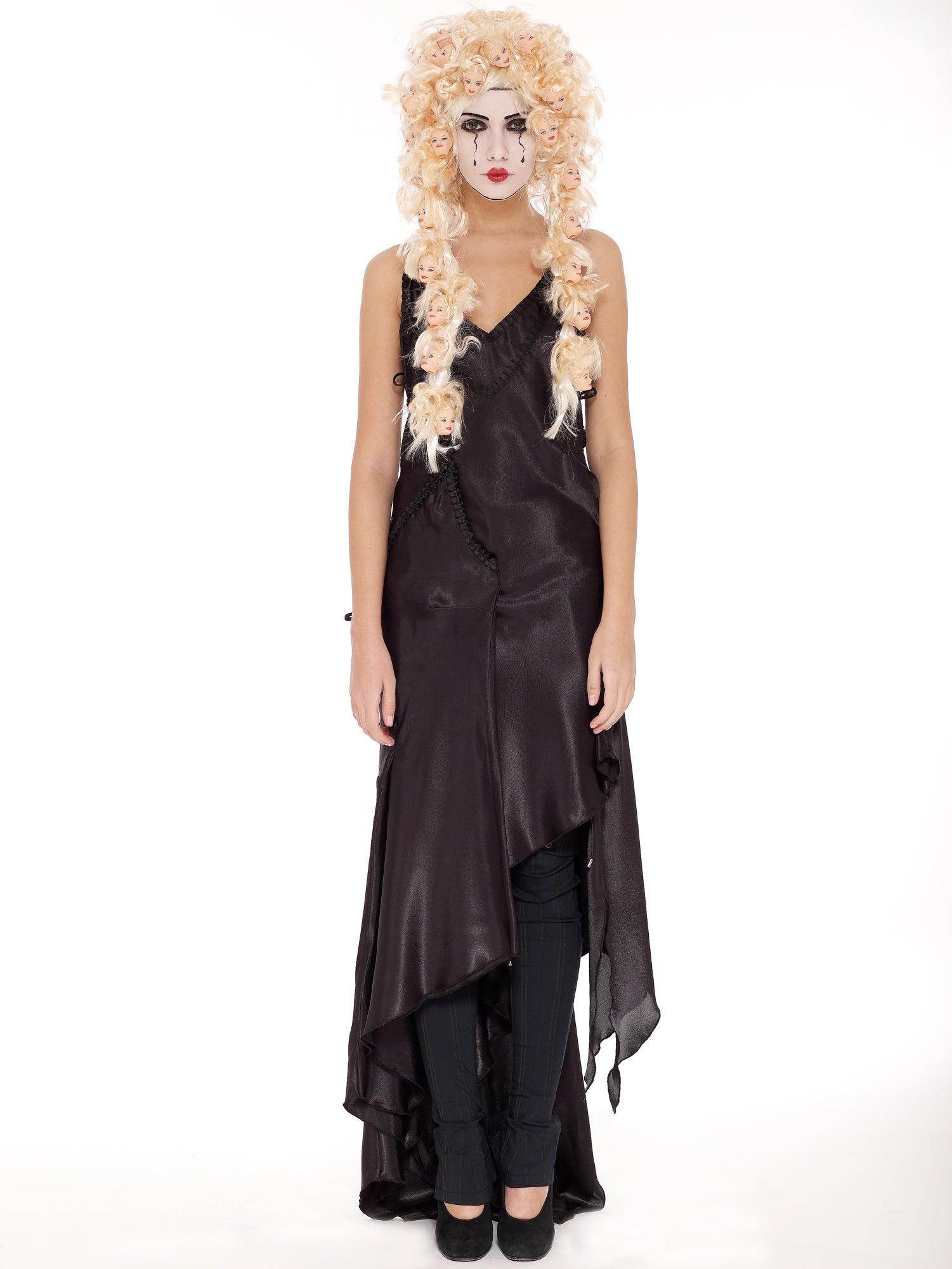 Embarking on a creative journey, I crafted a capsule collection inspired by the enchantment of Halloween parties – Ghostly Fashionistas. The pièces de résistance of this collection? Wigs made from Barbie doll heads, a playful irony that delves into the notion that from a young age, we are drawn to Halloween festivities, with costume preoccupations lingering as a perennial fascination, and the dress, composed of layered slips that adds a unique dimension through its juxtaposition of textures.
