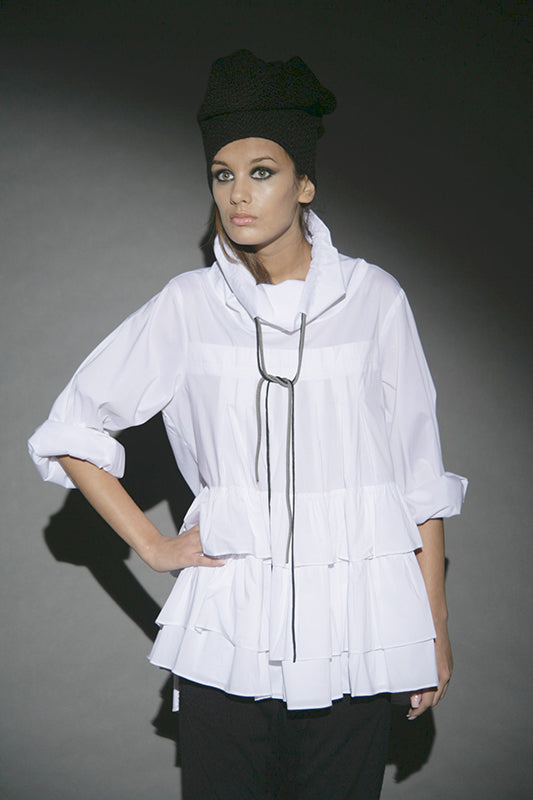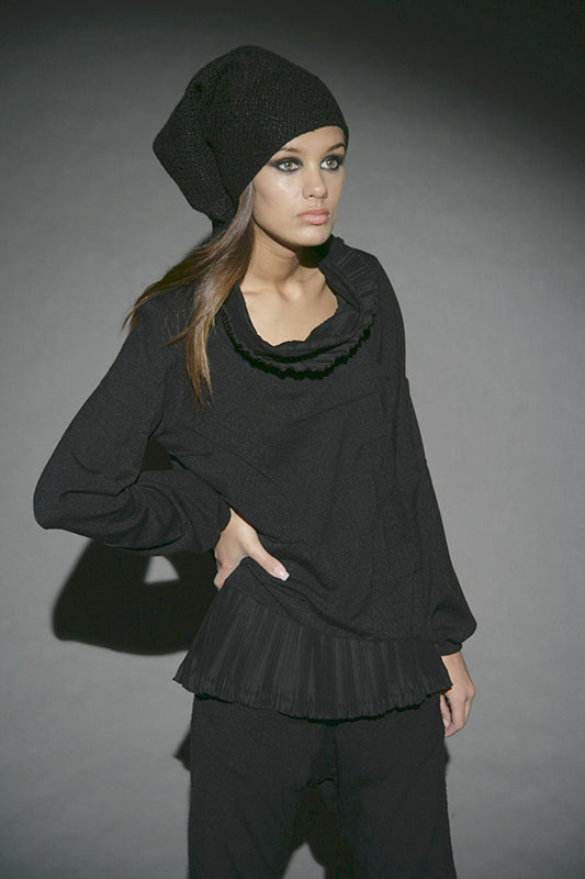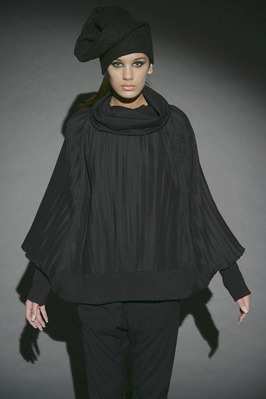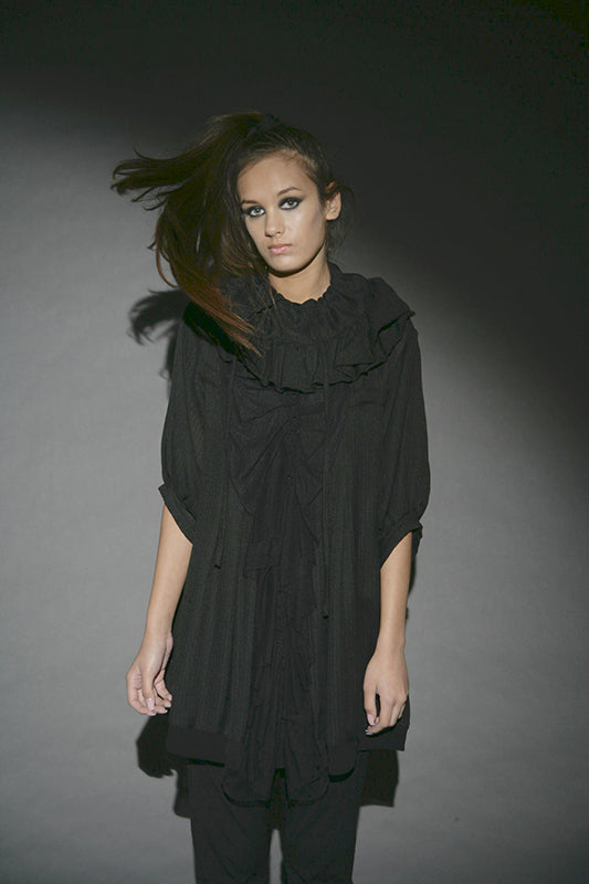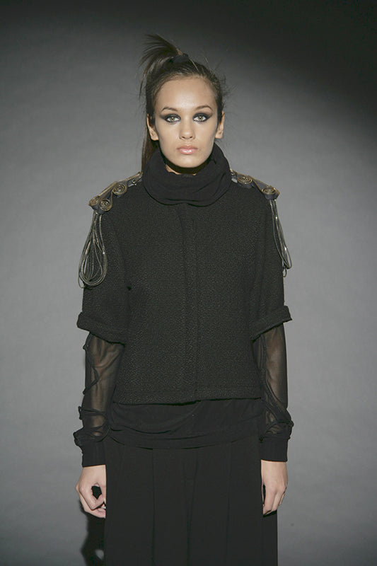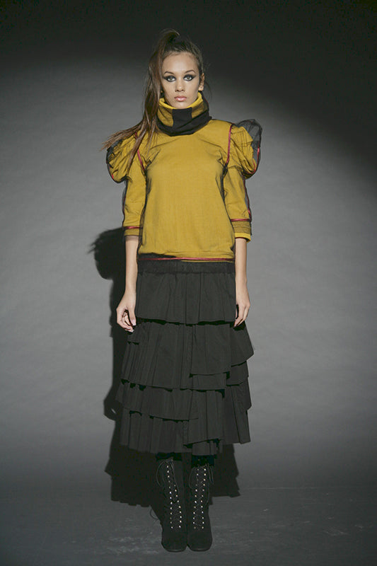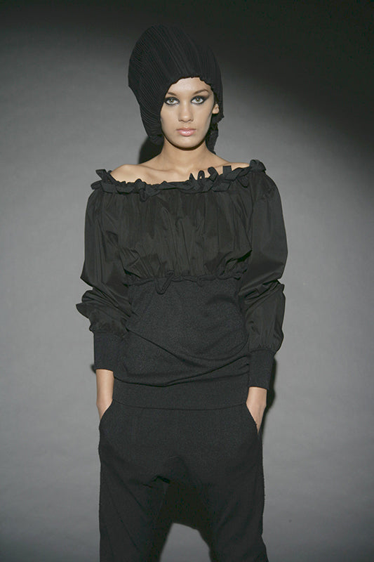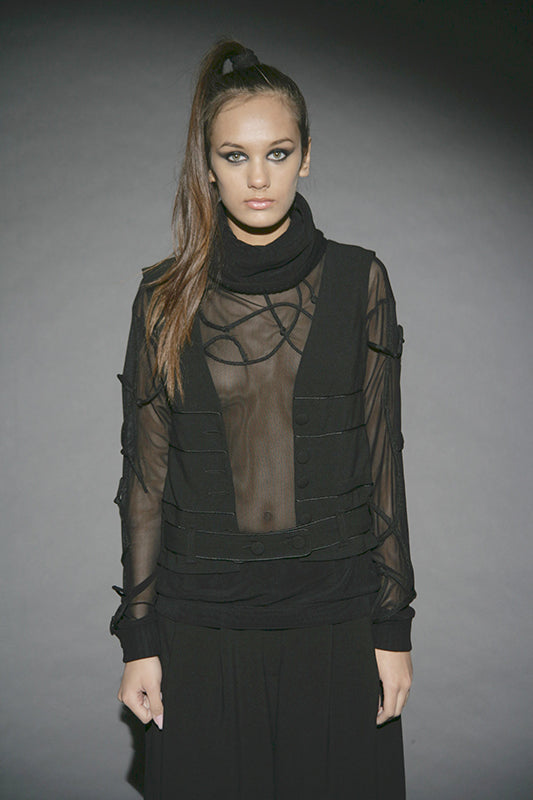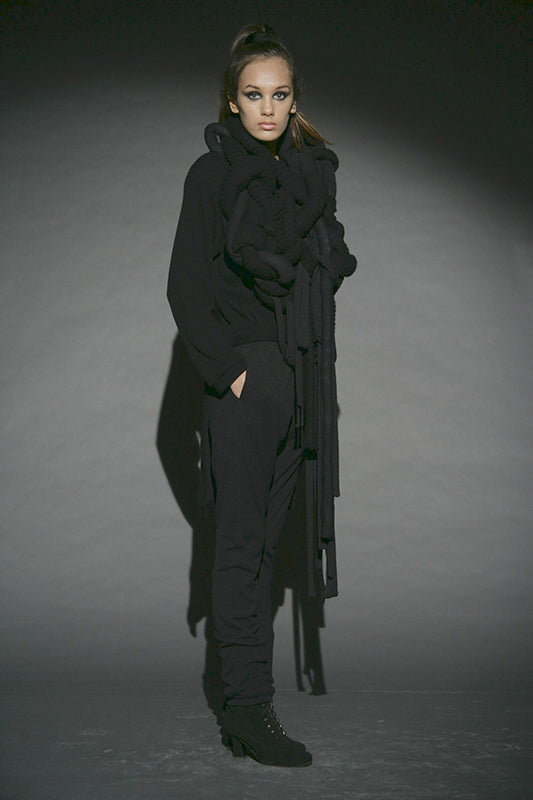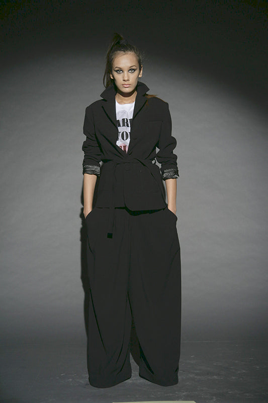 This collection redefines autumn/winter fashion with deconstructed silhouettes and accessories made from cutting remnants, revitalizing traditional forms. The contrast between transparency and opacity, along with the mix of thin and substantial textures, plays a key role. Dominated by black and grey with touches of yellow, it serves as a prelude to summer. The fusion of classic shapes with recycled accessories not only emphasizes sustainability but also creates a dynamic visual narrative.