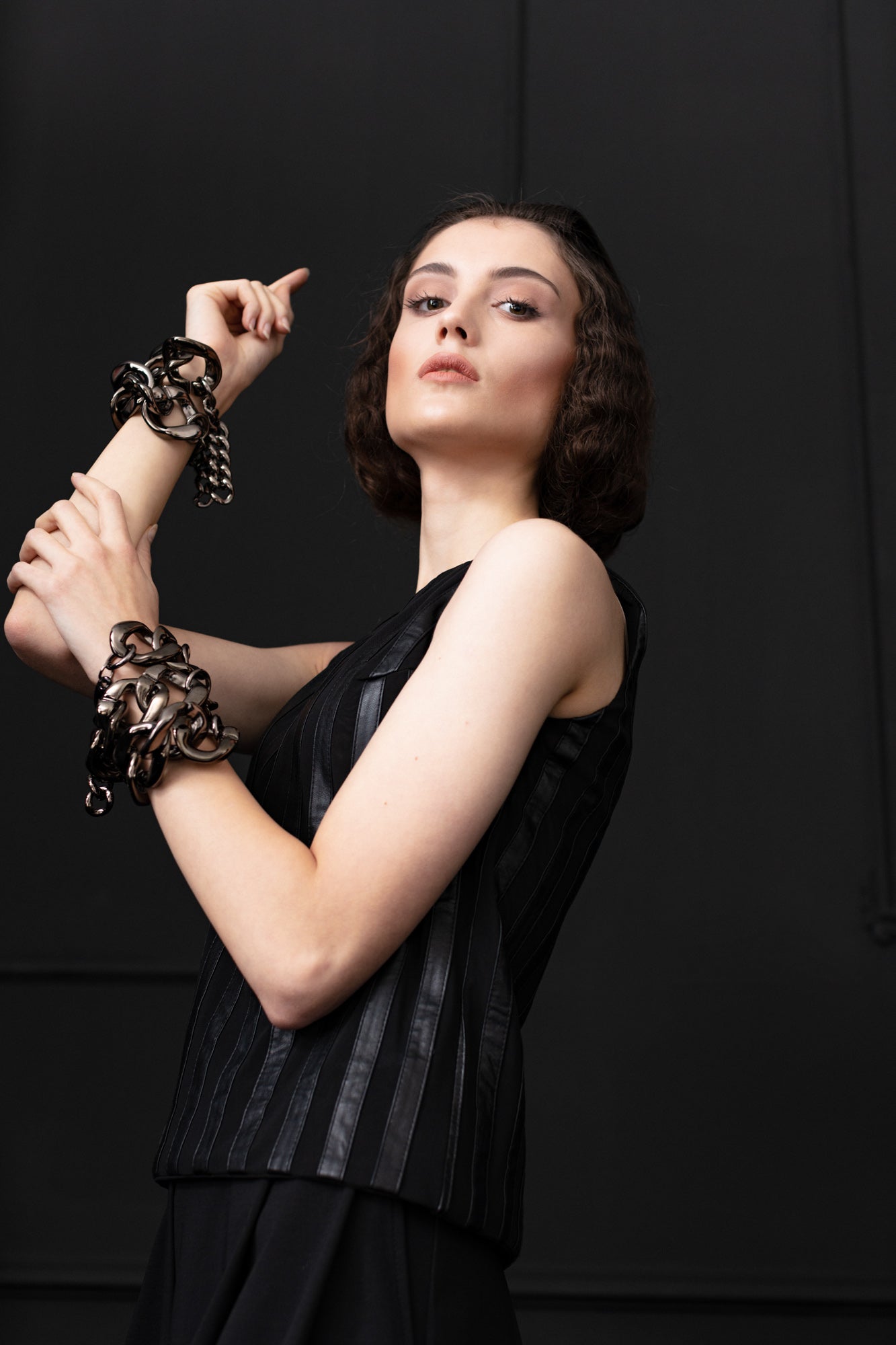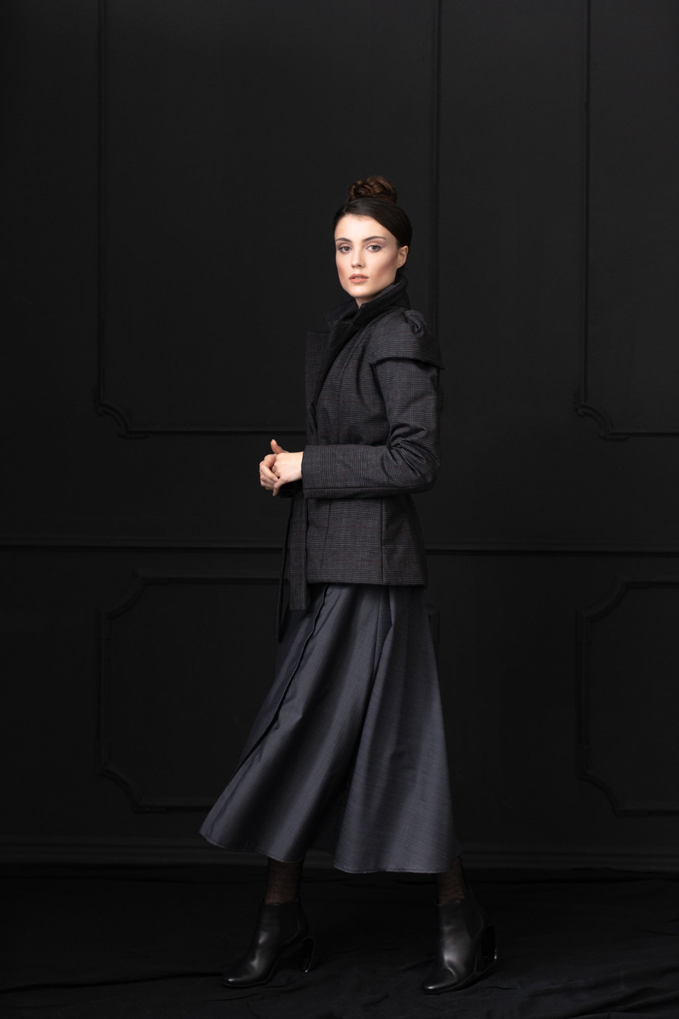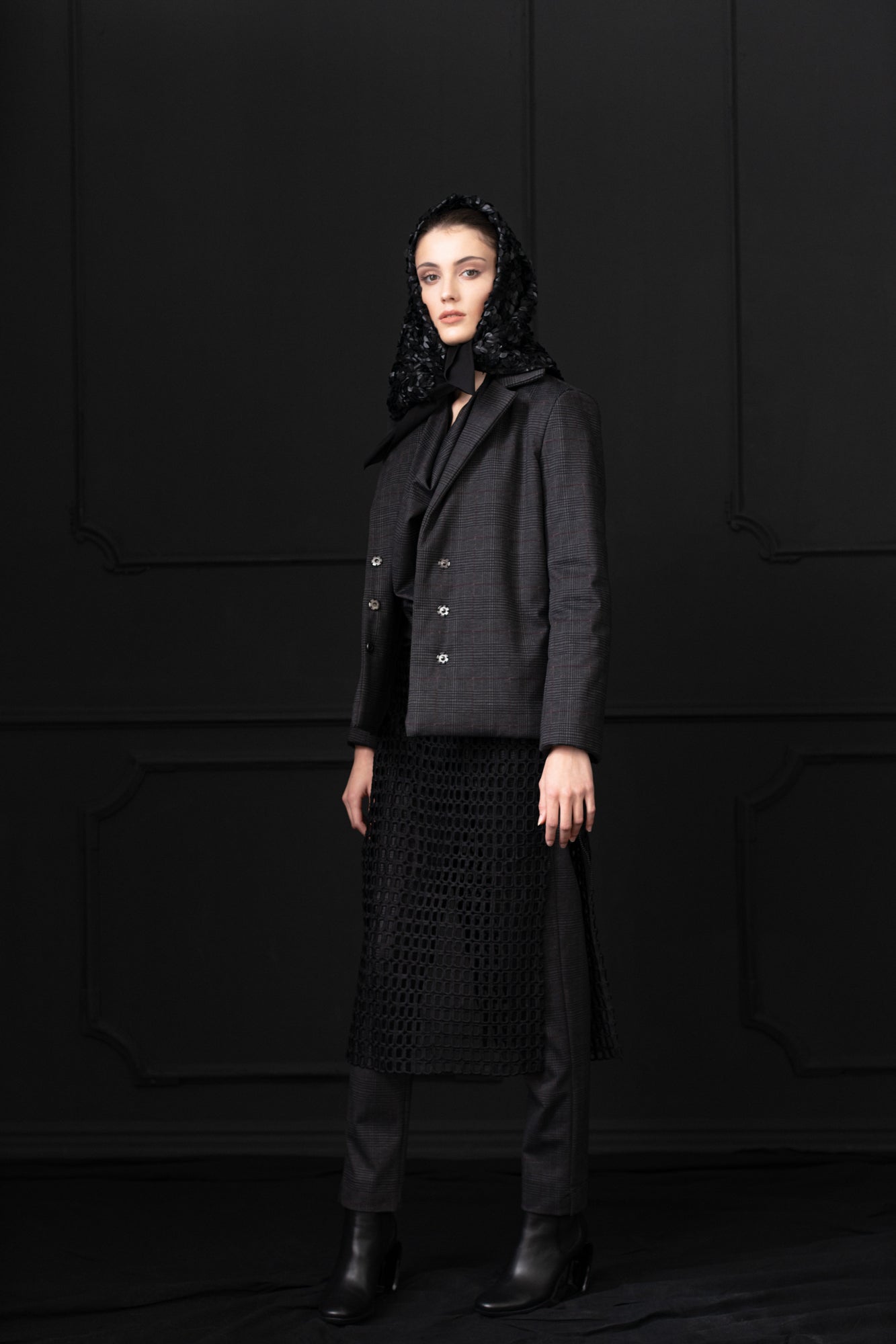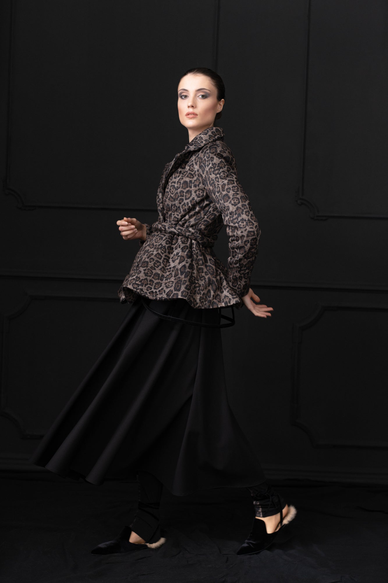 The "Seeds of Grace" collection is inspired by the belief that the key distinction between the expressions of men and women is grace. This grace, if applied in leading the world, could contribute to making it a better place. The collection draws inspiration from renowned Romanian women who have served as beacons of inspiration and role models. The materials used vary in texture and print, ranging from ultra-fine jersey to embossed leather and mesh.
