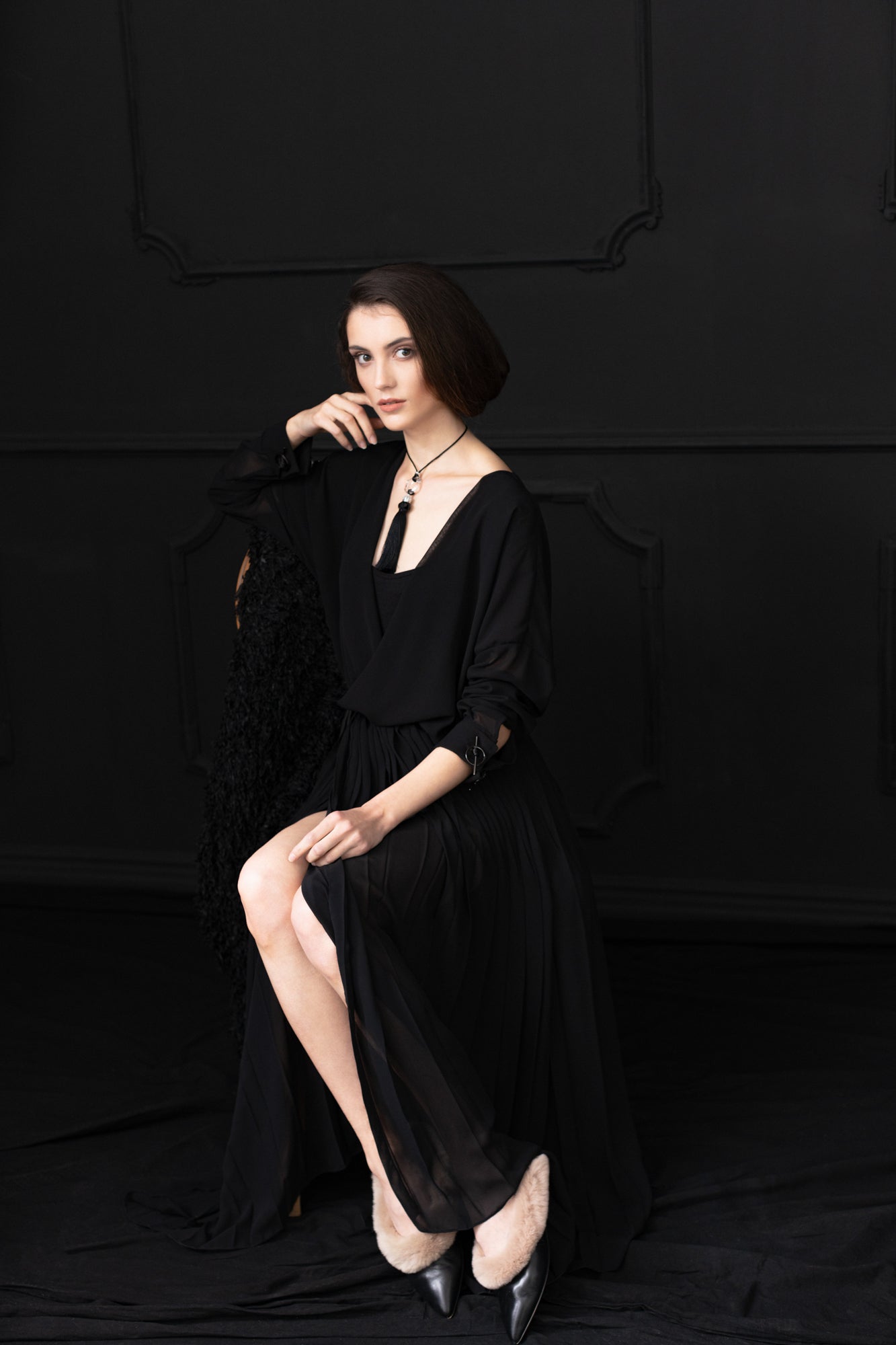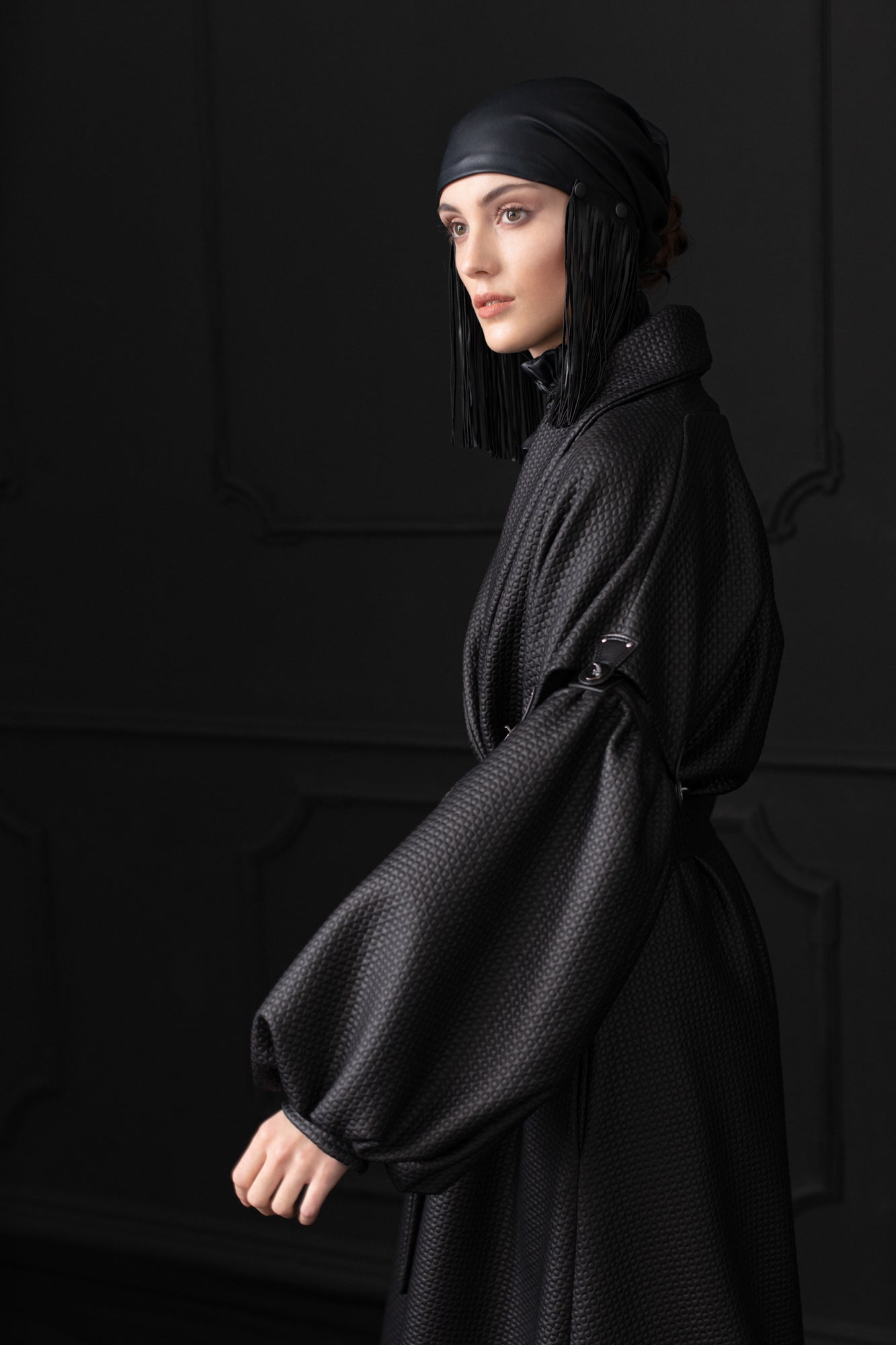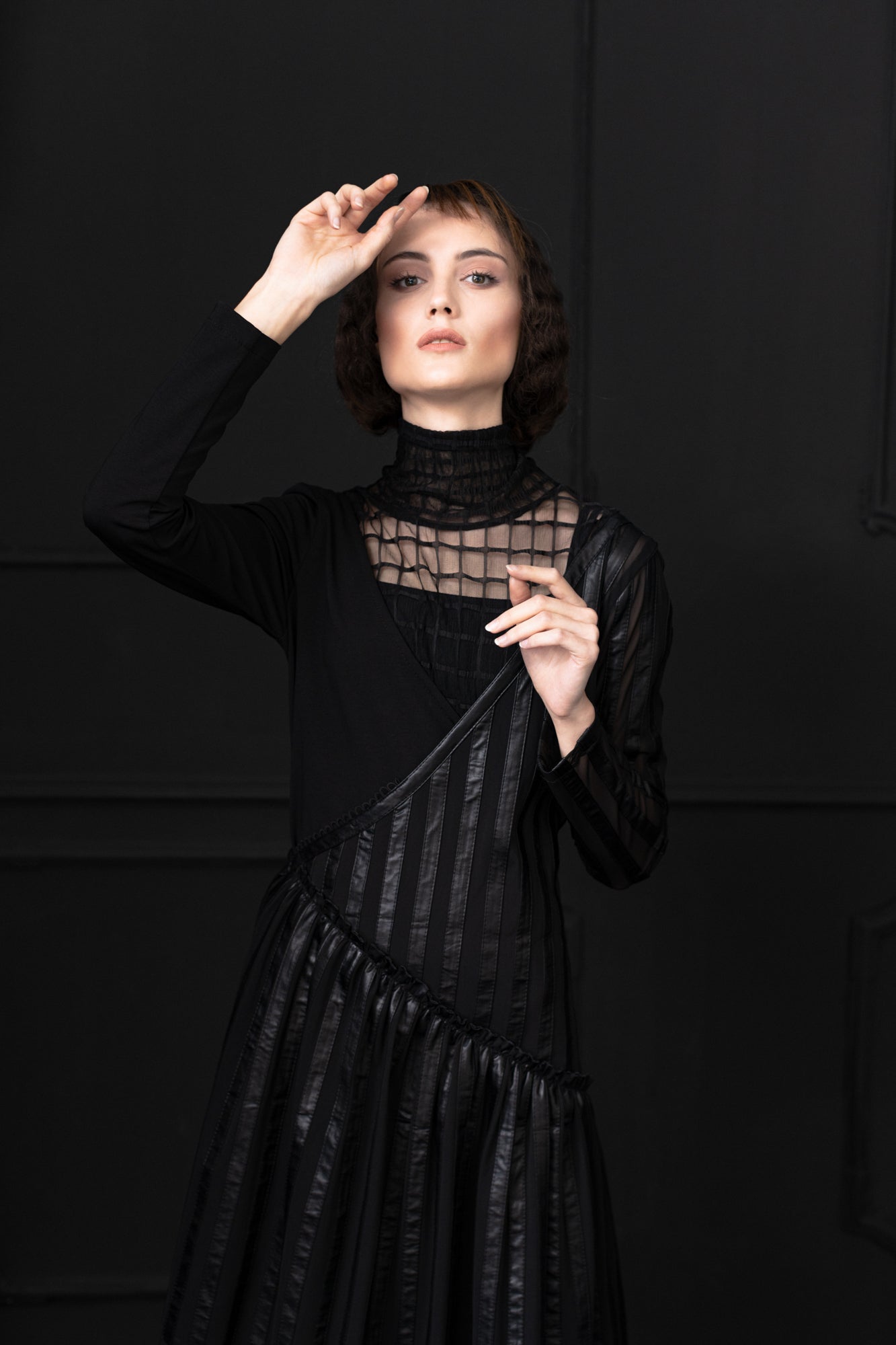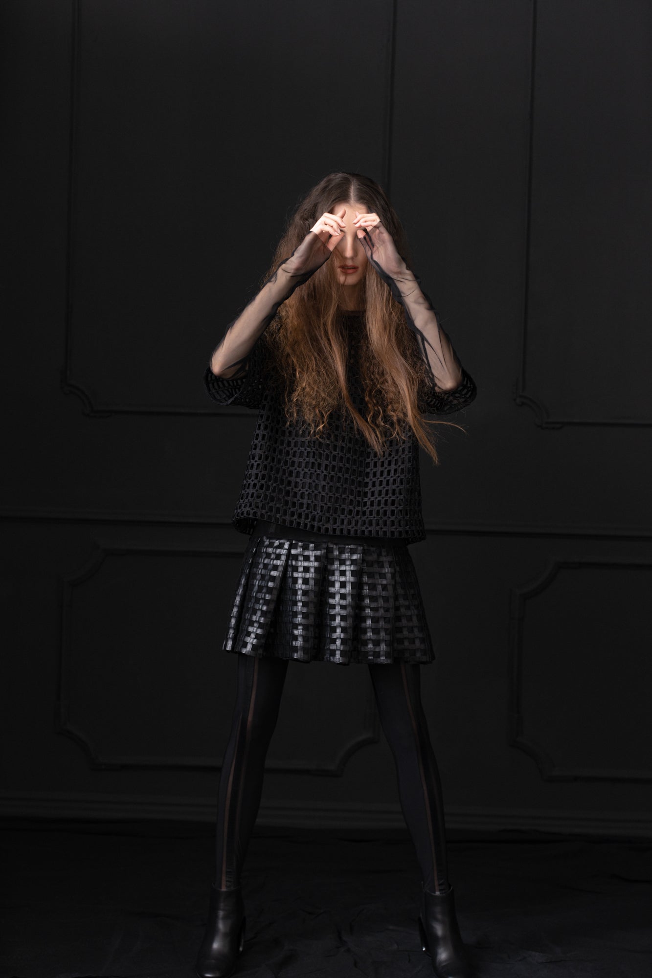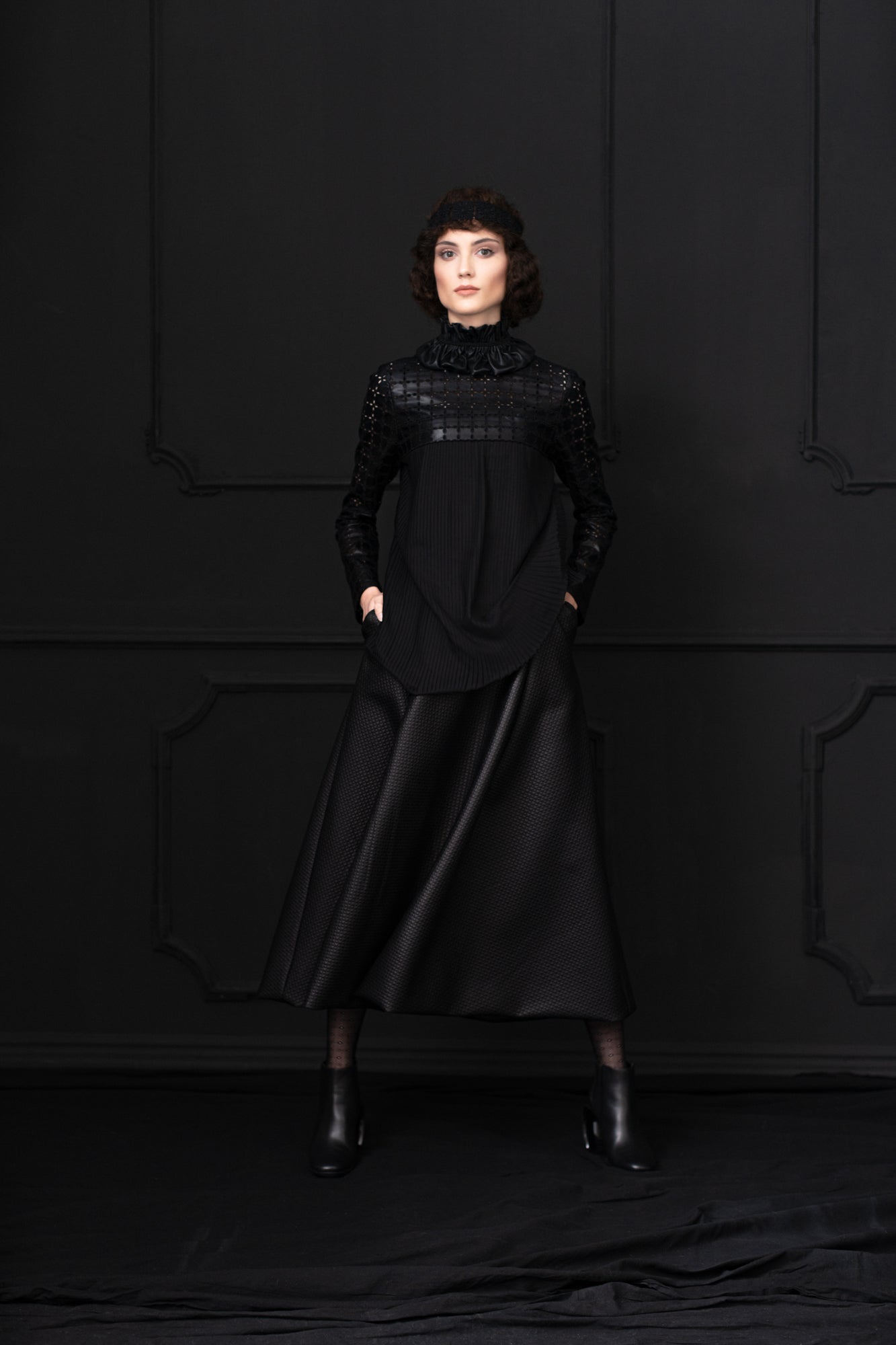 The "Seeds of Grace" collection is inspired by the belief that the key distinction between the expressions of men and women is grace. This grace, if applied in leading the world, could contribute to making it a better place. The collection draws inspiration from renowned Romanian women who have served as beacons of inspiration and role models. The materials used vary in texture and print, ranging from ultra-fine jersey to embossed leather and mesh.