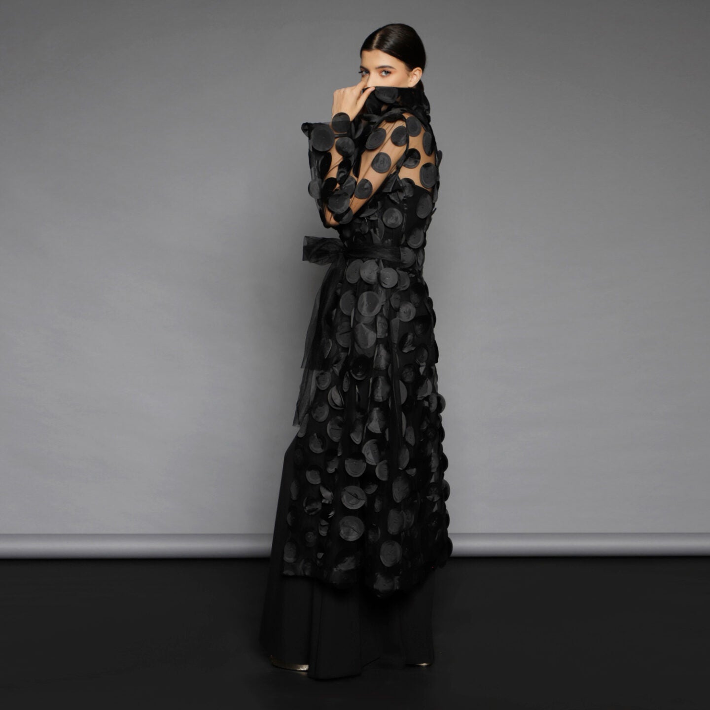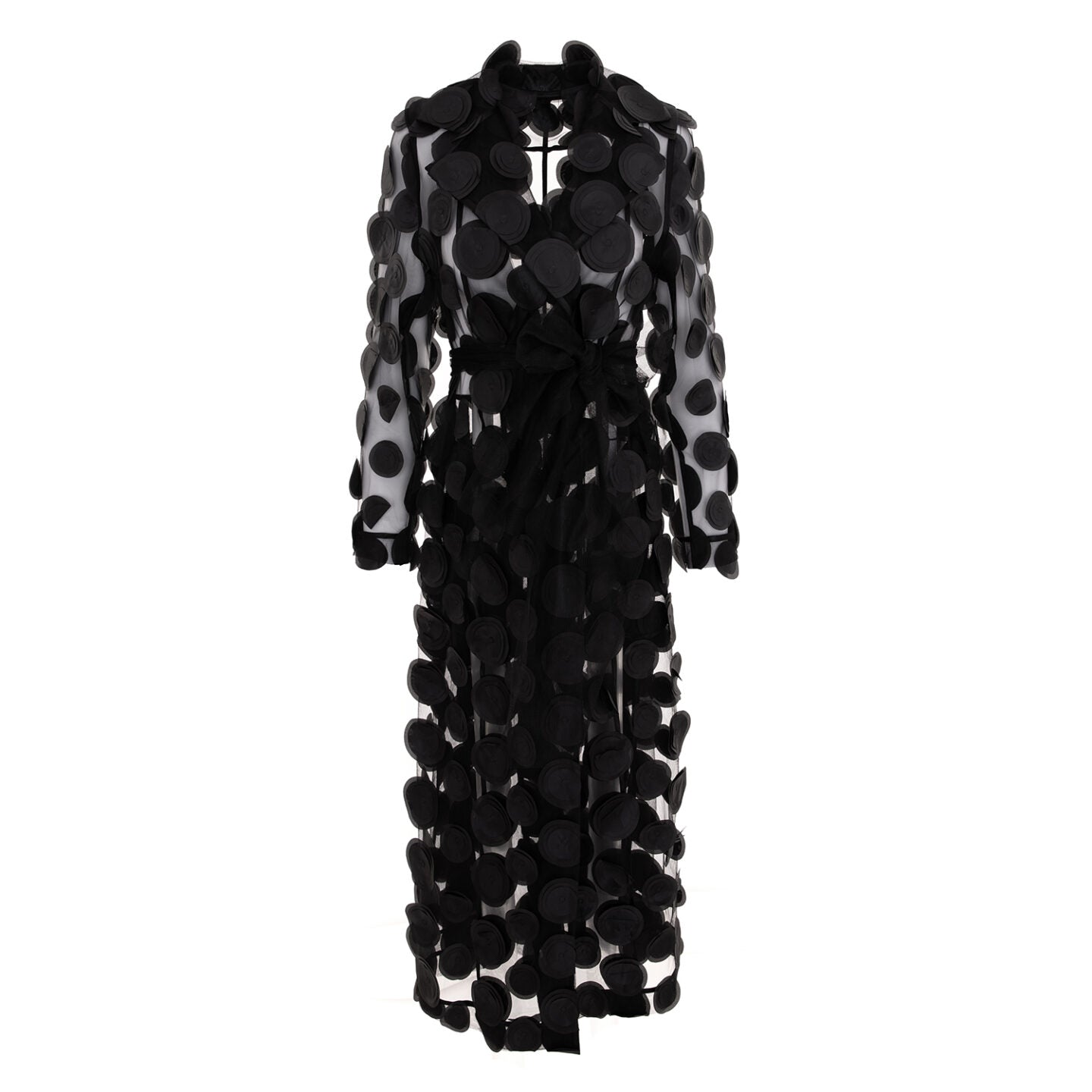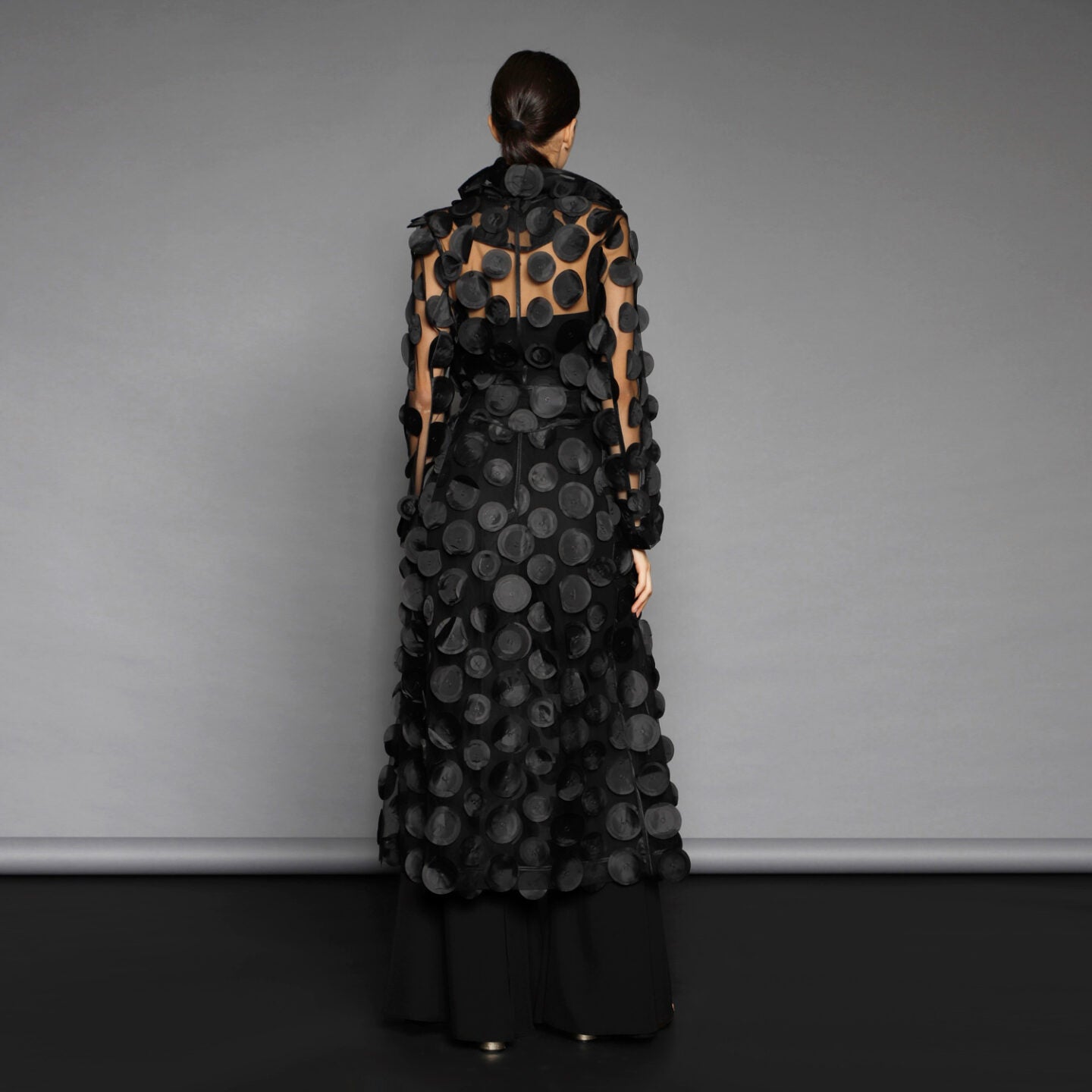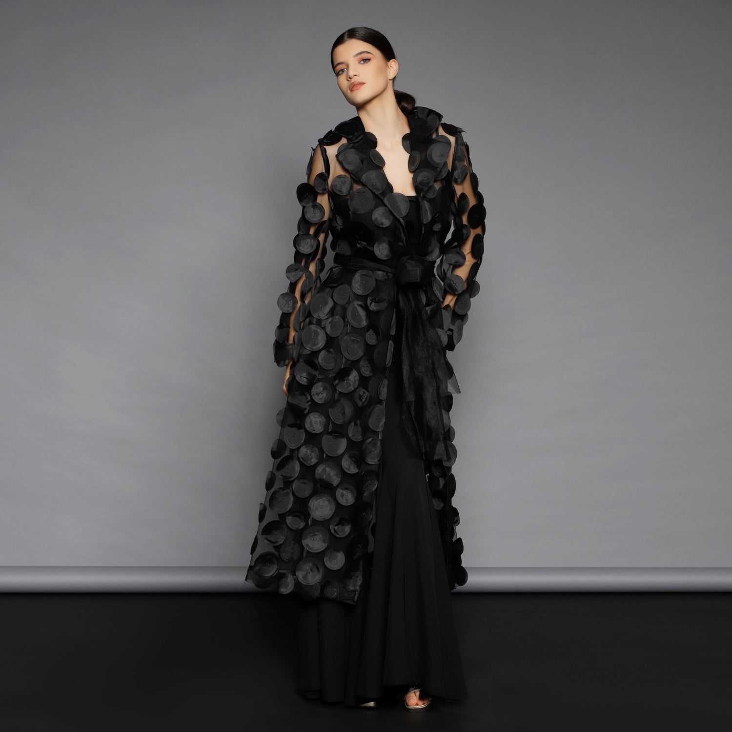 The A-line Trench Coat is crafted from tulle with overlapping 3D circle embellishments. This piece is a classic that will never go out of style, combining sophistication with a touch of modern flair.