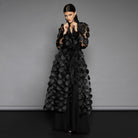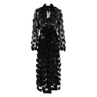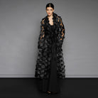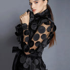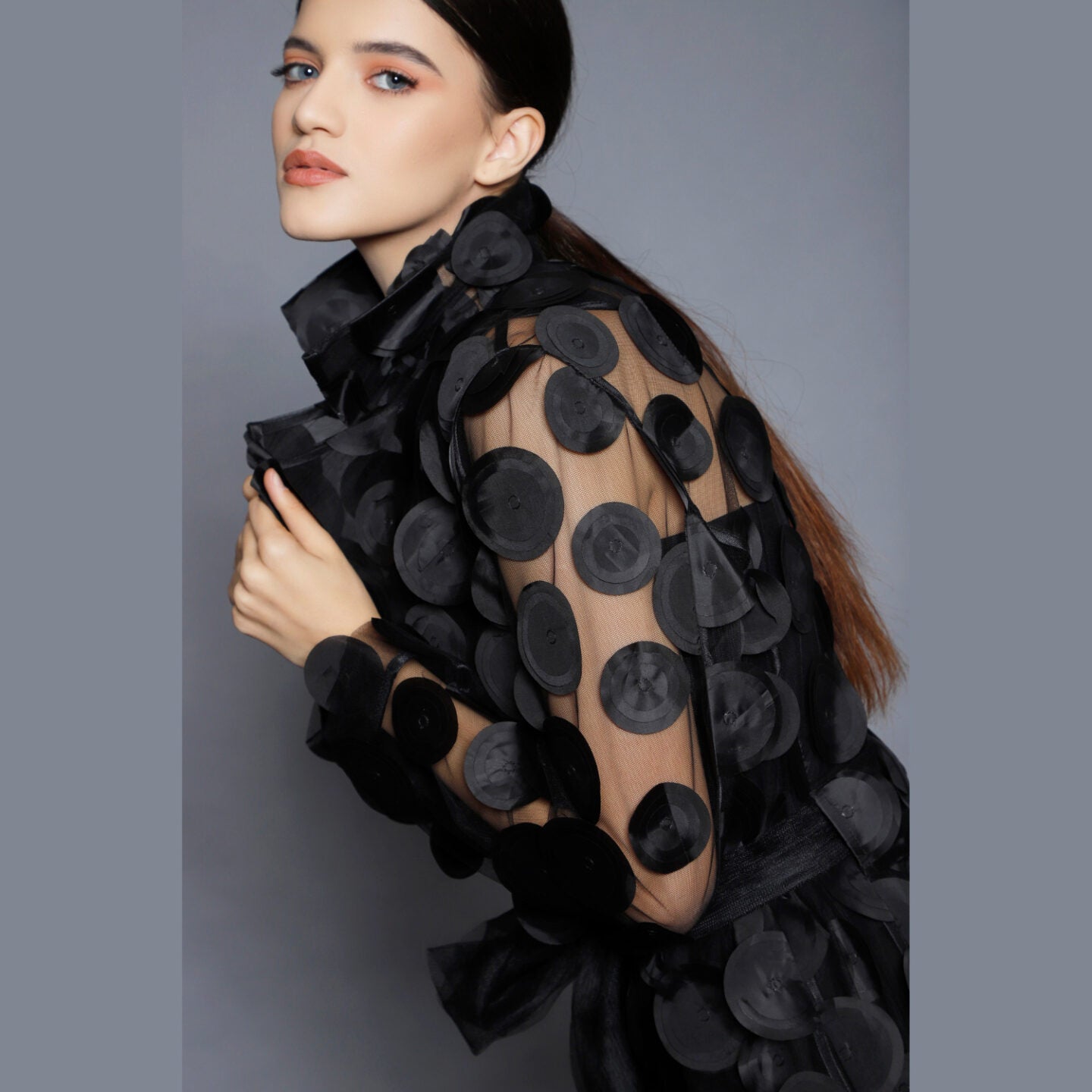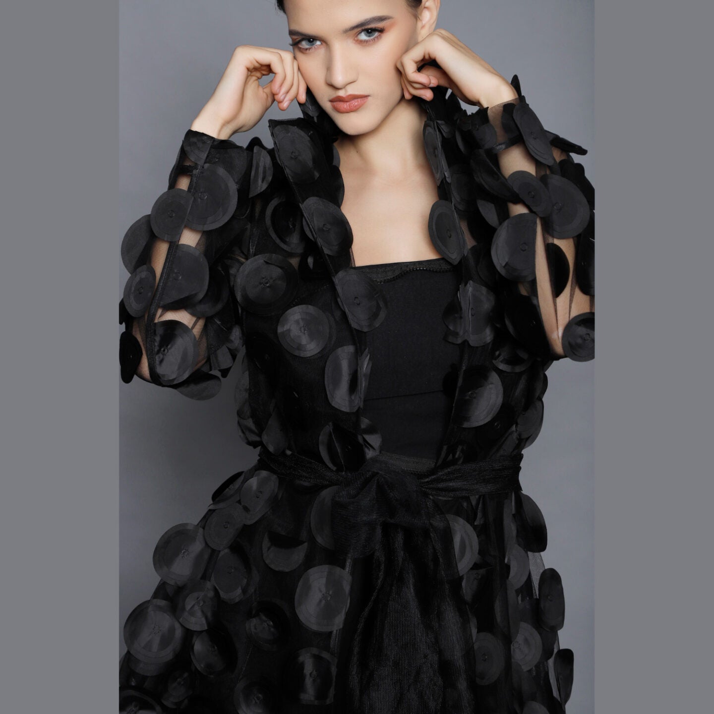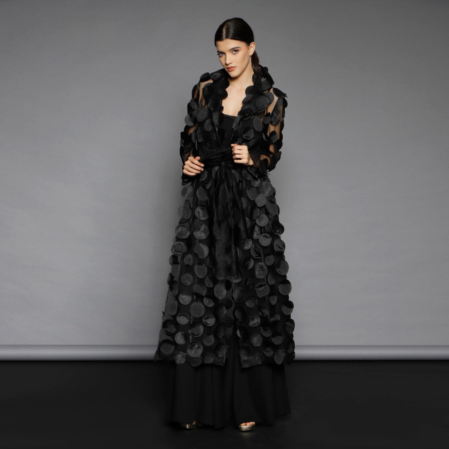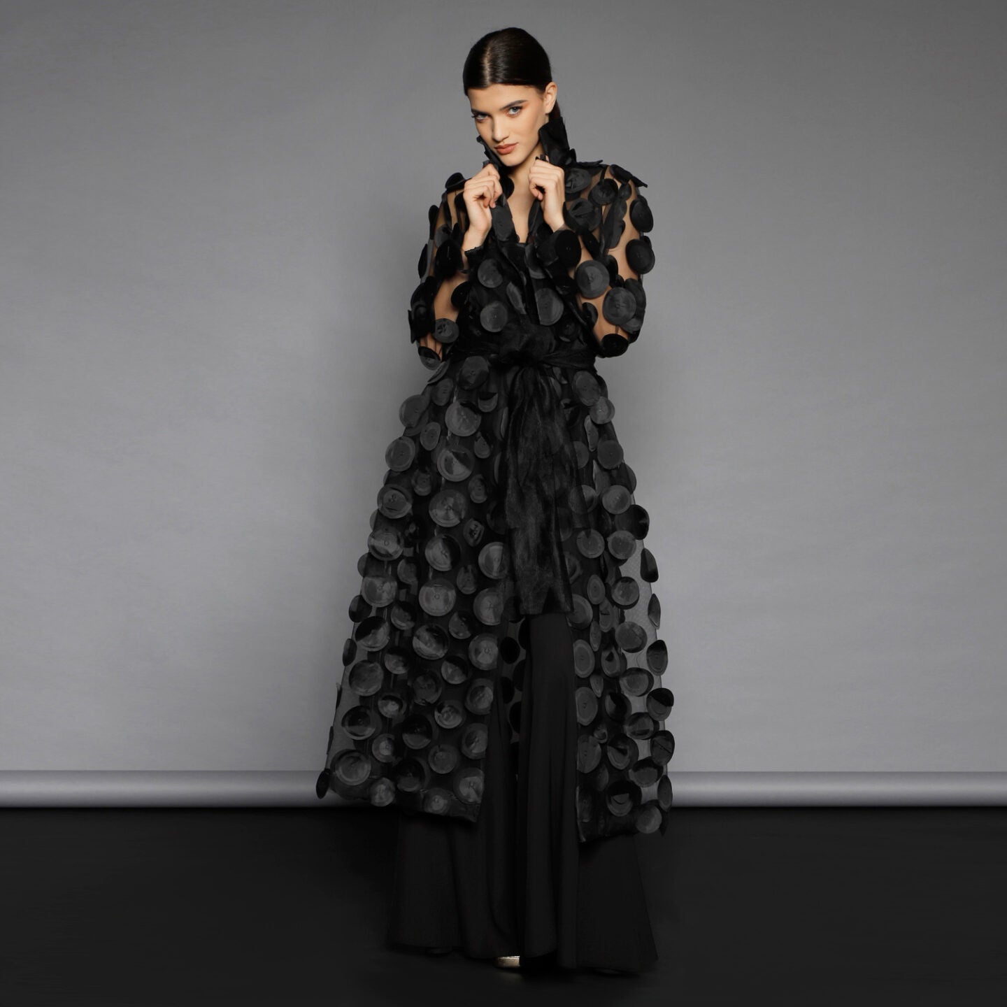 The A-line Trench Coat is crafted from tulle with overlapping 3D circle embellishments. This piece is a classic that will never go out of style, combining sophistication with a touch of modern flair.