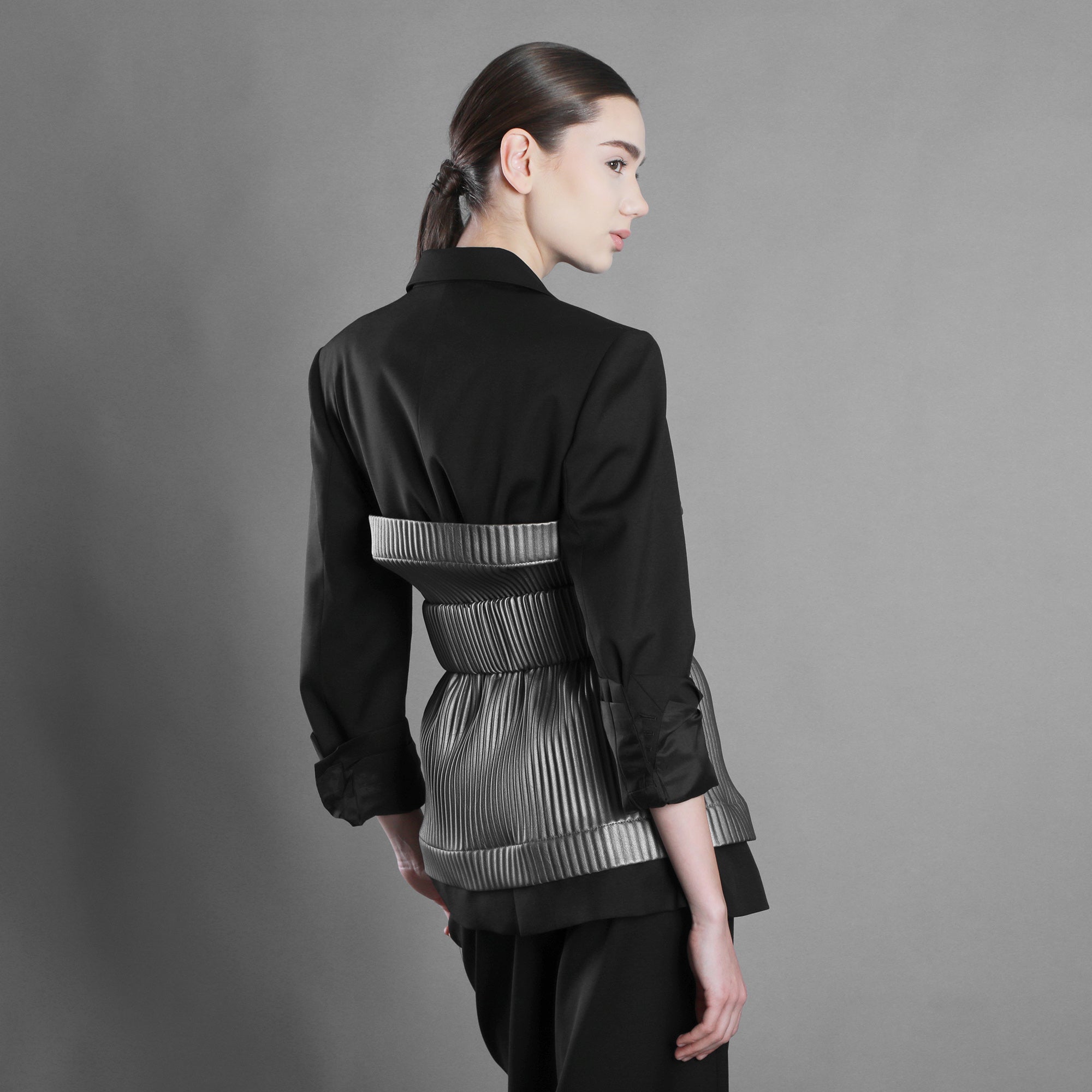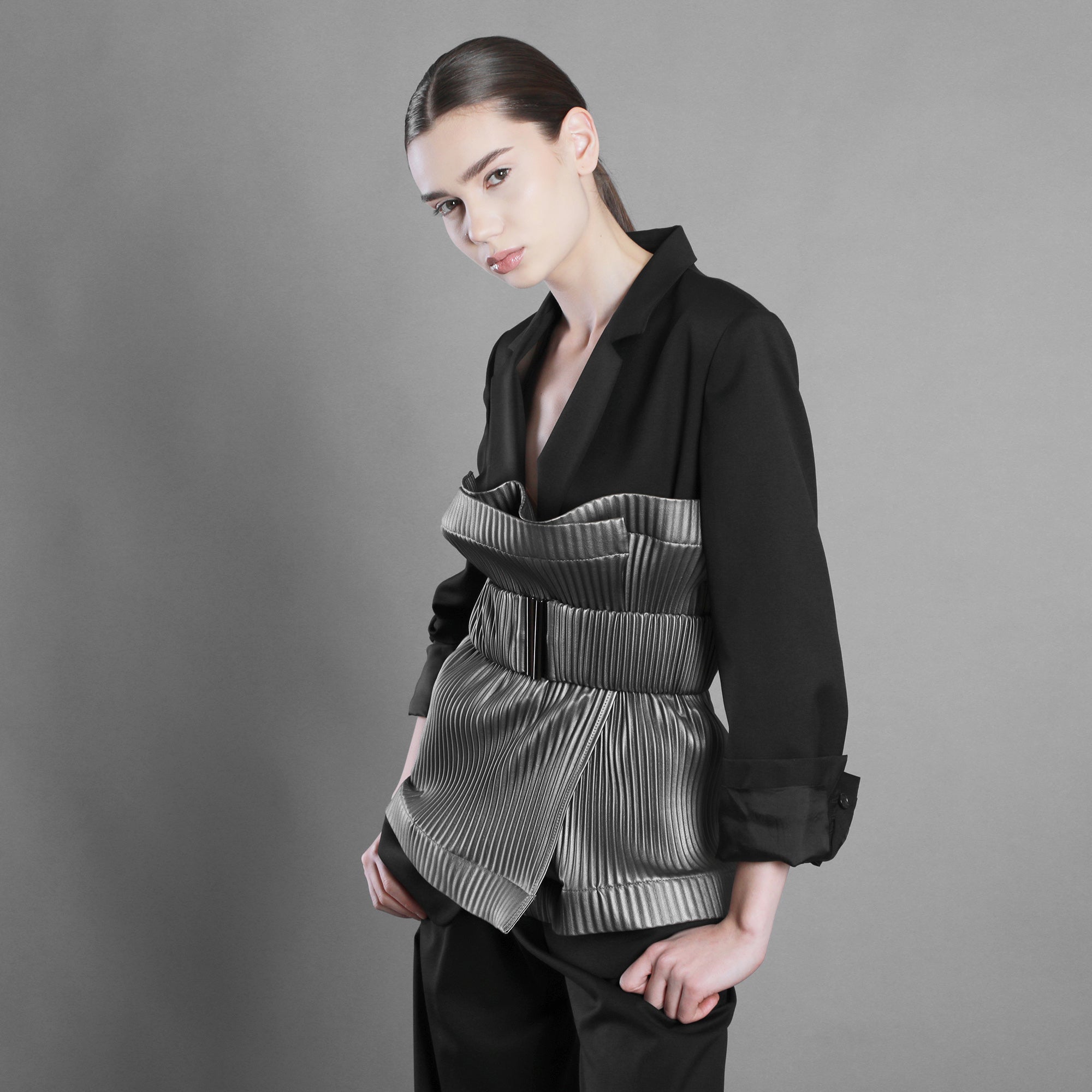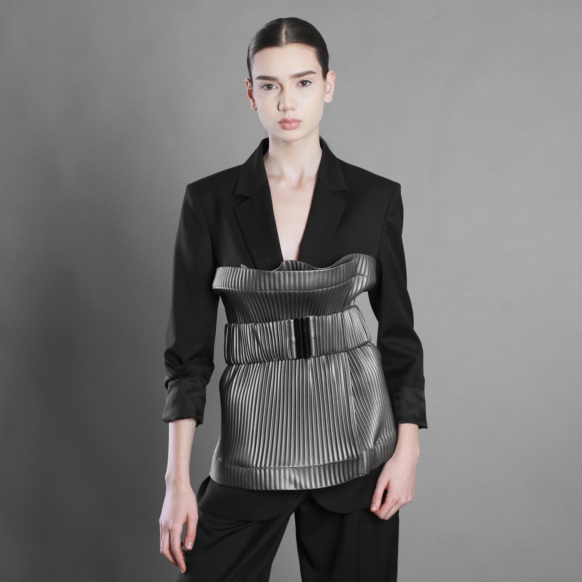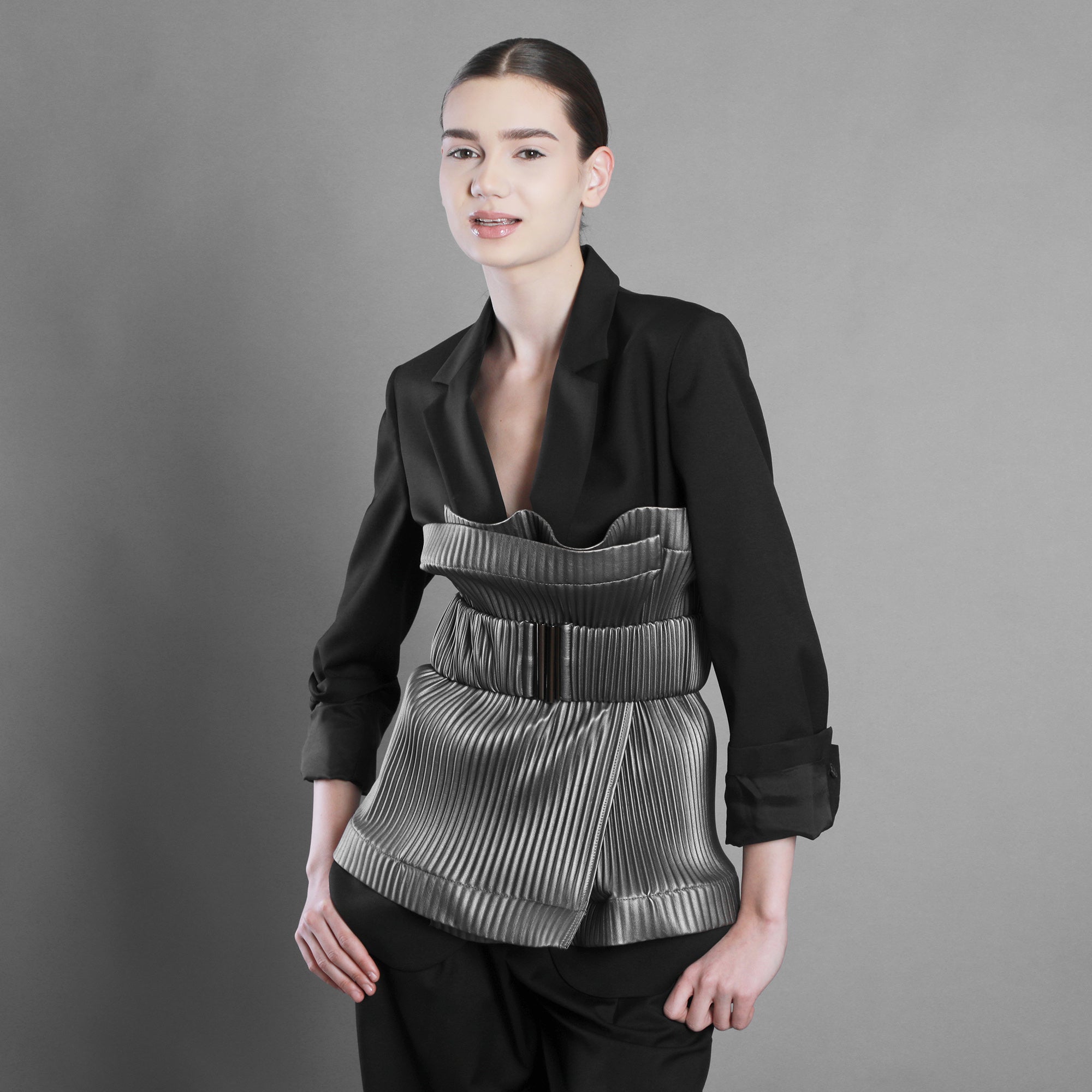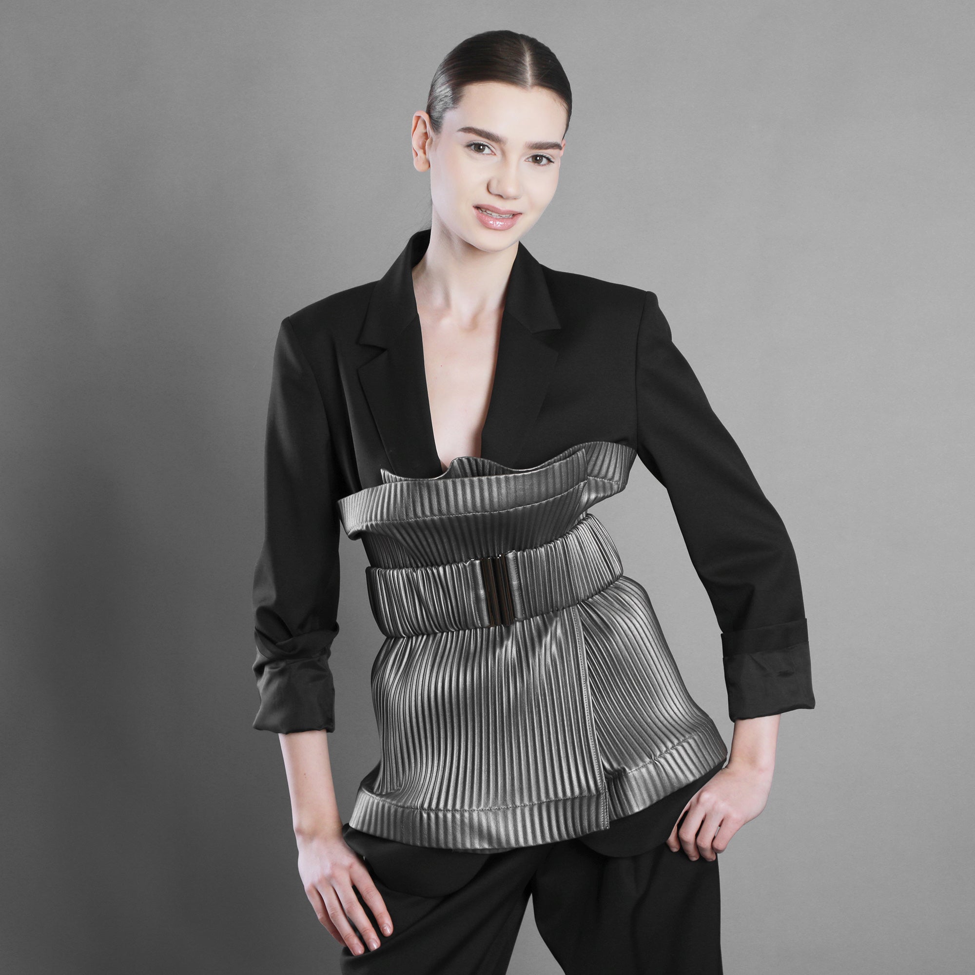 Brâul din piele eco plisată aduce structură acestei energii. Pliseurile devin mai ferme, mai arhitecturale, sculptând talia cu intenție. Mai puțină fluiditate, mai multă afirmație.