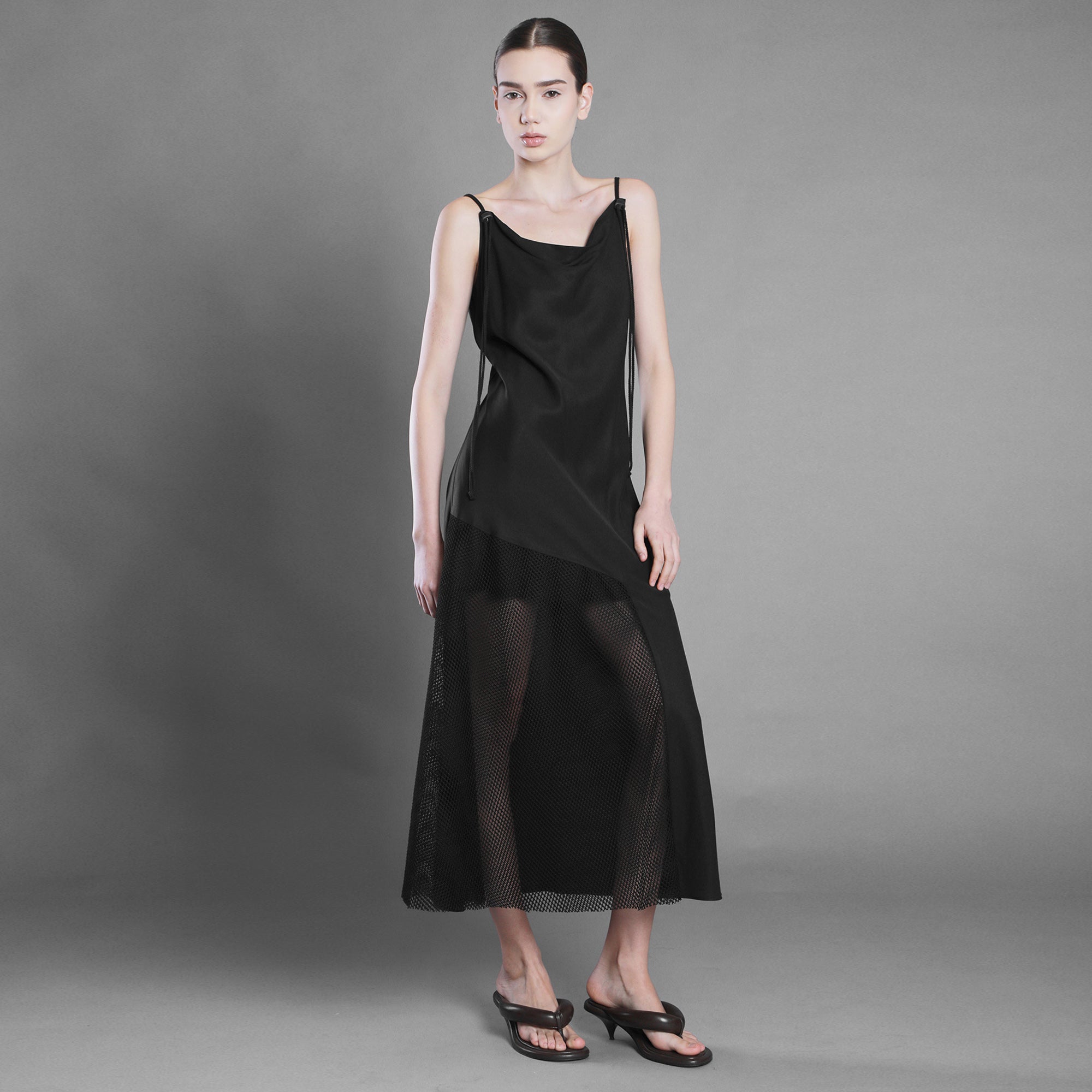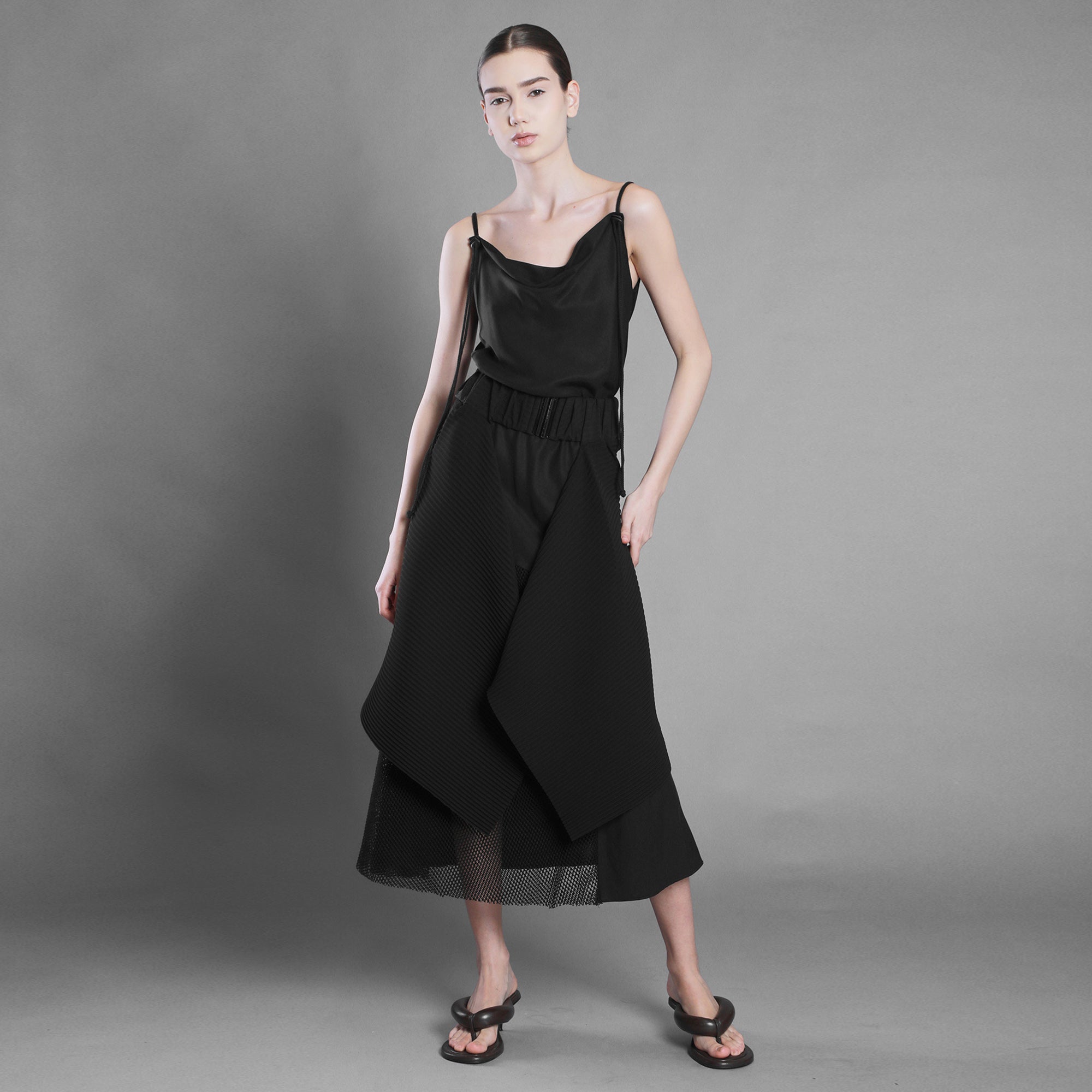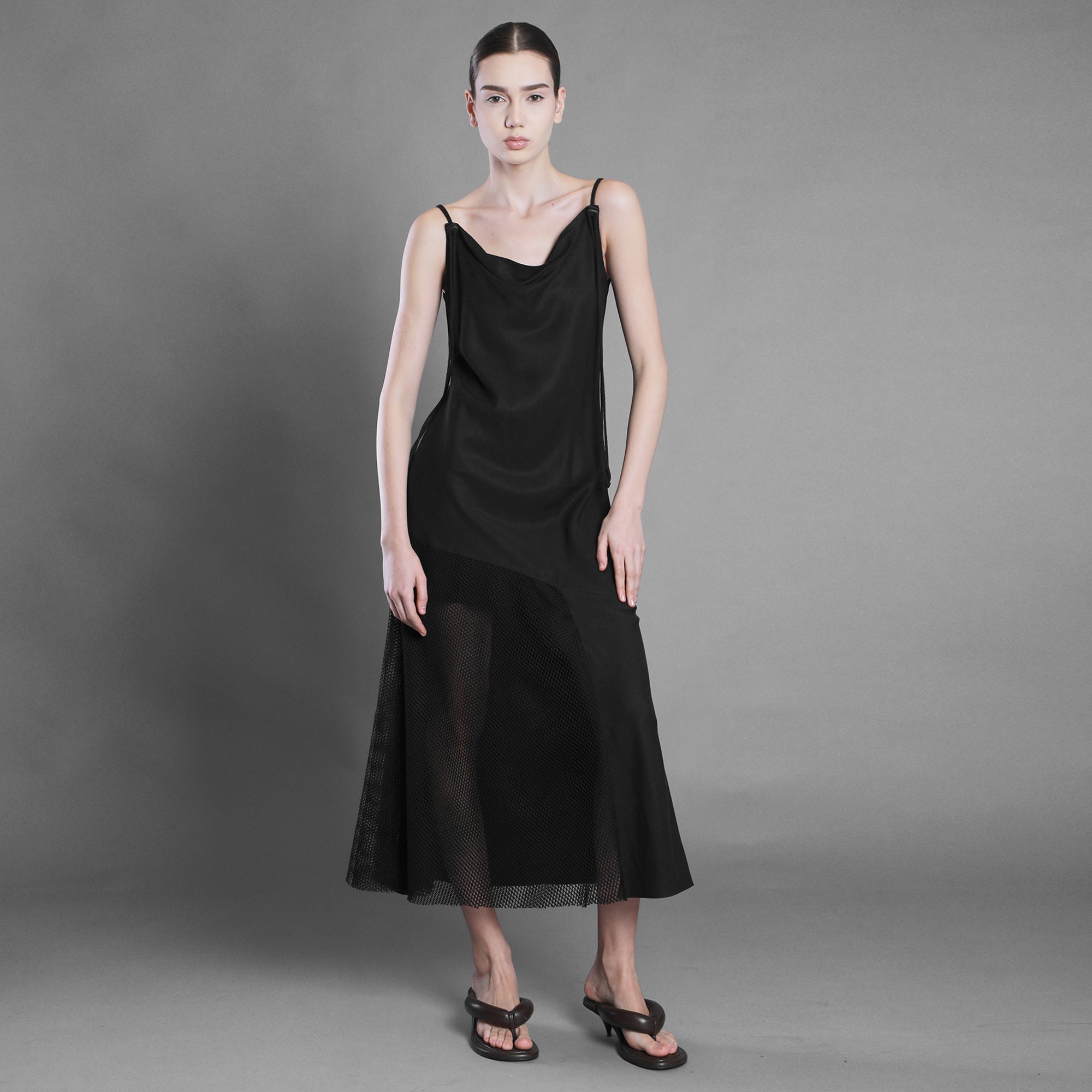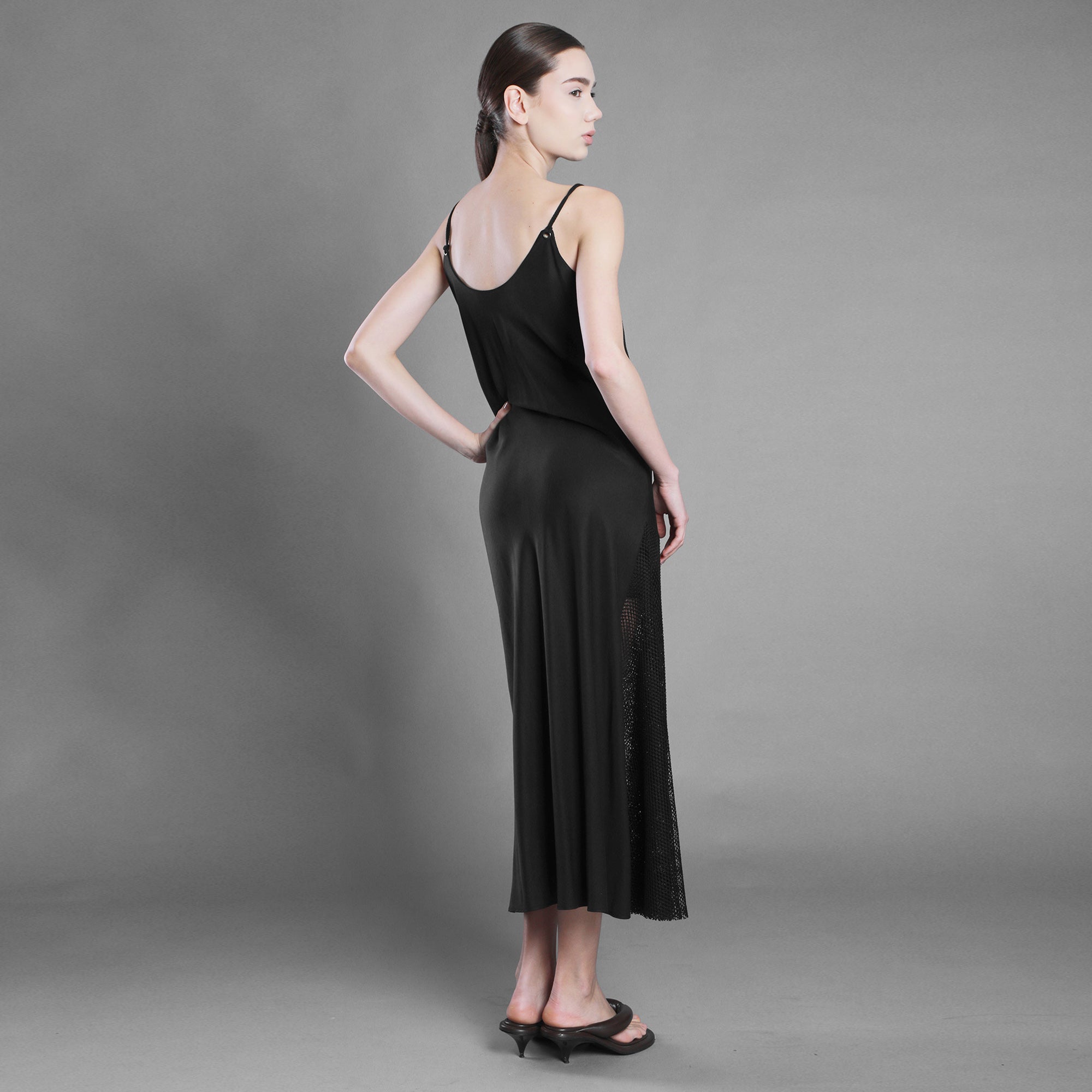Tencel negru, cu inserții din plasă din poliester. Dublată cu vâscoză.