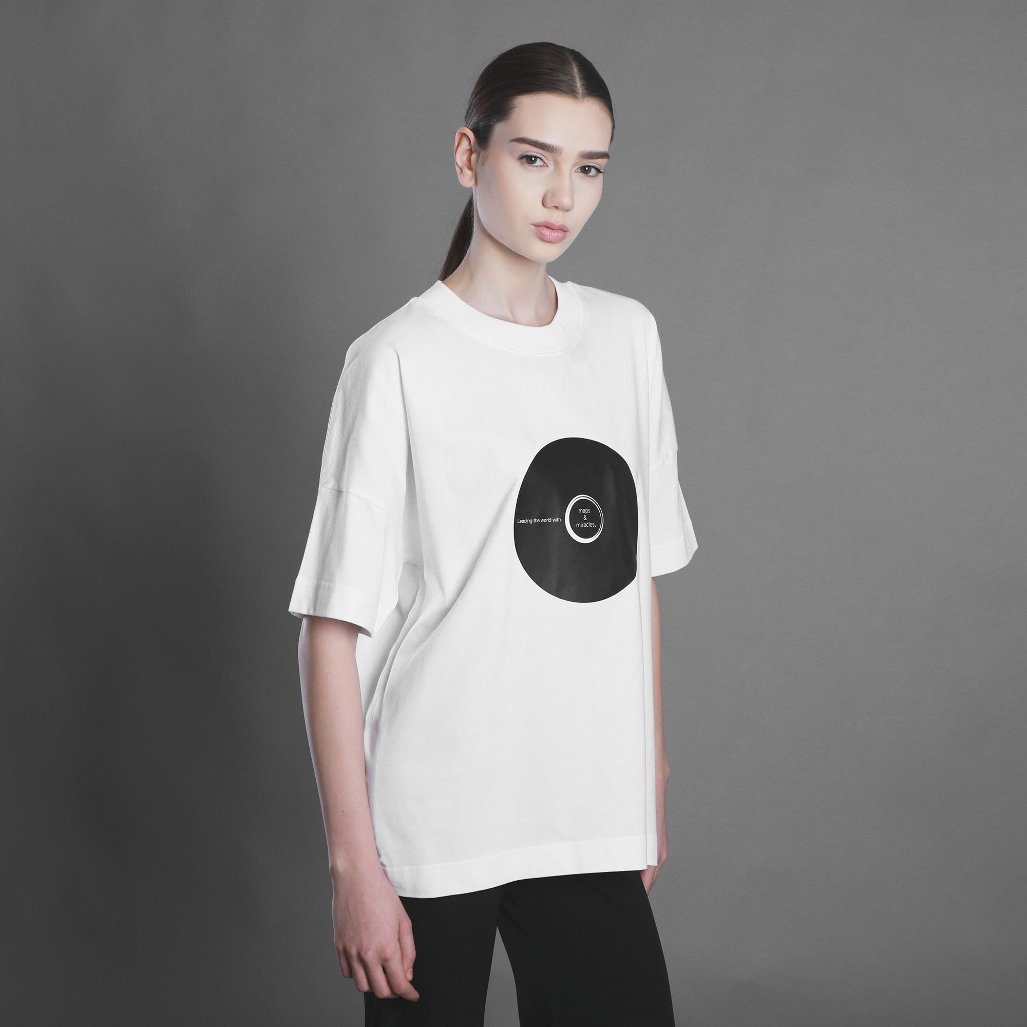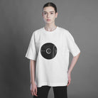 Tricouri oversize, albe, cu print negru. Unisex.