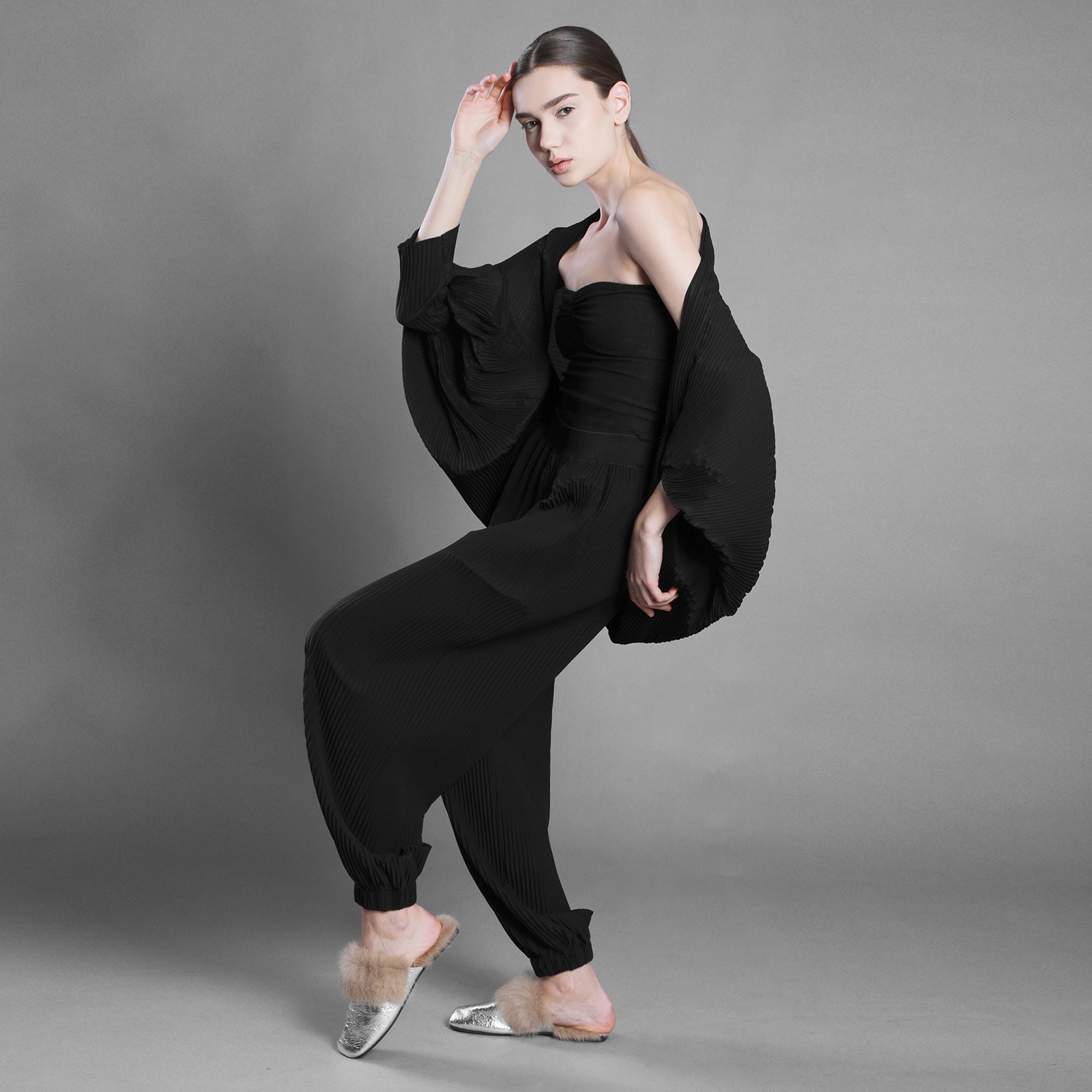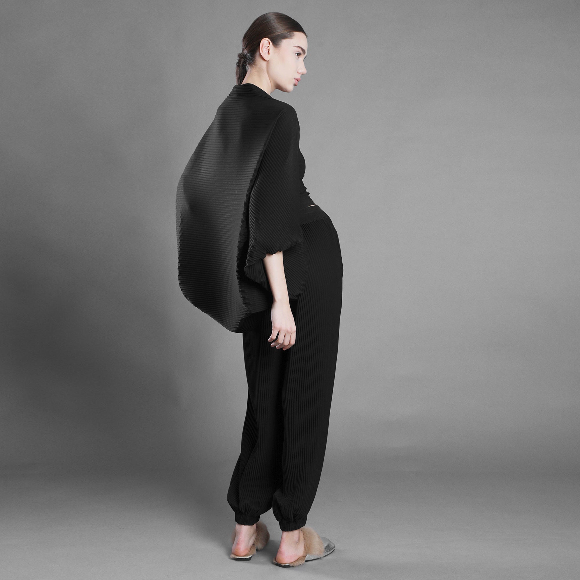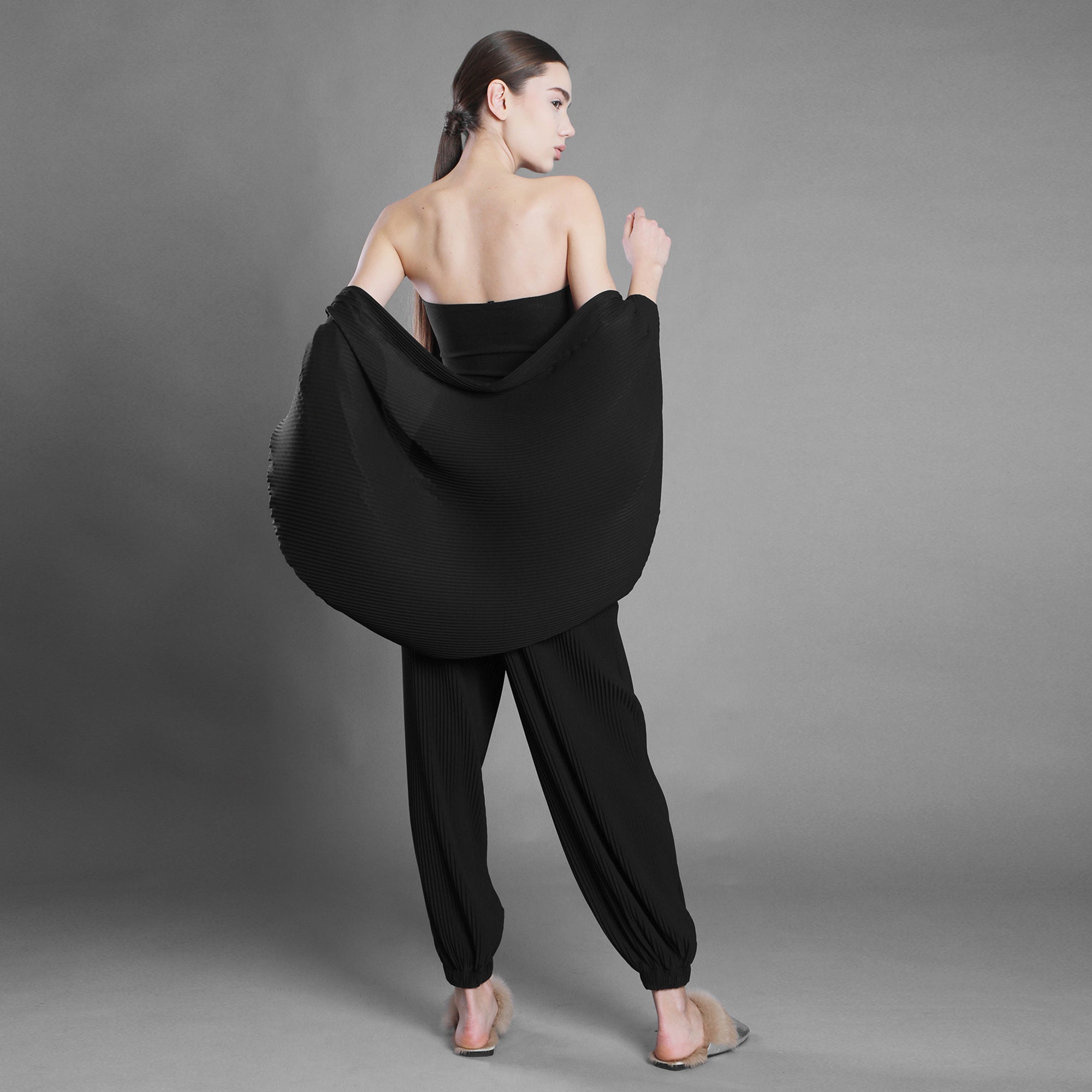 Șalul din voal negru plisat cade fluid, aproape ritualic.