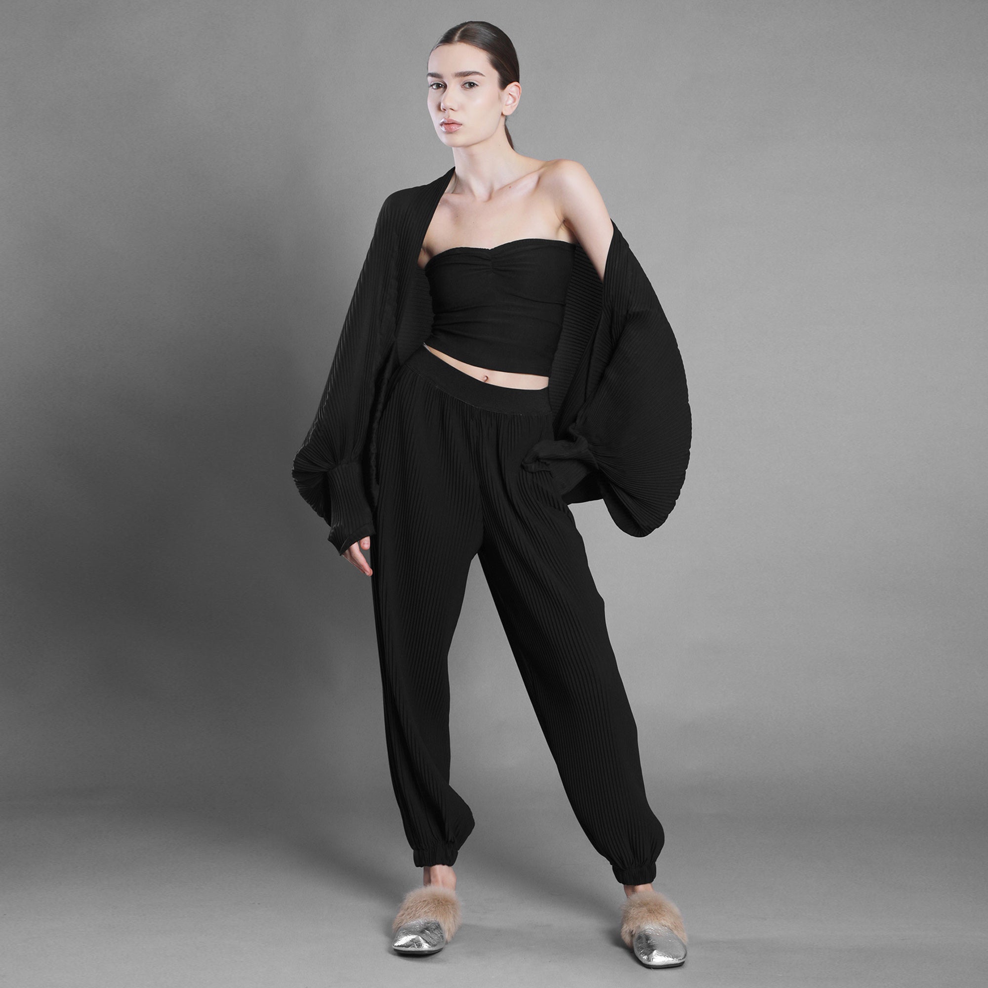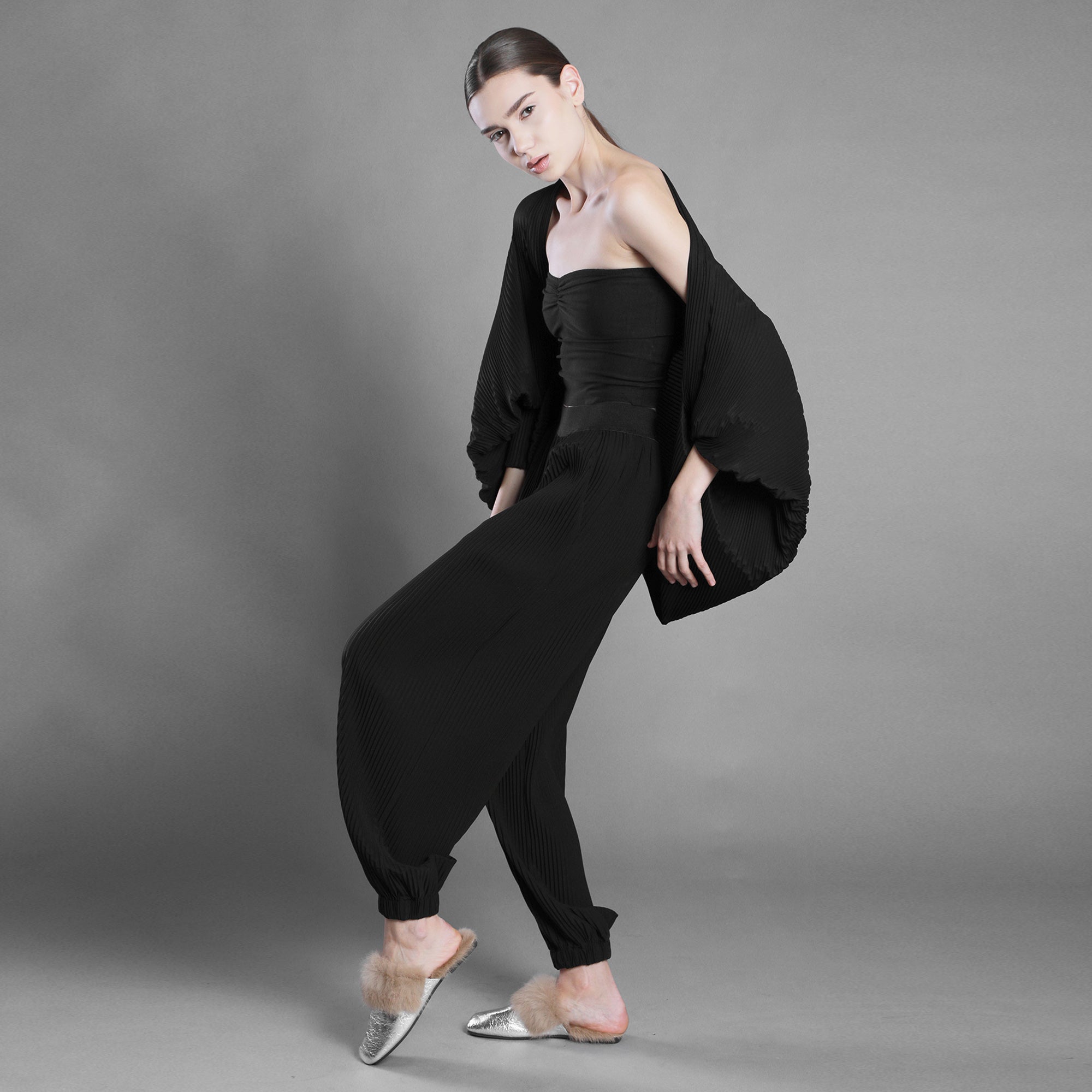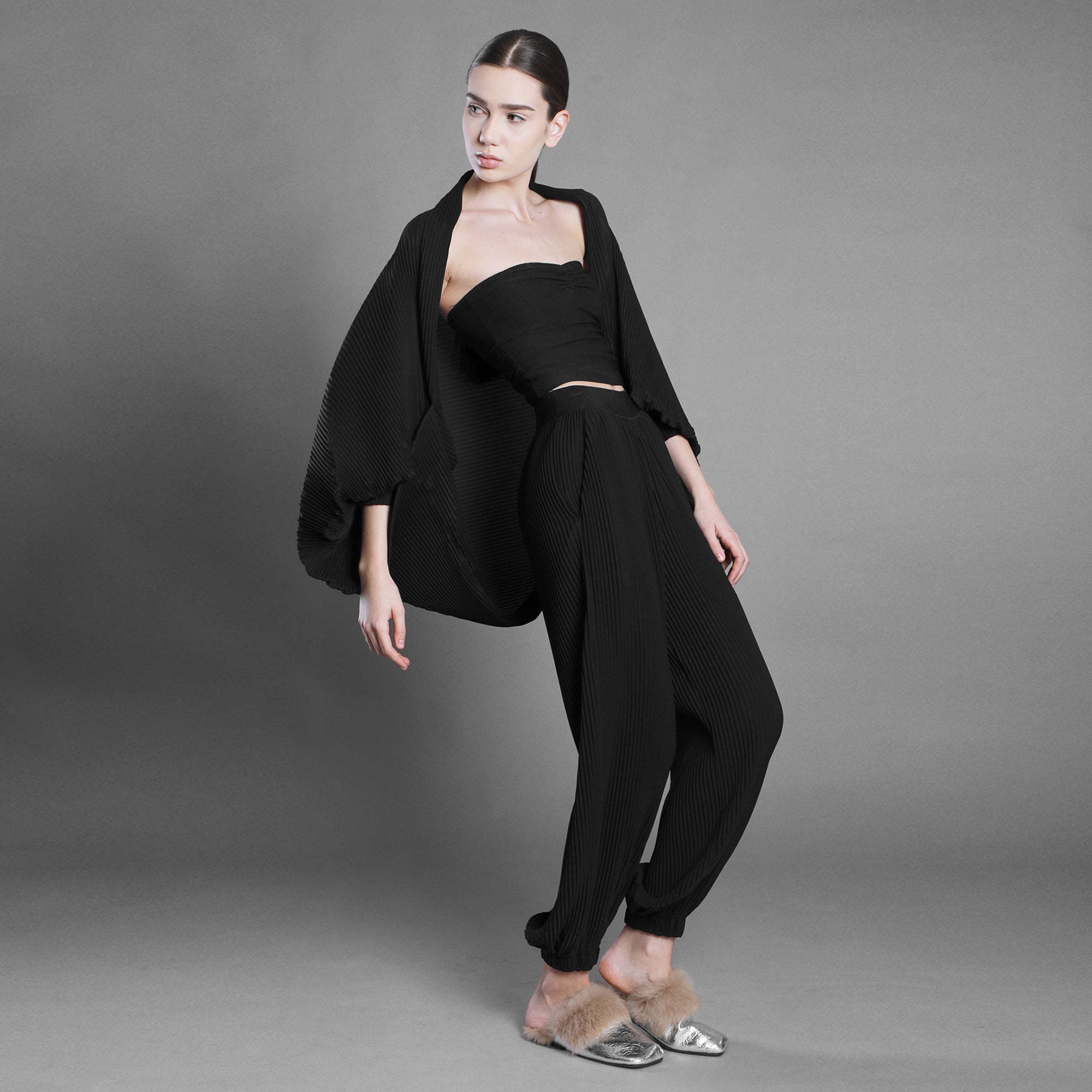 Șalul din voal negru plisat cade fluid, aproape ritualic.