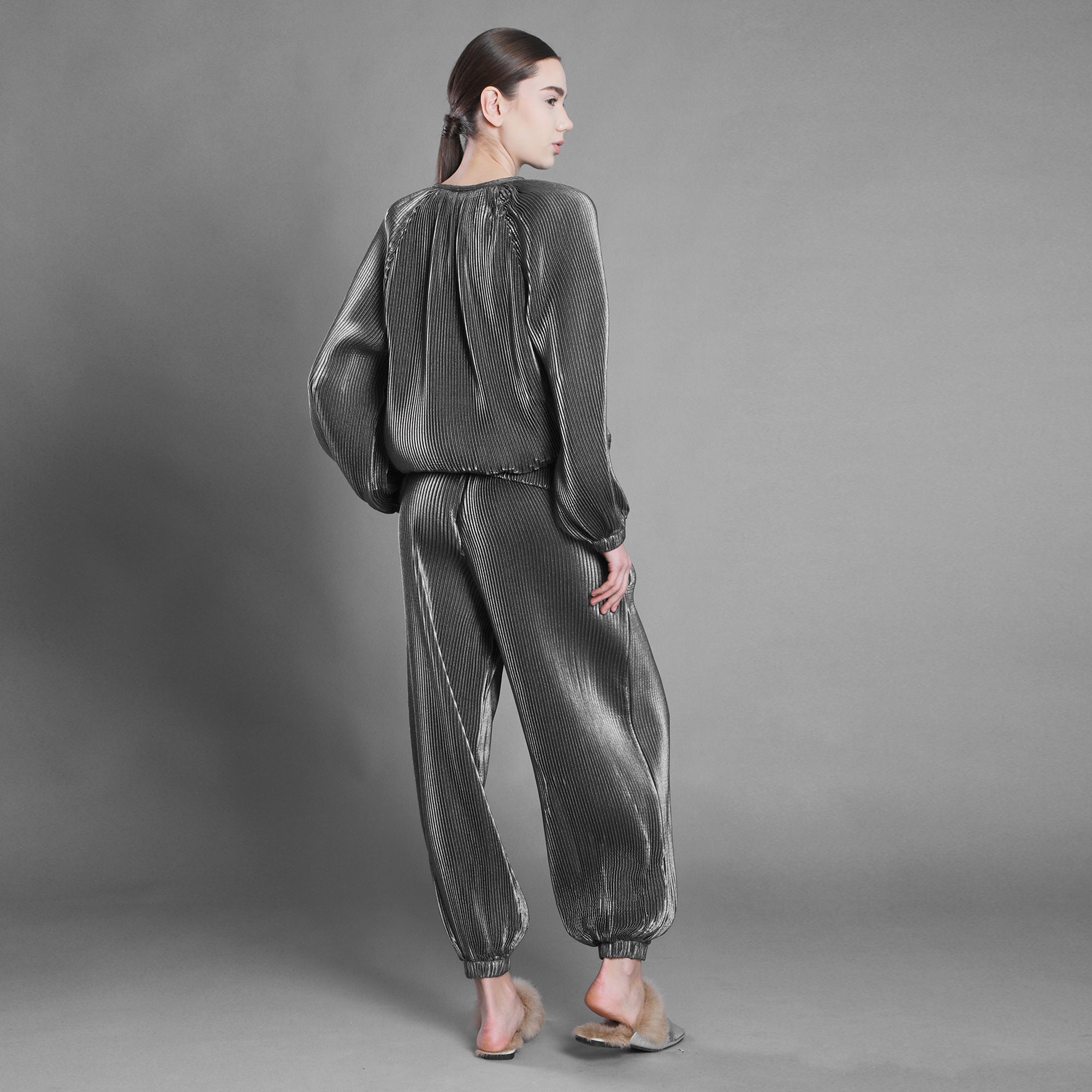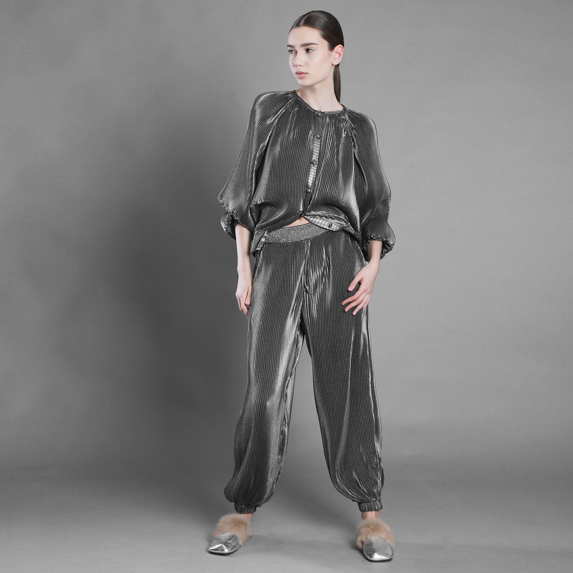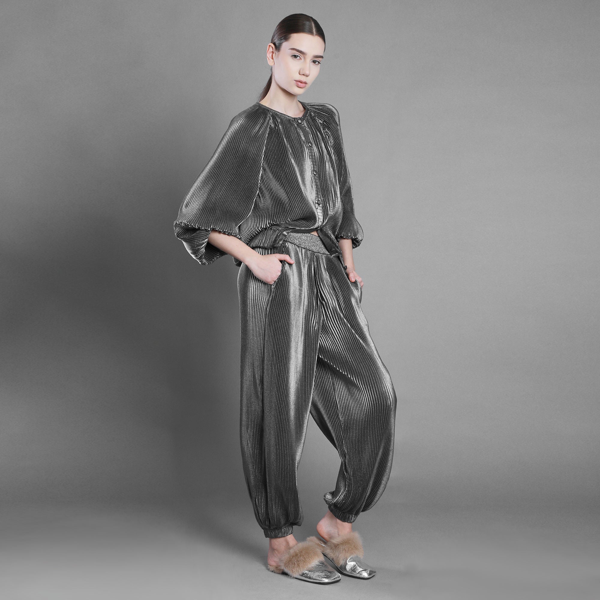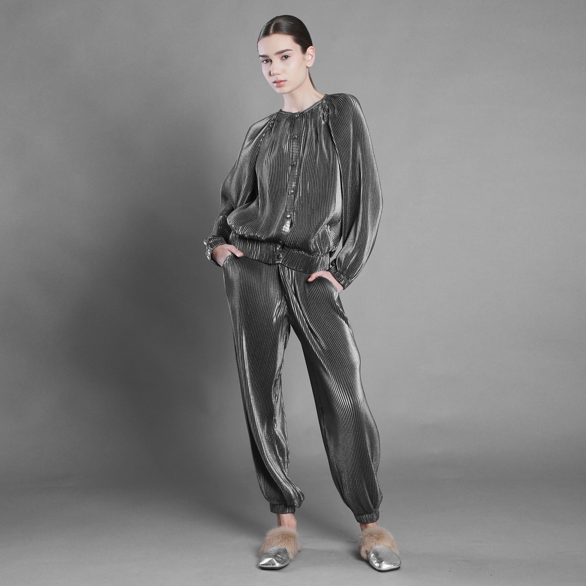 Bomberul din voal argintiu plisat surprinde această energie în mișcare. Materialul creează cute și volume intrigante, schimbând forma odată cu lumina și cu pasul tău. Este lejer, dar nu fragil. Fluid, dar cu prezență.