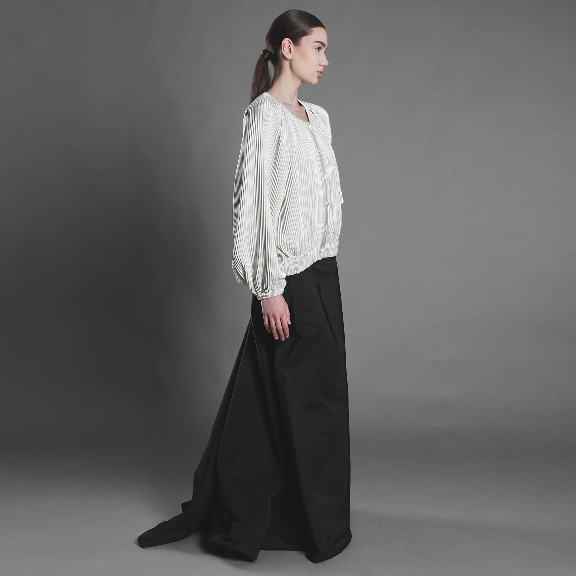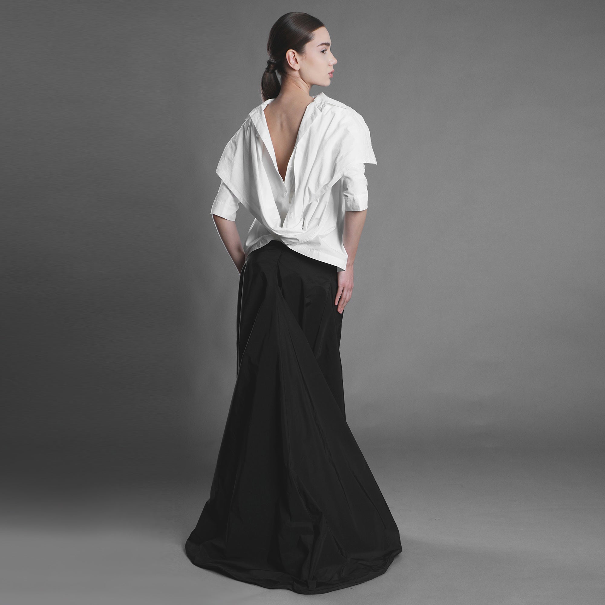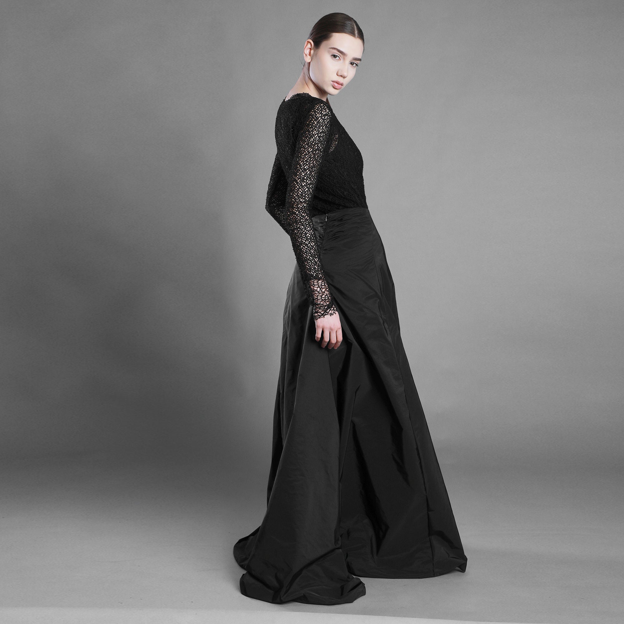 Fusta este croită din tafta și prelungită într-o trenă amplă care creează o prezență elegantă, aproape aristocratică. Se închide cu fermoar ascuns pe spate, unde materialul se încrețește și formează un volum intrigant. Este căptușită cu satin subțire pentru fluiditate și confort.