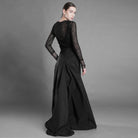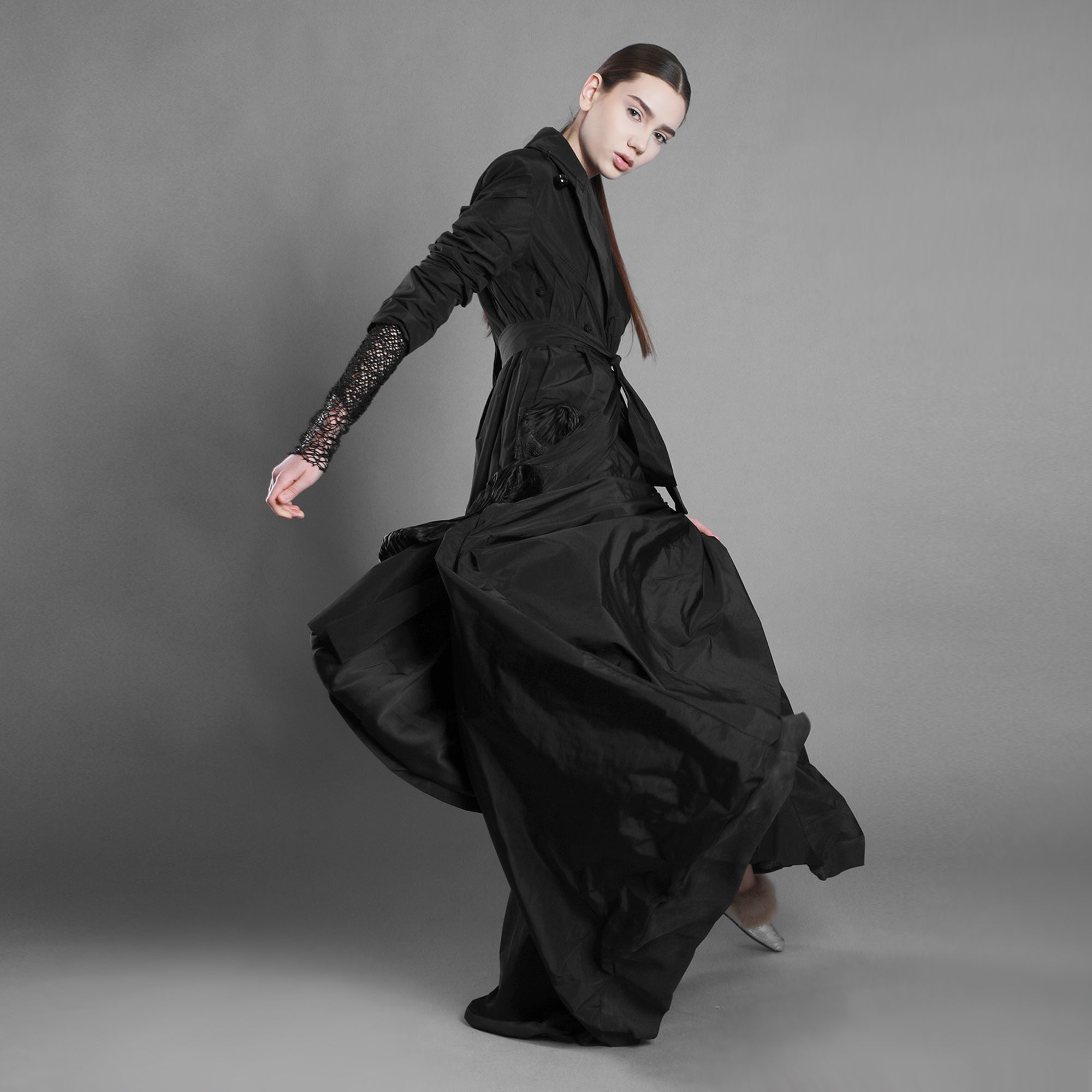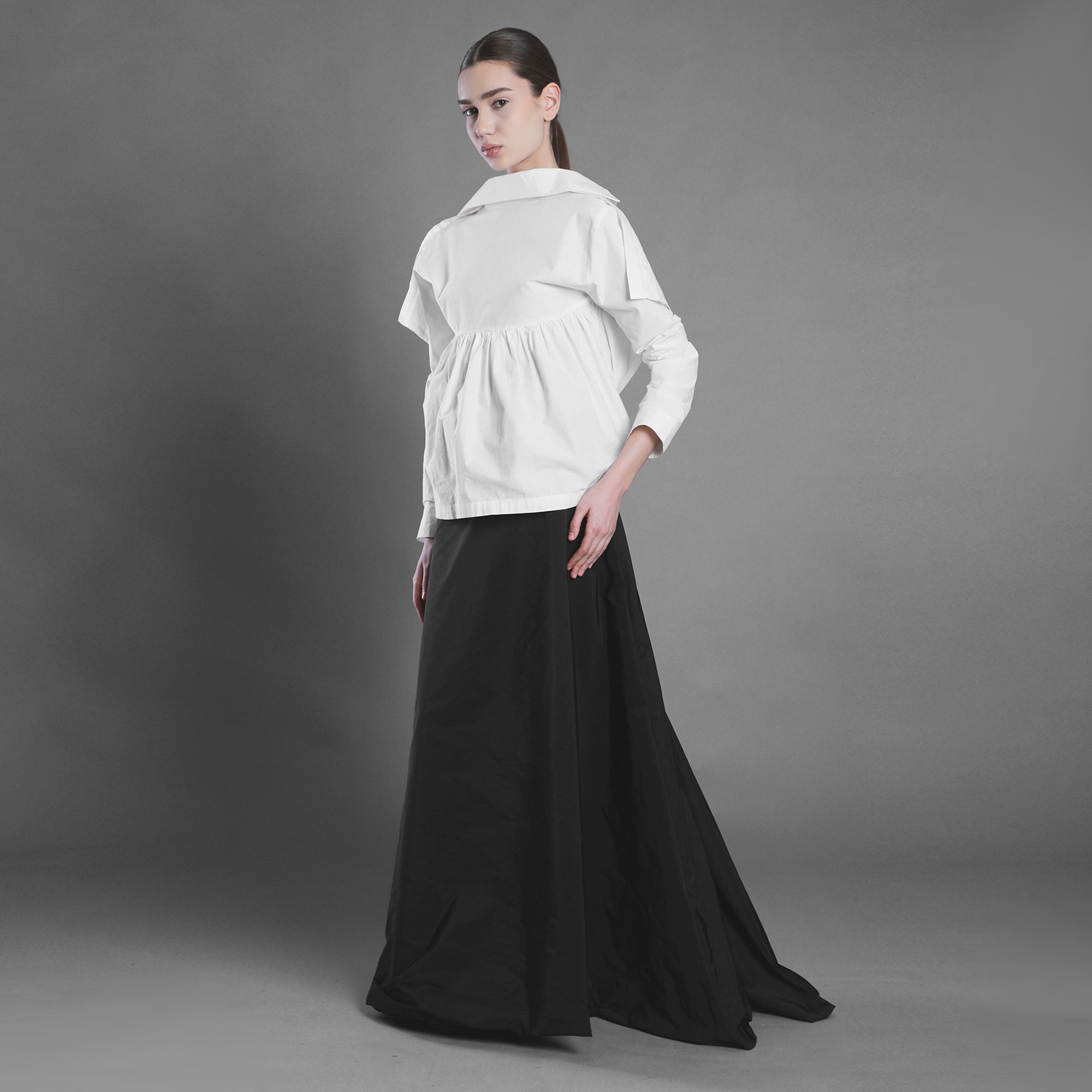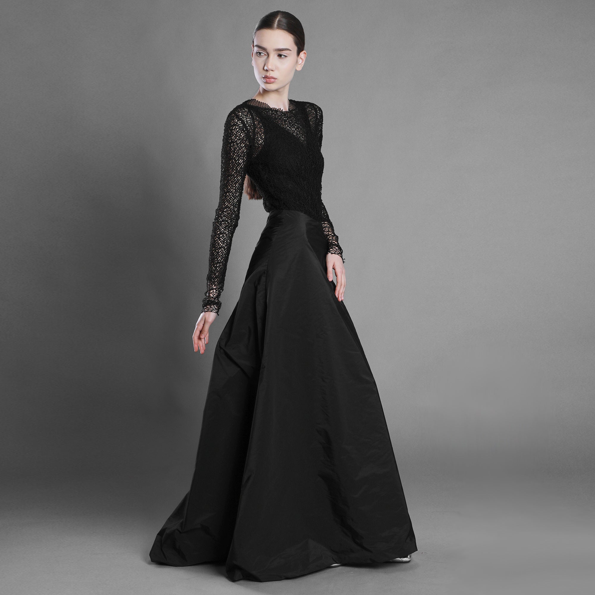 Fusta este croită din tafta și prelungită într-o trenă amplă care creează o prezență elegantă, aproape aristocratică. Se închide cu fermoar ascuns pe spate, unde materialul se încrețește și formează un volum intrigant. Este căptușită cu satin subțire pentru fluiditate și confort.