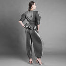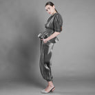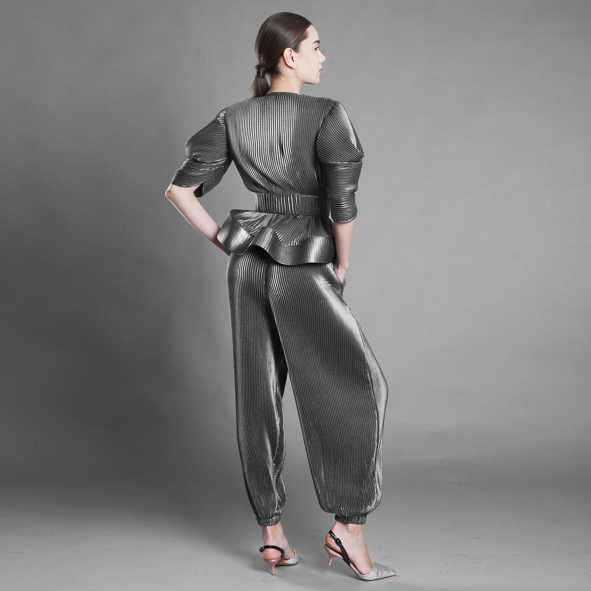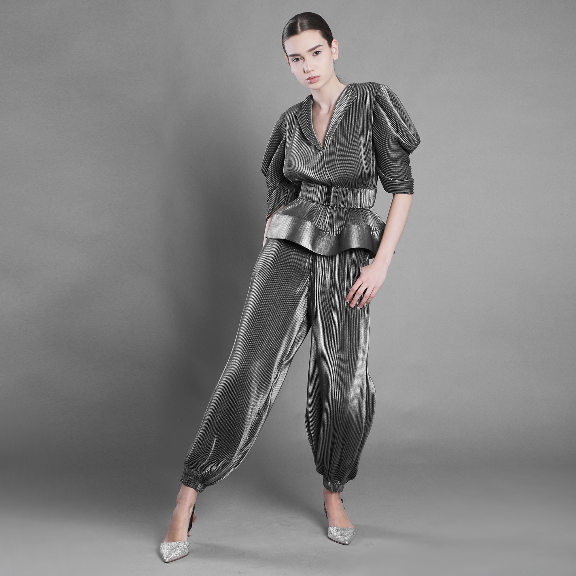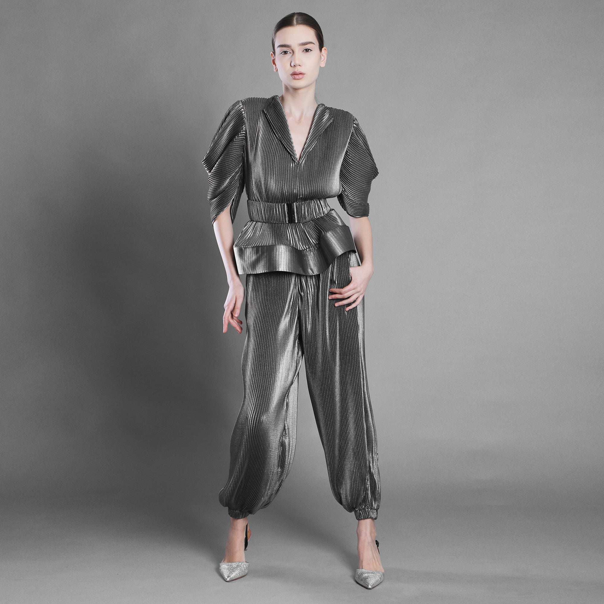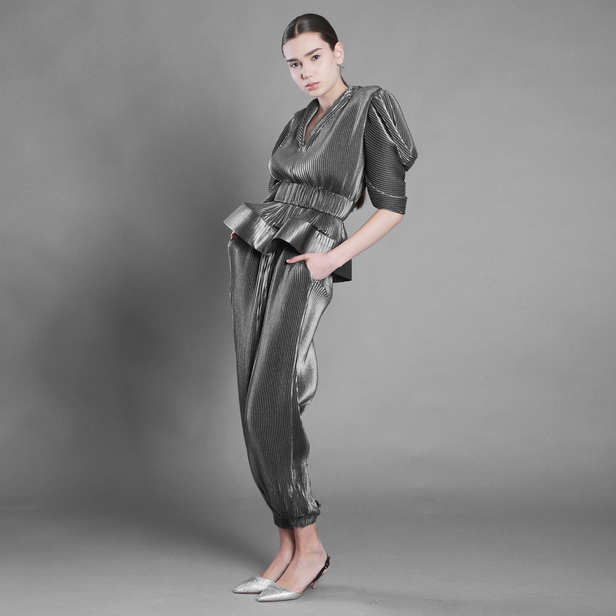 Bluza din voal argintiu plisat surprinde această mișcare. Decolteul în V deschide silueta, umerii marcați adaugă structură, iar mâneca amplă până la cot creează volum și fluiditate.