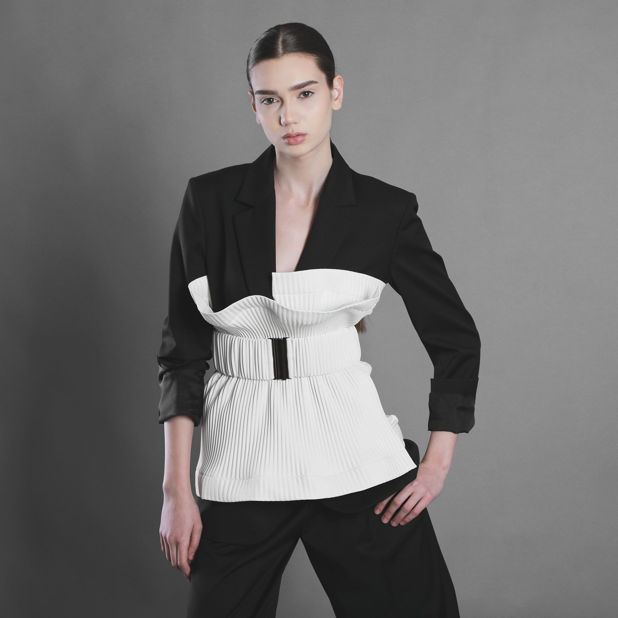 Brâul din piele eco plisată aduce structură acestei energii. Pliseurile devin mai ferme, mai arhitecturale, sculptând talia cu intenție. Mai puțină fluiditate, mai multă afirmație.